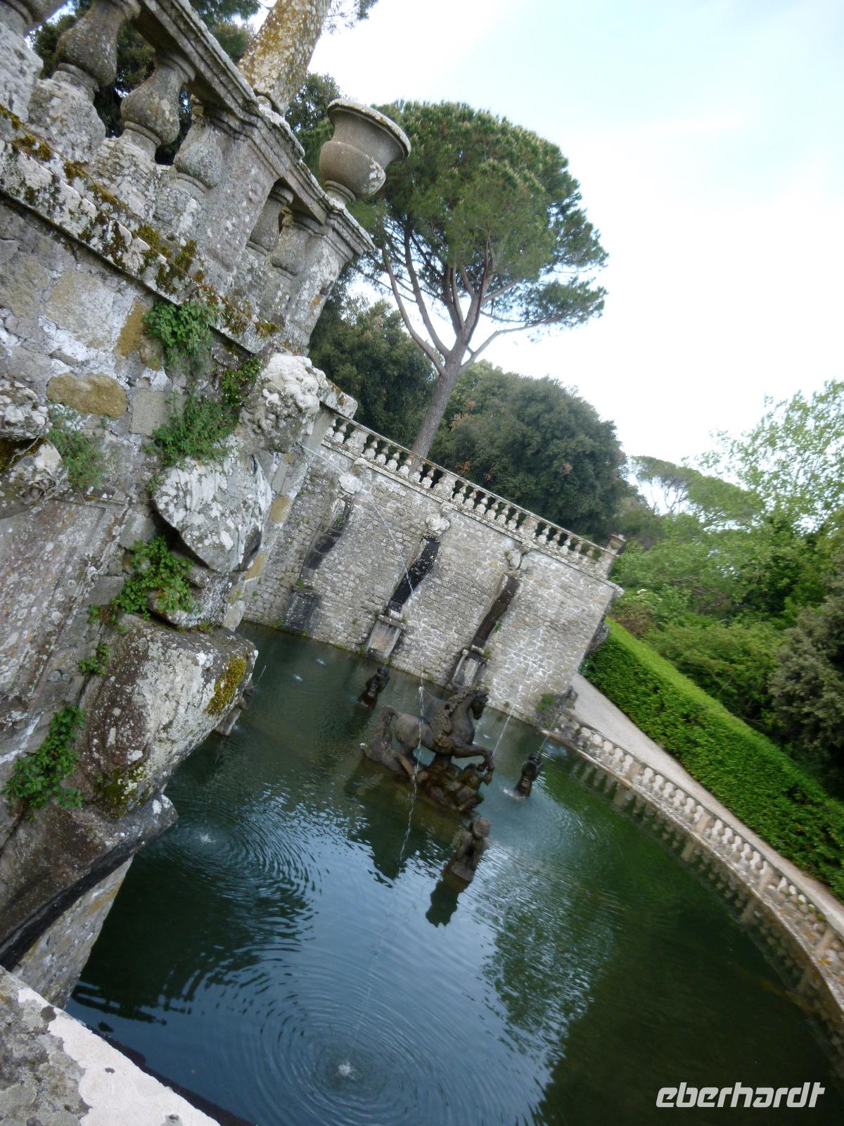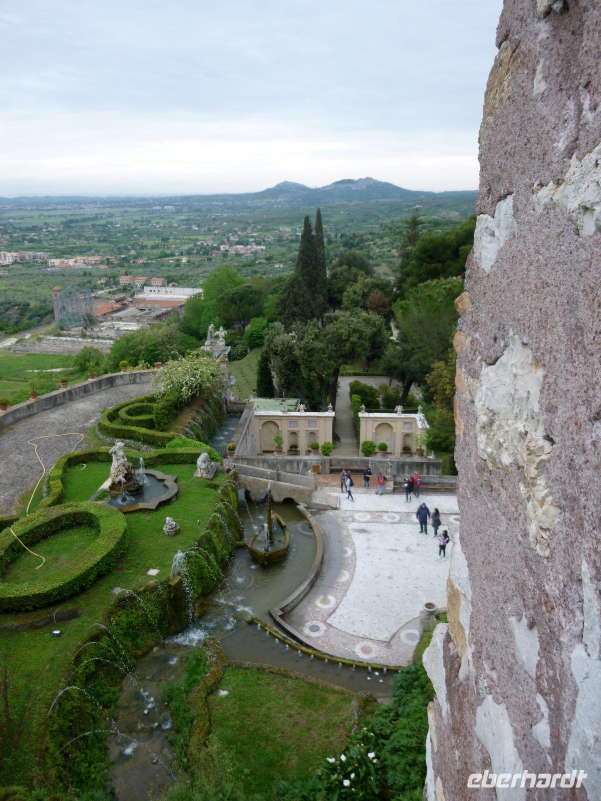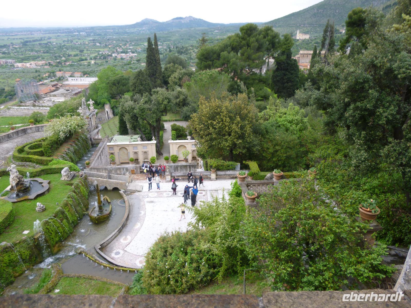Zu den prächtigsten Werken der Gartenkunst mit Wasservielfalt zählt zweifelsfrei die Villa d'Este, die wir anschließend besuchten, beauftragt vom Sohn der Lucrezia Borgia, Kardinal Ippolito II. Um ihm einen repräsentativen Sitz im zu bescheidenen ehemaligen Benediktinerkonvent zu errichten, wurden Räume umgebaut, Erdmassen bewegt, Aquädukte gebaut und Flusswasser umgeleitet.