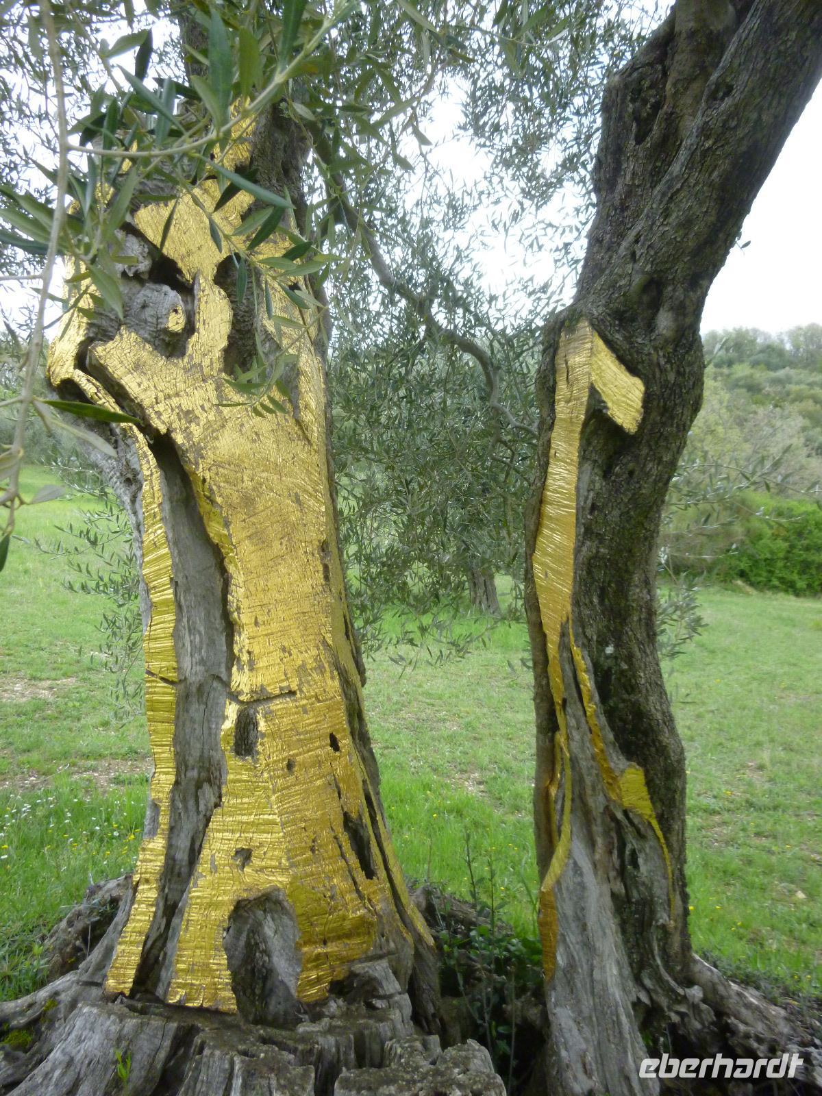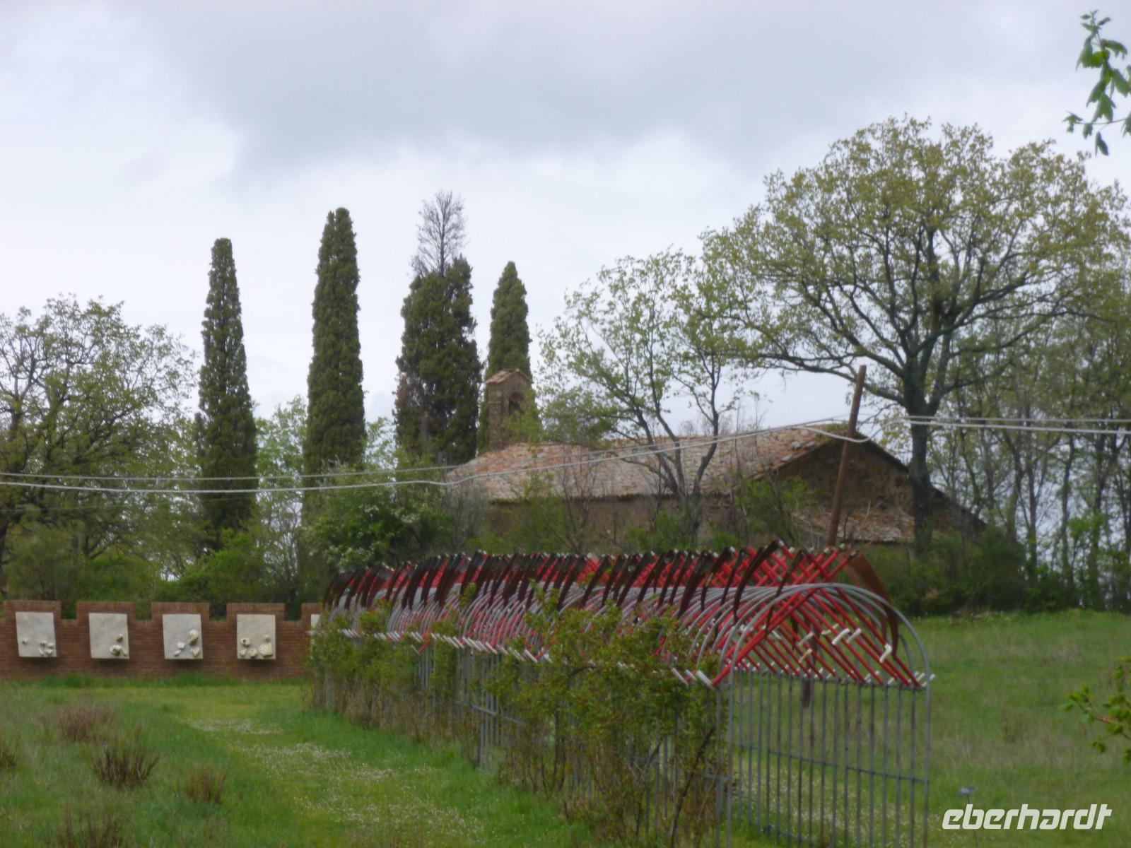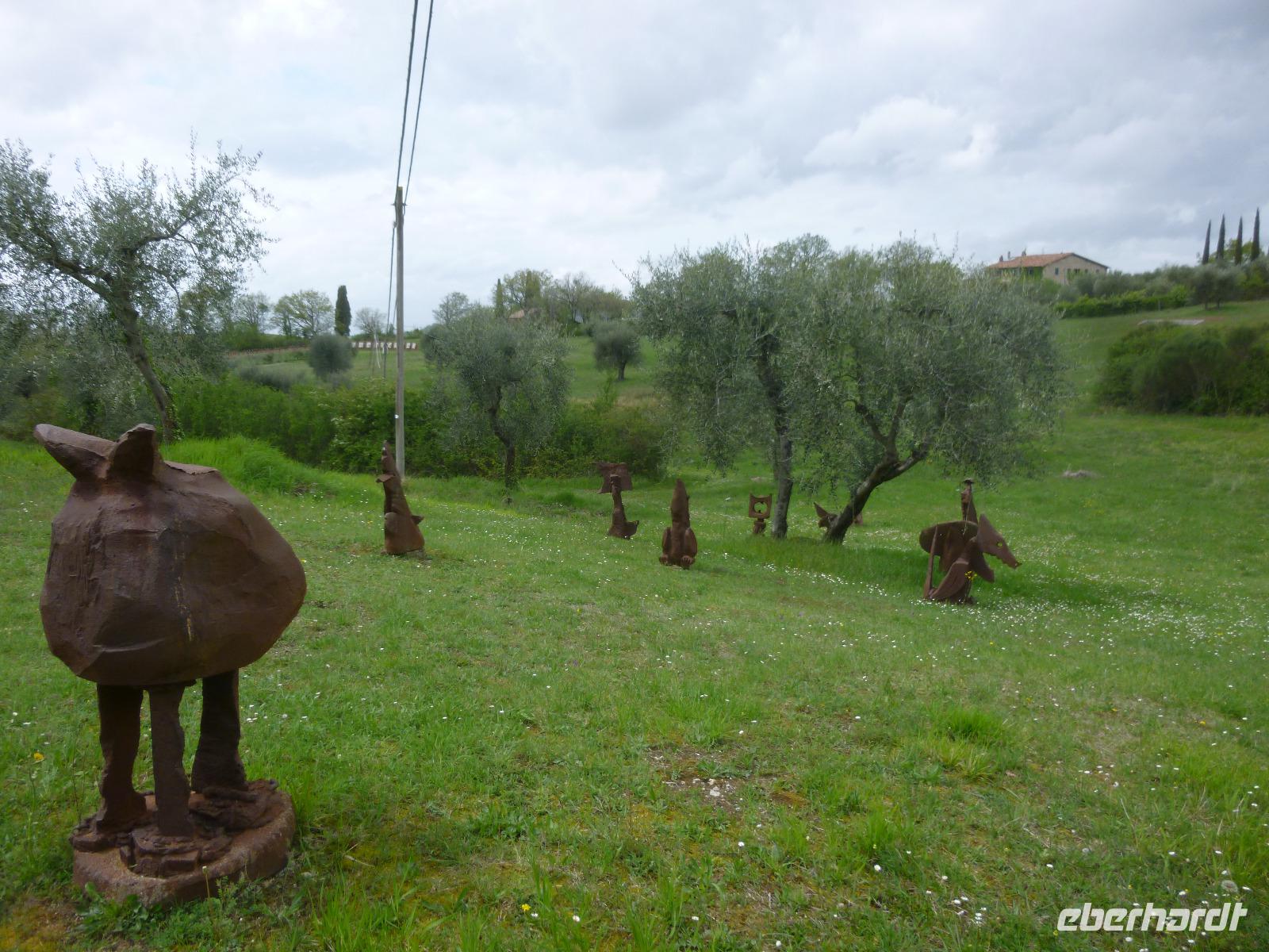 Auf diesem Landgut wurde er selbst zum „Naturhassliebenden" (Spoerri), der erstaunt und eifersüchtig das sich ständig neu Erfindende der Natur entdeckte: auf der mageren steinigen Erde wachsen auf ehemaligen Wein- und Oliventerrassen jetzt einheimische Kultur- und Wild-Pflanzen gedeihen wie: der Echte Ölbaum „Olivastra Seggianese", der Echte Wein, Himalaja Zeder, Pflaumeiche, Etruskisches Heiligenkraut, Lavendel, Judasbaum, Pfriemenginster, Zistrose, Kakipflaume, Lorbeer, Ess-Kastanie, Wacholder, Zypresse, Gingko, Echter Feigenbaum, Chilenische Schmucktanne. Trotz Regens am Vormittag ließen wir uns die intensive Entdeckung des Gartens auf den Spuren Spoerris und seiner Freund*innen nicht nehmen.