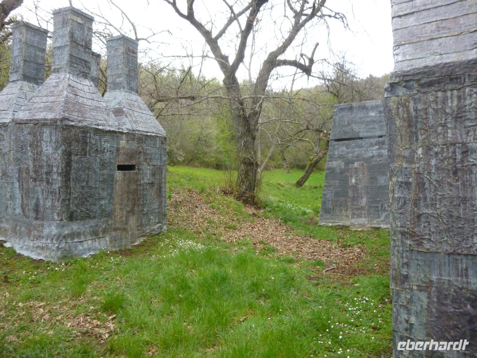 Gern wechselt der Künstler in seinen Werken die Perspektive und Größe, kombiniert Gegenstände auf ungewöhnliche Weise in seinen Werken, die über die Hälfte im Garten ausmachen. So irritiert er unsere Sehgewohnheiten.