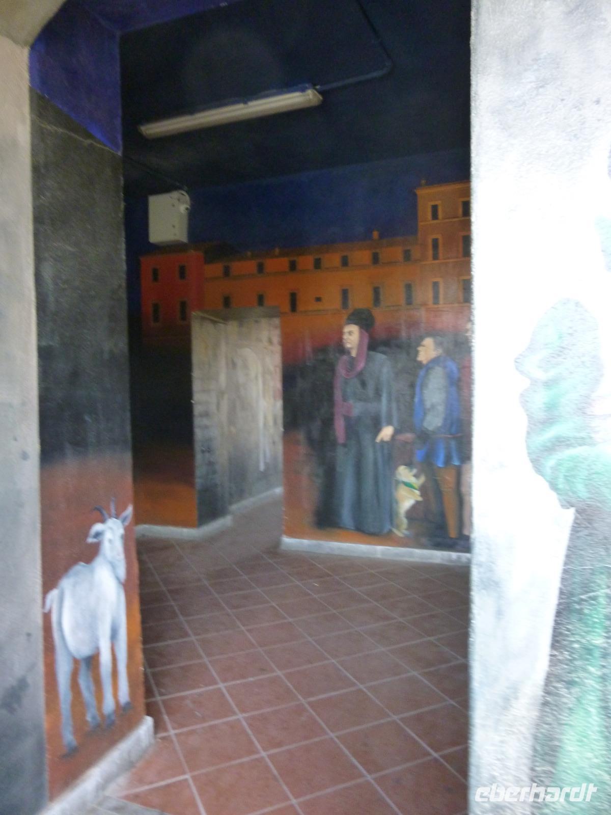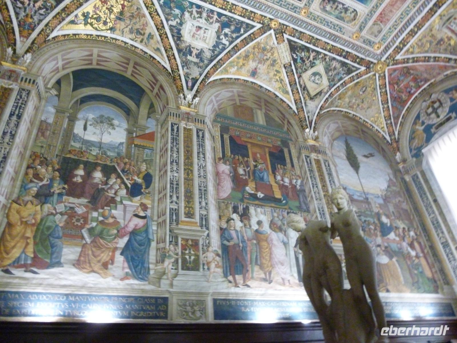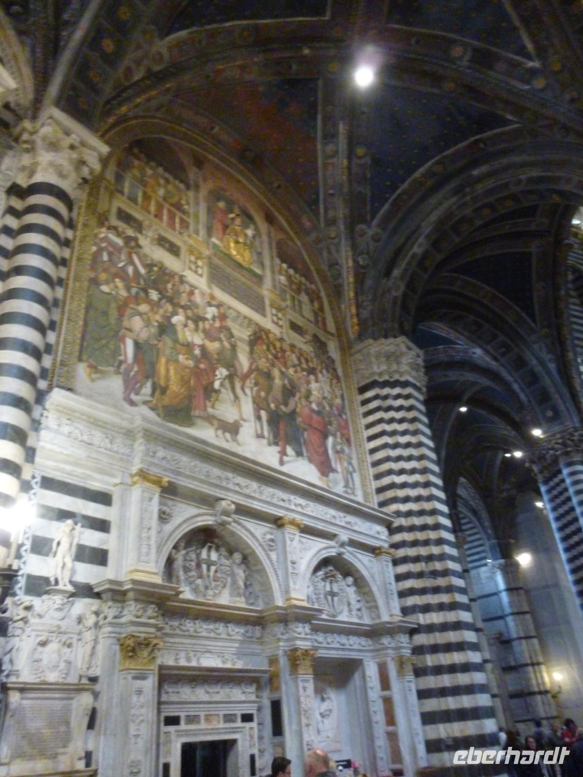 Siena am Franken-Pilgerweg mit seinen starken Frauen (Katharina von Siena und Gianna Nanini), den gotischen Malern, dem Palio-Pferdewettkampf vermittelte uns intensiv Luise auf dem Rundgang durch das mittelalterliche Siena: wir gelangten durch enge Gassen über hügelige Anlagen auf prächtige Plätze mit elegantem Flair zu den Finanz-, Macht- und Glaubensbastionen dieser gotischen Stadt. Höhepunkt war nach dem Treff auf dem Campo der Besuch des schwarz-weiß gestreiften Doms auf einem der drei Hügel mit all seiner Pracht.