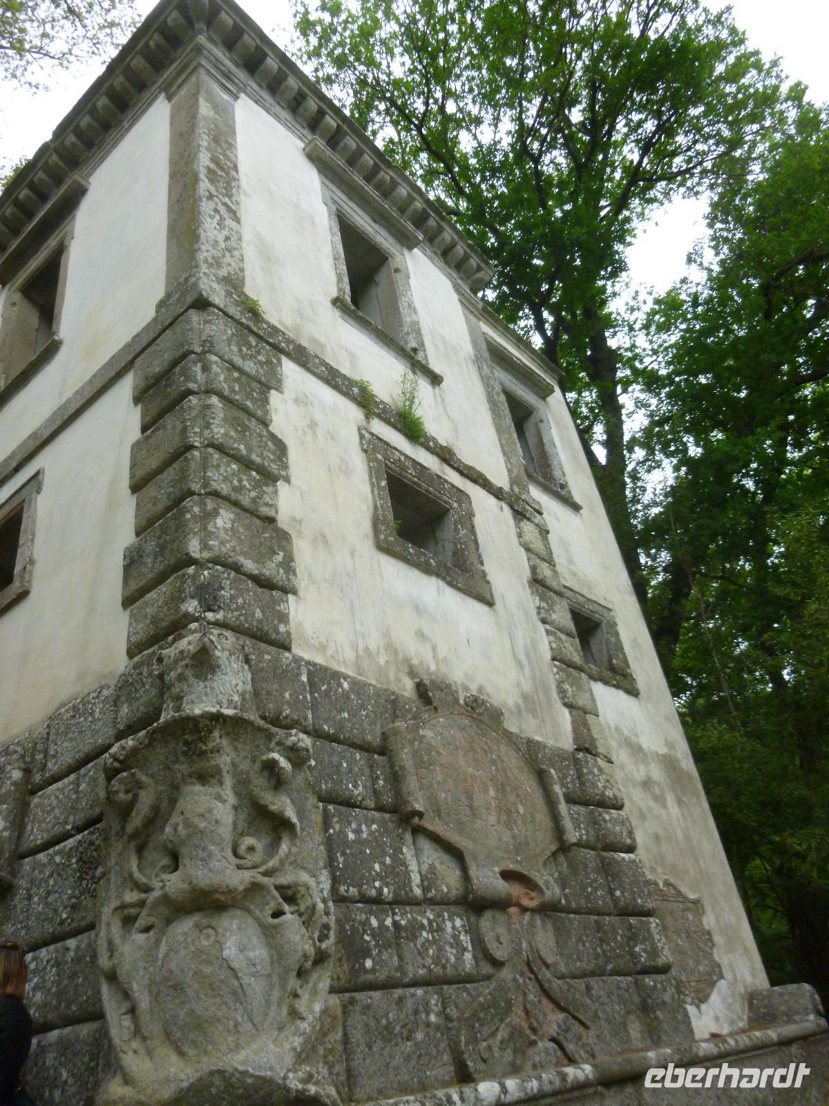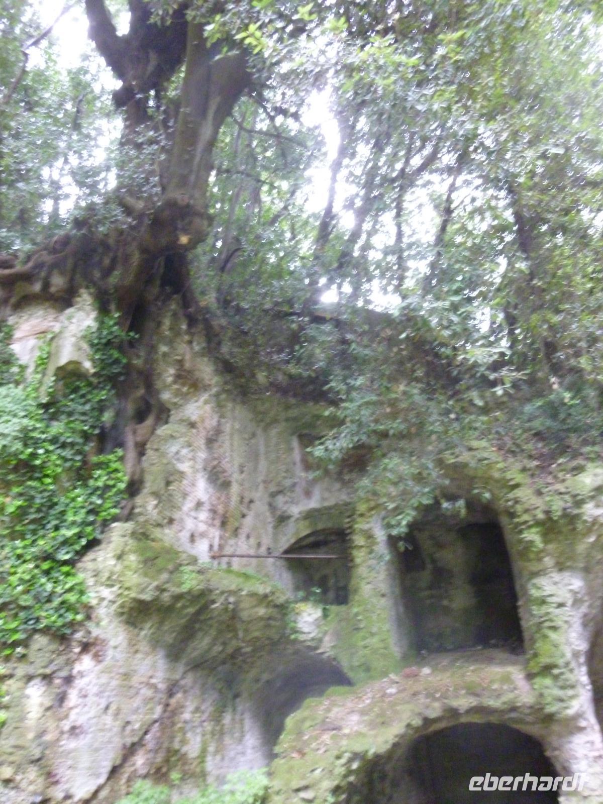 Am Lebensende ließ Orsini noch die phantastischen Garten-Ungeheurer in bunten Farben bemalen. Das schiefe Haus im Bosco, bei dessen Betreten und Verlassen man sich als „ver-rückt" empfindet und einstiger Garten-Eingang, widmete er einem befreundetem Kardinal.