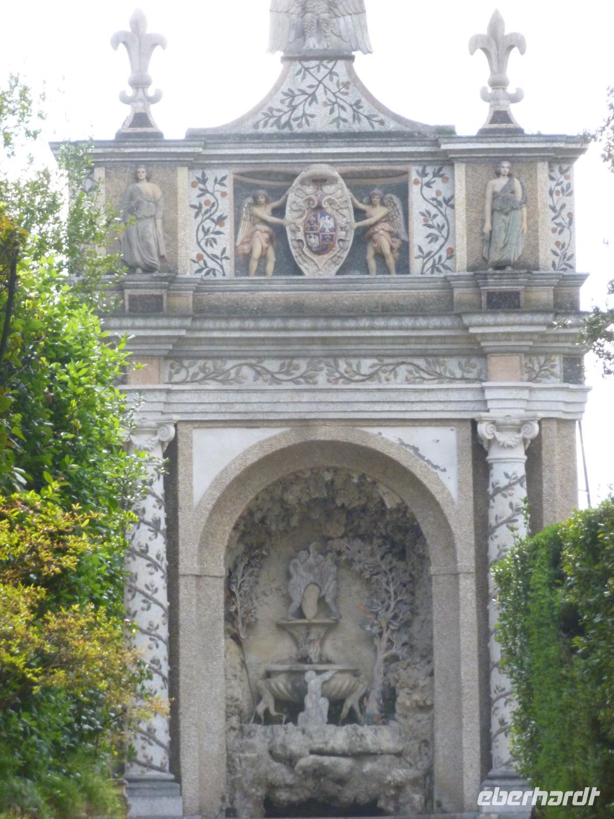 „In einem dieser Wassertheater findet sich ein Atlas", schrieb John Evelyn in sein Tagebuch am 4./5. Mai 1645, „der den Wasserstrom in unglaubliche Höhe emporschleudert und ein weiteres Monstrum, das mit einem Horn ein fürchterliches Brüllen erzeugt, „vor allem aber die Darstellung eines Sturms ist äußerst natürlich, mit solch heftigem Regen, Wind und Donner, als wäre man selbst in einem wilden Orkan."