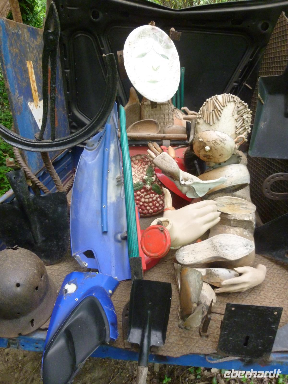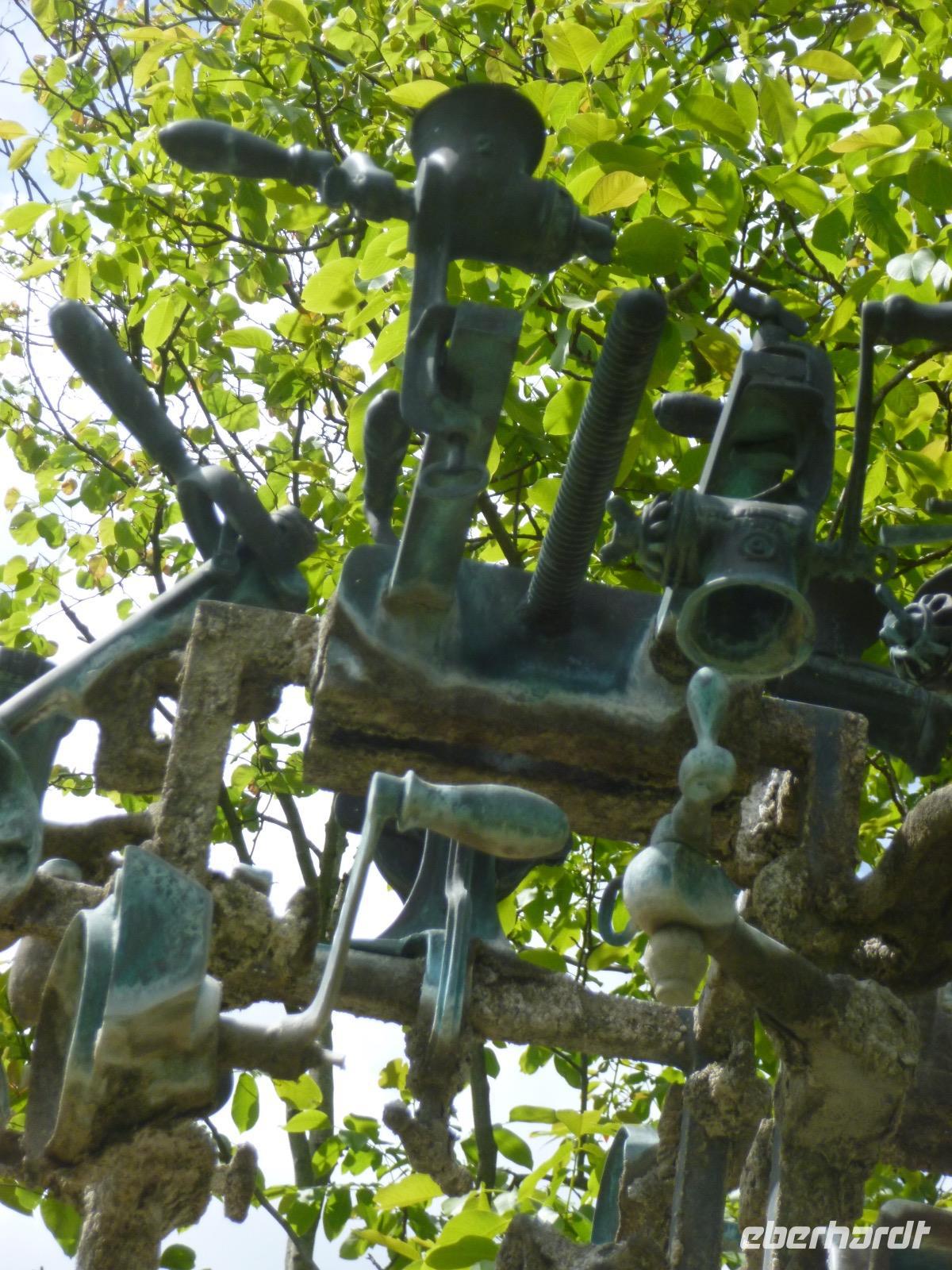 Spoerri sammelte vorübergehend - für seine Objektwerke. Wiederkehrende Themen in all der Formen-Vielfalt sind das Verhältnis von Weiblichem und Männlichem, von Lust und Schrecken, Stirb und Werde, Mythen und Legenden spielen eine Rolle. Gern wechselt der Künstler in seinen Werken die Perspektive und Größe, kombiniert Gegenstände auf ungewöhnliche Weise in seinen Werken, die über die Hälfte im Garten ausmachen. So irritiert er unsere Sehgewohnheiten.