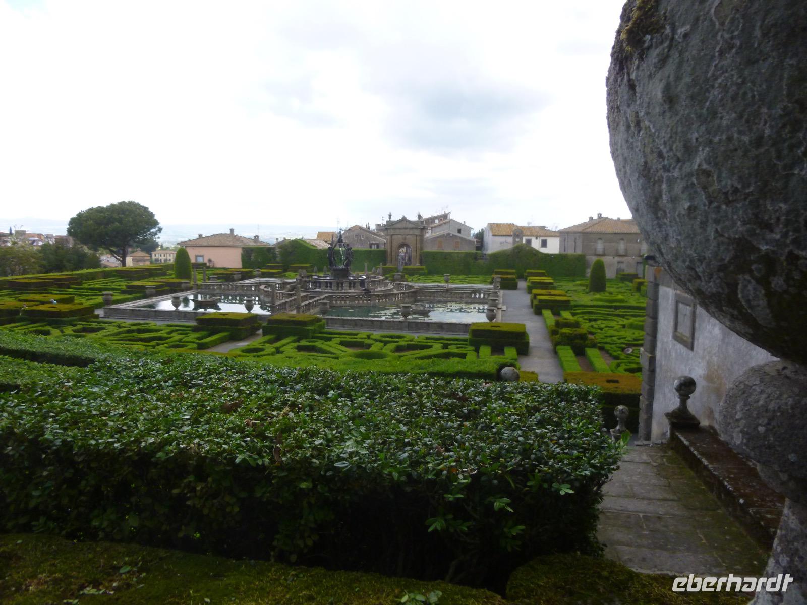 Der Garten hat sein Aussehen über 400 Jahre erhalten, wie uns eine gemalte Vedute im Casino des Kardinals Gambara zeigte. Er beauftragte den auch in Rom hoch geschätzten Architekten Giacomo Barozzi da Vignola, der kurz zuvor die 15 km entfernte glanzvolle Sommer-Villa Farnese in Caprarola für Allessandro Farnes erbaut hatte.