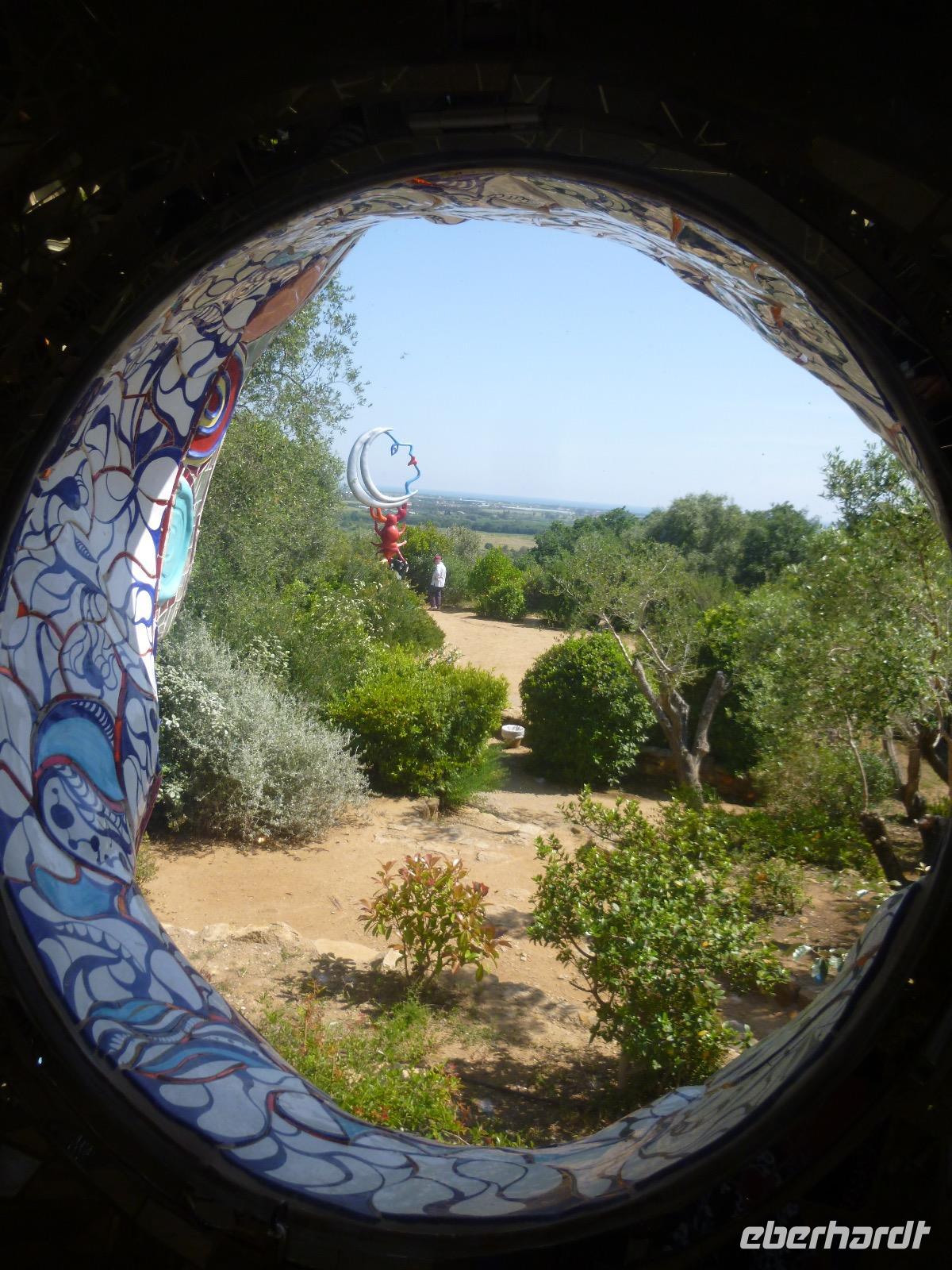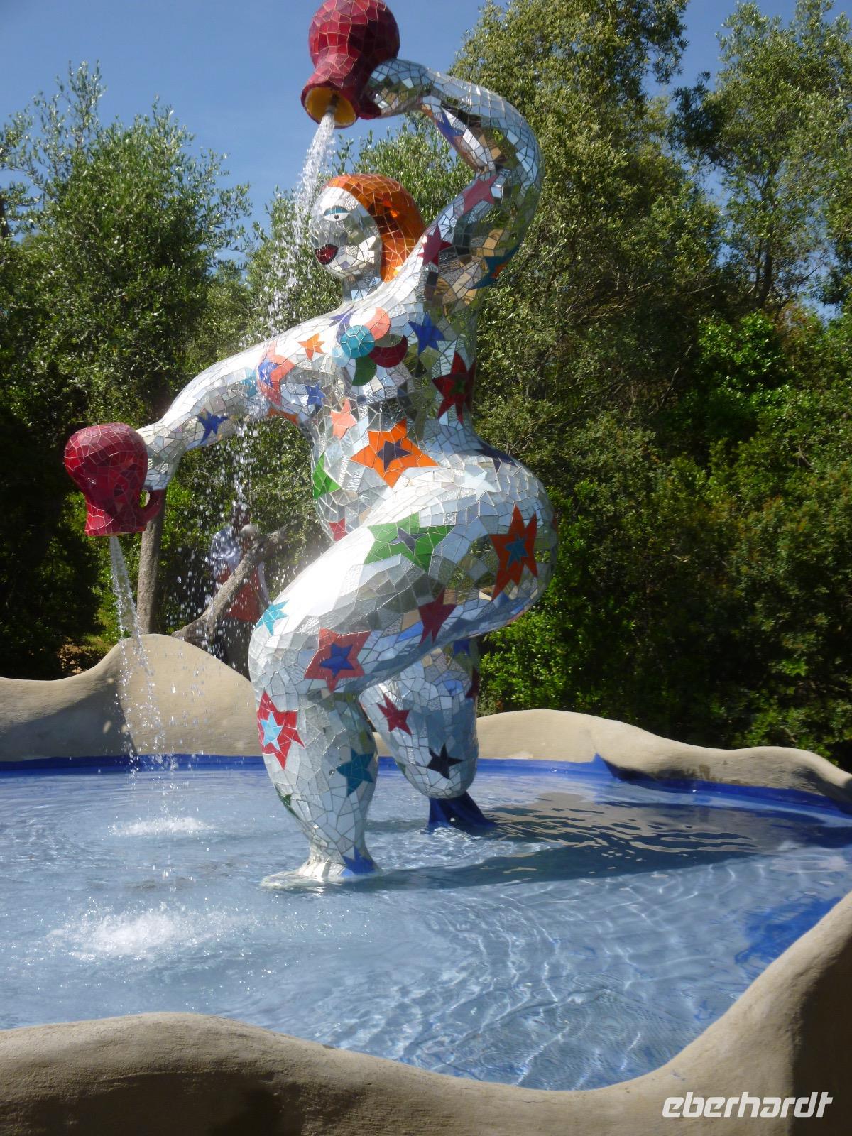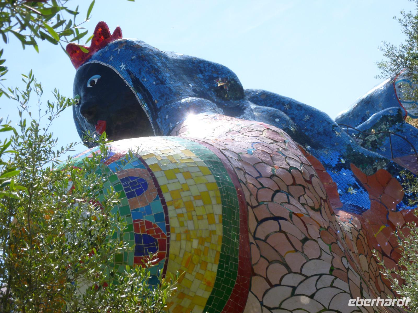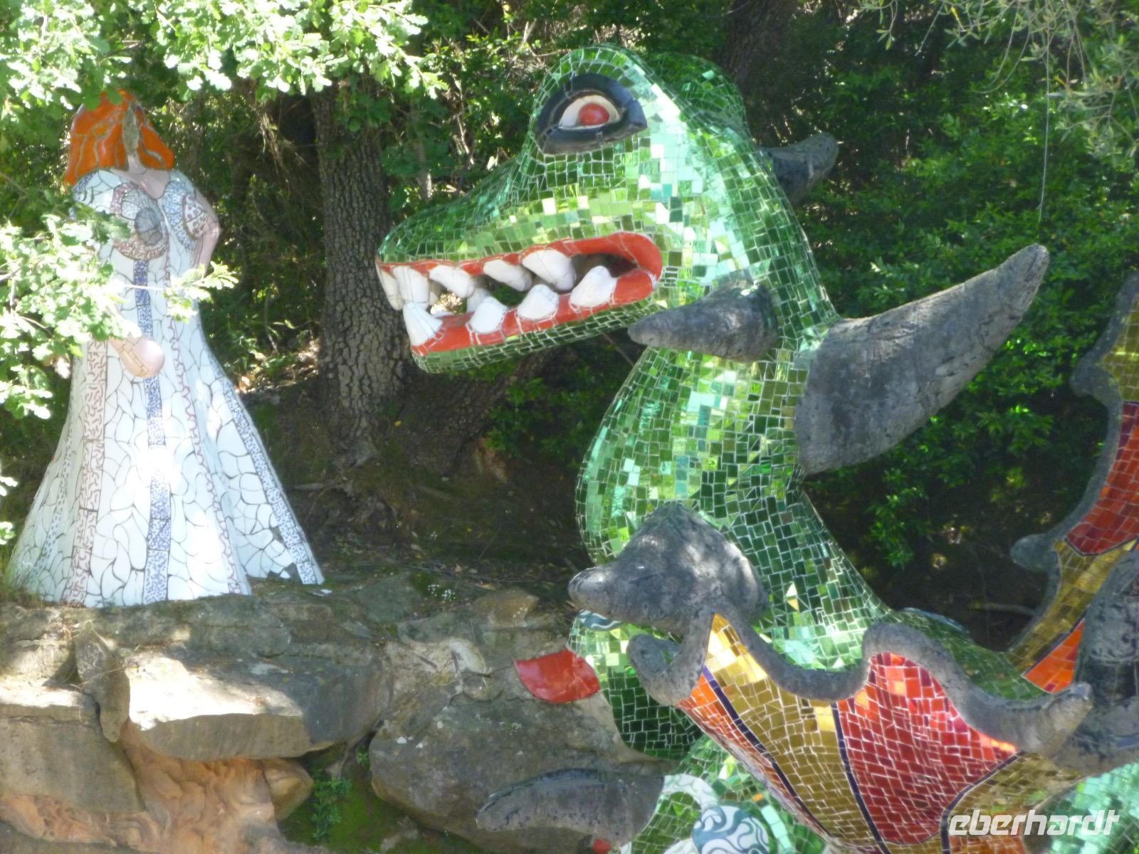 Von Orsinis Höllenschlund zu Nikis Wasserschlund reisten wir nur eine kurze Weile und betraten durch die Mauer von Mario Botta erwartungsvoll das Reich der zweiundzwanzig teilweise begeh- und bewohnbaren Monumentalfiguren des Tarot-Kartenspiels: „Sollte unser Leben ein Kartenspiel sein, so werden wir geboren, ohne die Regeln zu kennen", meinte Niki dazu. Und weiter: „Dieser Garten wurde unter großen Schwierigkeiten, mit Liebe, leidenschaftlicher Begeisterung, Besessenheit und vor allem mit Glauben gemacht. Nichts und niemand hätte mich dabei aufhalten können". 17 Lebensjahre widmete sie mit ihrem Gefährten Jean und ihrem Team dem Bau des Tarotgartens im küstennahen etruskischen Süden der Toskana.