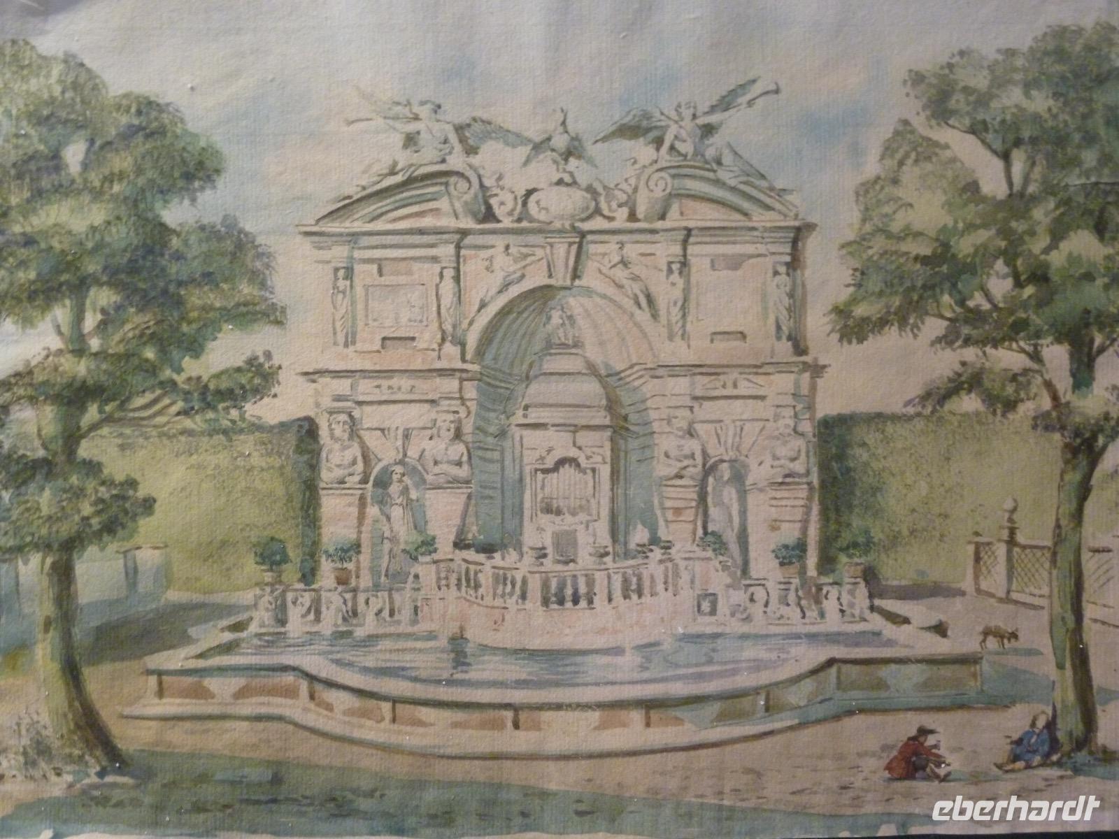 Wir bewunderten den Villenkomplex beider Casinos am Hauptparterre mit zentralem Brunnen inmitten der Bassins und ornamentaler Beete und wanderten dann entlang der zentralen Wasserachse von einem Brunnen zum nächsten, vom Lichterbrunnen über den Fluss- und Delfin-bis zum Sintflutbrunnen auf der obersten Terrasse, bei der Besucher ursprünglich ihren Rundgang begannen.