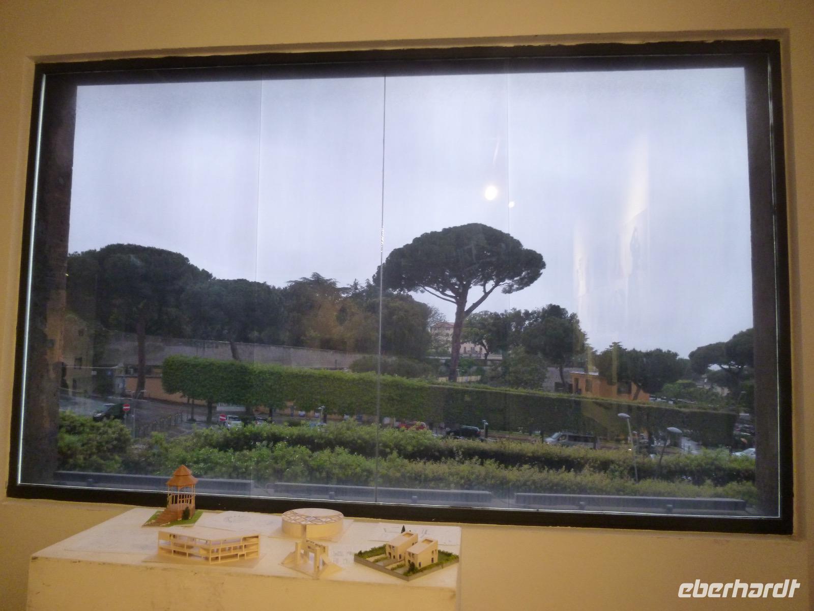 Gandolfo der Garten für Besucher während eines geführten Rundgangs noch immer zugänglich (wie auch der Sommerpalast). So spazierten wir bei Regen auf den Wegen der Päpste und ihrer zahlreichen Gärtner hinter unserem auf einer Mundharmonika musizierendem Führer (den wir zuvor auf dem Parkplatz Beethovens Siebente hörend in einem Auto mit ca. 6 Regenschirmen und einem Seitenspiegel trafen) über das ehemalige Sommerareal des Kaisers Domitian. Betrachteten dessen kleines Theater und antike Spolien, schlenderten zu den Ruinen seines Kryptoportikus und entdeckten schöne Bepflanzungen auf mehreren Terrassen vom Marienheiligtum zum Belvedere, zum Magnoliengarten, zur Viale delle Rose und delle Erbe, zu den „Quattro Labirinti" und zum Arboretum, wo auch der biblische Zederbaum nicht fehlen durfte.