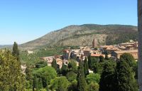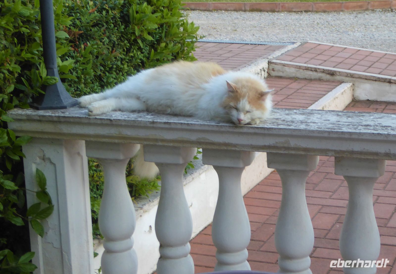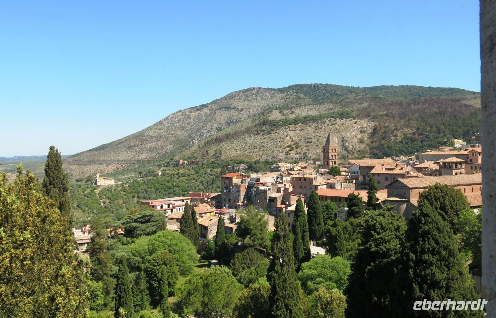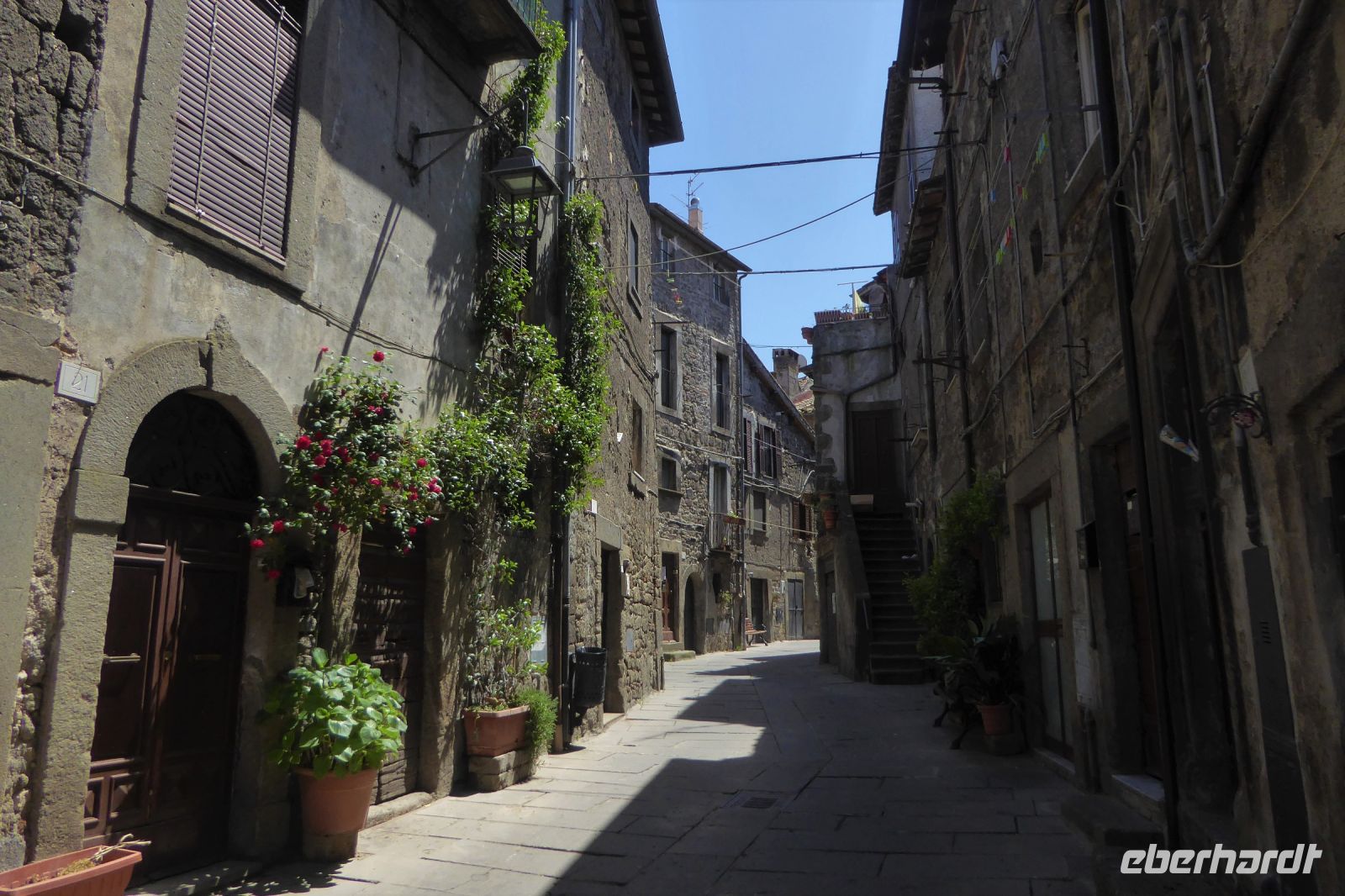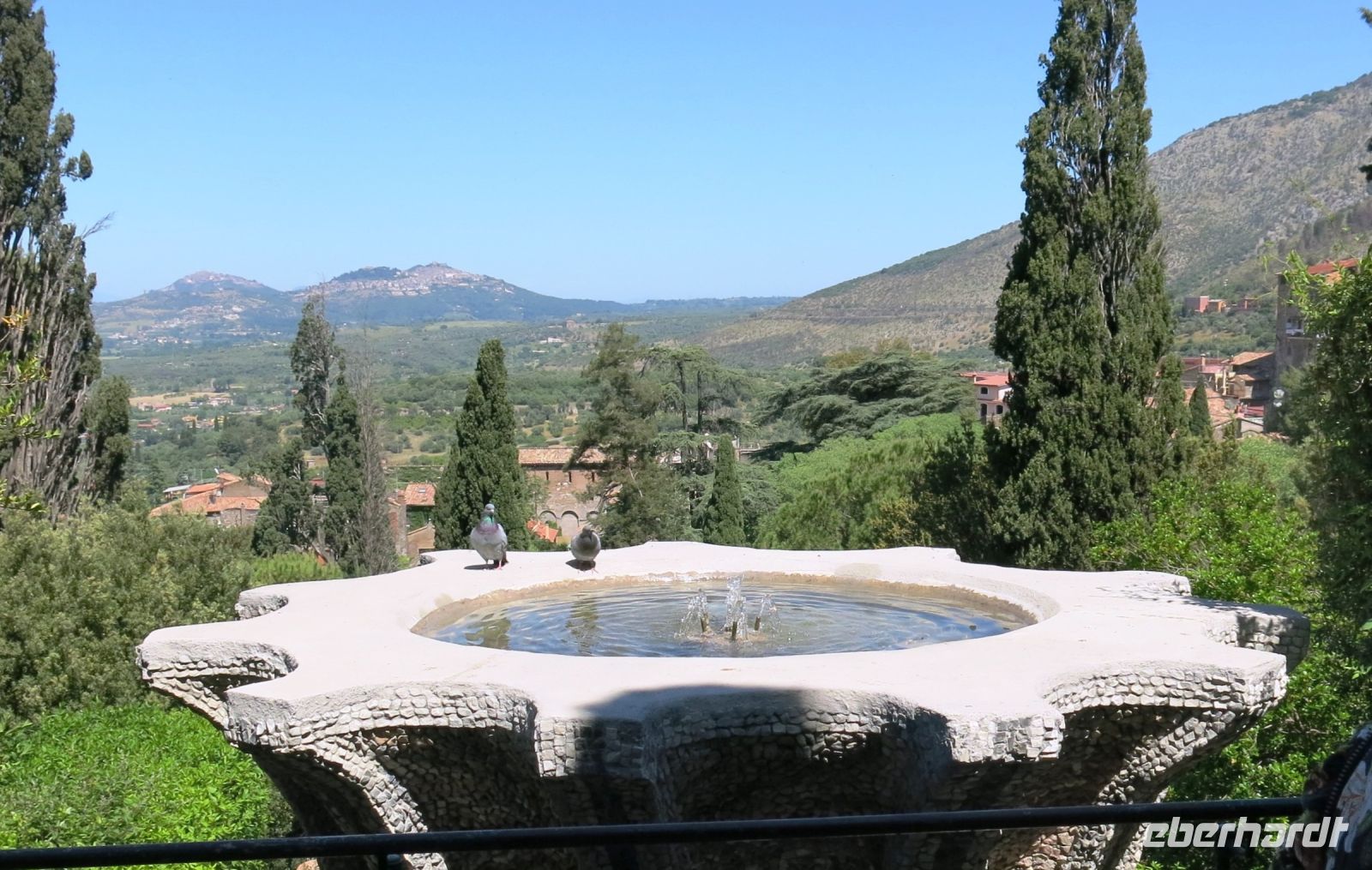 Vor unserer Weiterfahrt in den Norden machten wir noch eine schöne Mittagspause in dem Ort Bagnaia, in dem die Zeit scheinbar stehen geblieben ist. Eine feste Mauer schützt den auf einem vorgeschobenen Hlügel liegenden mittelalterlichen Borgo. Durch ein Tor betritt man den winzigen Marktplatz in dessen Mitte ein großer Brunnen steht, zwei Kirchen flankieren den Platz. Enge Gassen führen in den Ort, der wie eine Kulisse aus einem Mantel- 5und Degen Film wirkt.