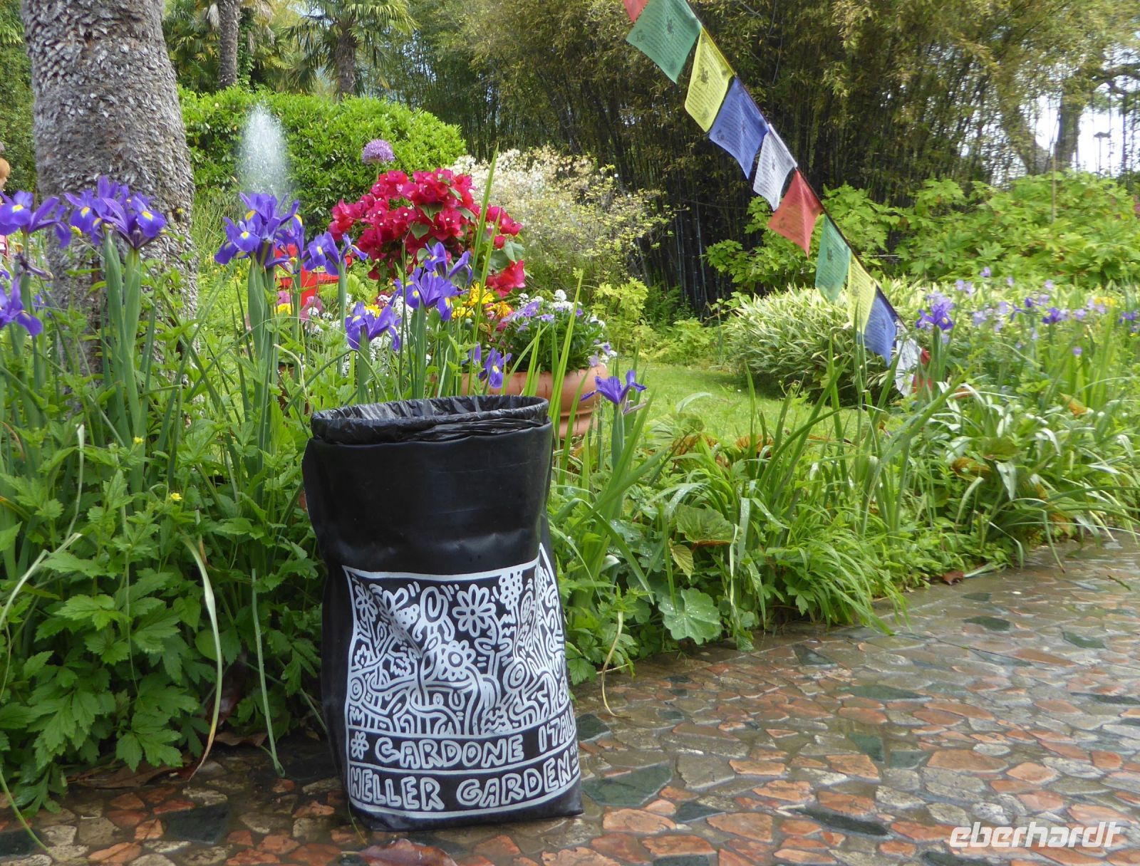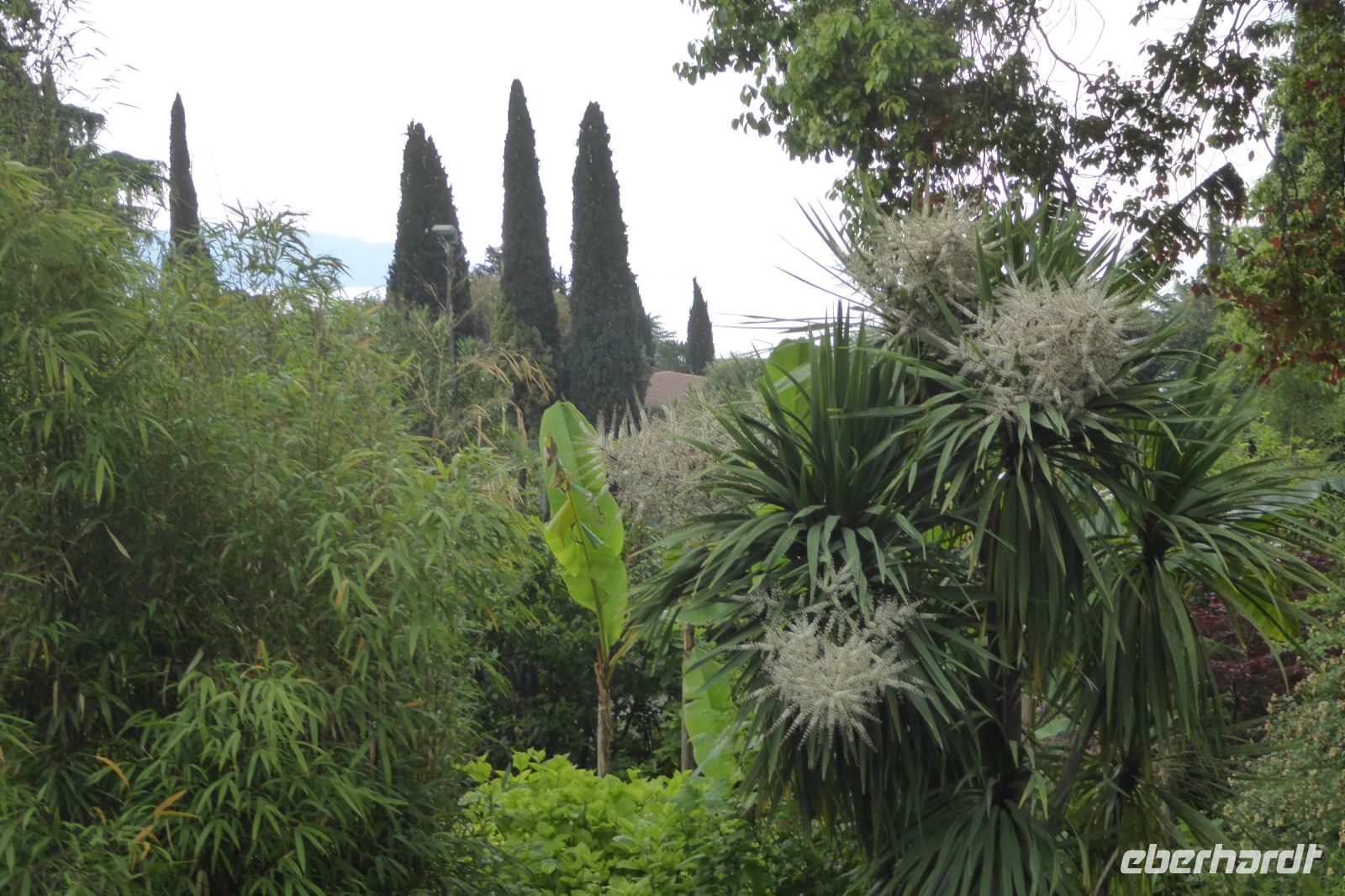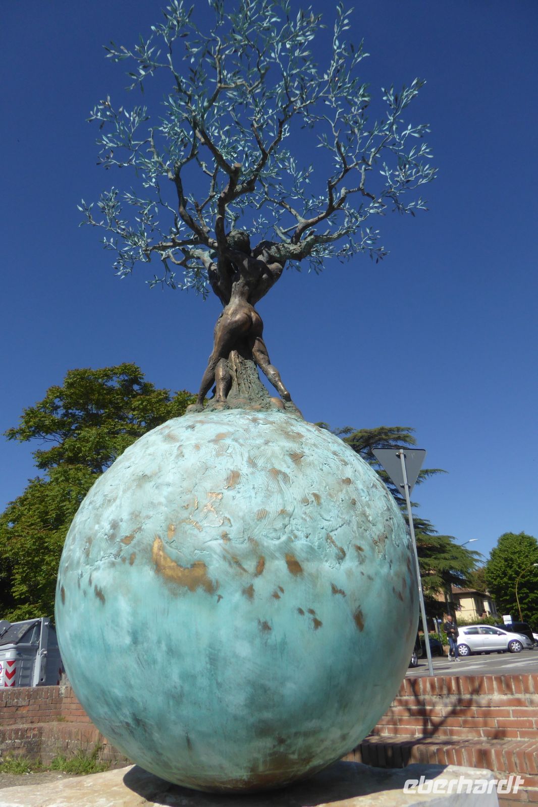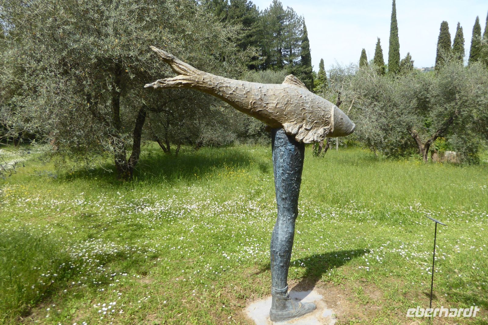 Nach einem guten Frühstück starteten wir gestärkt in den Tag und freuten uns auf kommende Ereignisse. Heute stand der botanische Garten des Multimediakünstlers André Heller in Gardone Riviera auf dem Programm. Diese Anlage ist vor allem für ihre Sammlung floraler Schätze aus Afrika, Südamerika, Asien, Europa und Australien bekannt- und für die außergewöhnliche Mischung unterschiedlicher Pflanzengruppen. Meterhohe Baumfarne, Bananenstauden, Yucca, Catalpa, Ilex, Oliven- und Eichenbäume sowie Bambus gliedern den Garten. Im Baumschatten gedeihen Blütenpflanzen und ein Hain mit duftenden Rosen ist ein Fest für alle Sinne. Der Garten wurde kurz vor dem Ersten Weltkrieg von dem Zahnarzt und Botaniker Arthur Hruska angelegt. Dieser sah ihn als eine Oase des Friedens und der Harmonie, in der er Pflanzen aus aller Welt zusammensammelte und so einen Weltgarten erschuf. Die aus Quellen gespeisten Bachläufe und kleine Seen geben der Anlage Struktur und inneren Zusammenhalt. Sie bietet so einen harmonischen Ort des Genießens. Am oberen Ende des Gartens ist ein kleines Bistro integriert. Bei einem kühlen Schluck Spumante ließ sich die Philosophie dieser Gartenanlage bestens nachvollziehen: der Suche nach Ruhe und Kontemplation gepaart mit einem Genuss für alle Sinne in der Abgeschiedenheit eines vom Menschen geschaffenen geborgenen Naturraumes. Vor fünfunddreißig Jahren hat André Heller das fast vergessene Paradies wiederentdeckt und es mit eigenen Werken sowie Skulpturen zeitgenössischer Künstler wie Keith Haring, Roy Lichtenstein, Susanne Schmögner und Rudolf Hirt aufgewertet. Die insgesamt dreißig Kunstwerke drängen sich nicht in den Vordergrund, sie fügen sich harmonisch in den Garten ein und ordnen sich den „Kunstwerken“ der Natur unter, ja, heben diese sogar noch hervor!