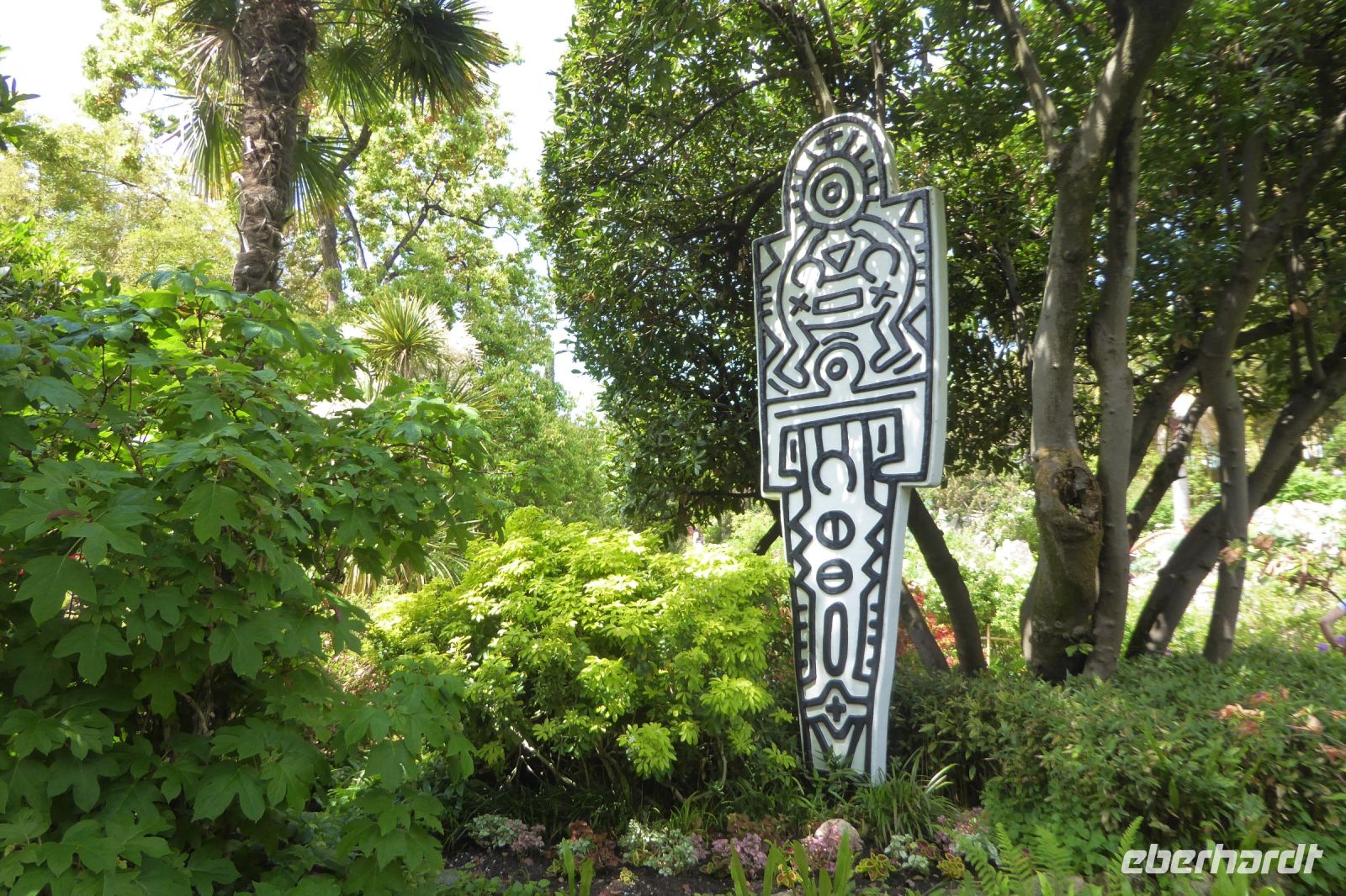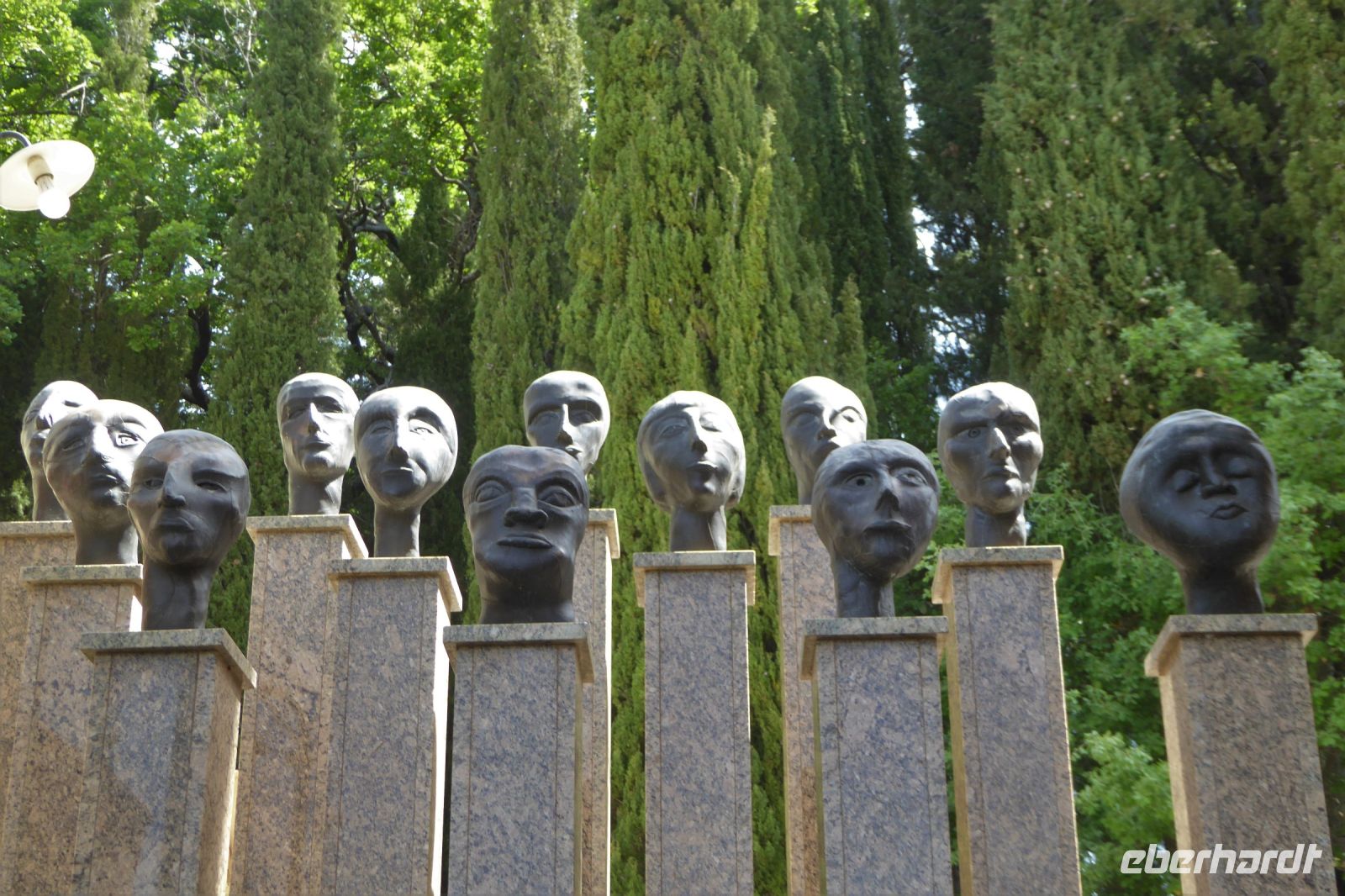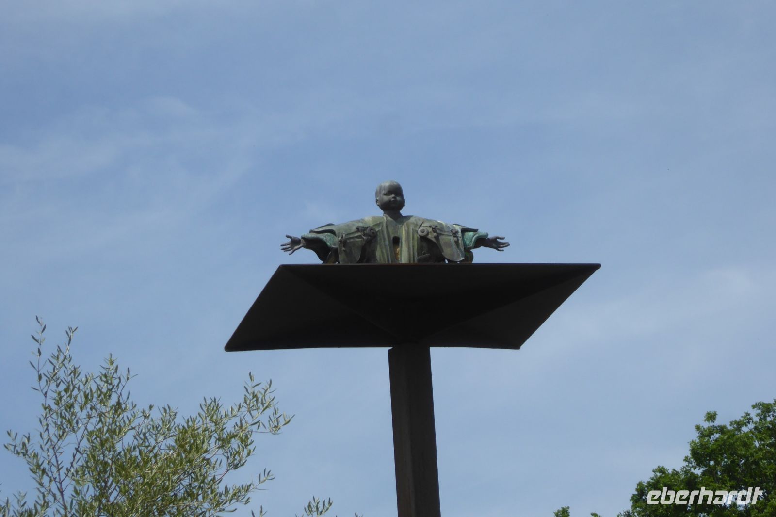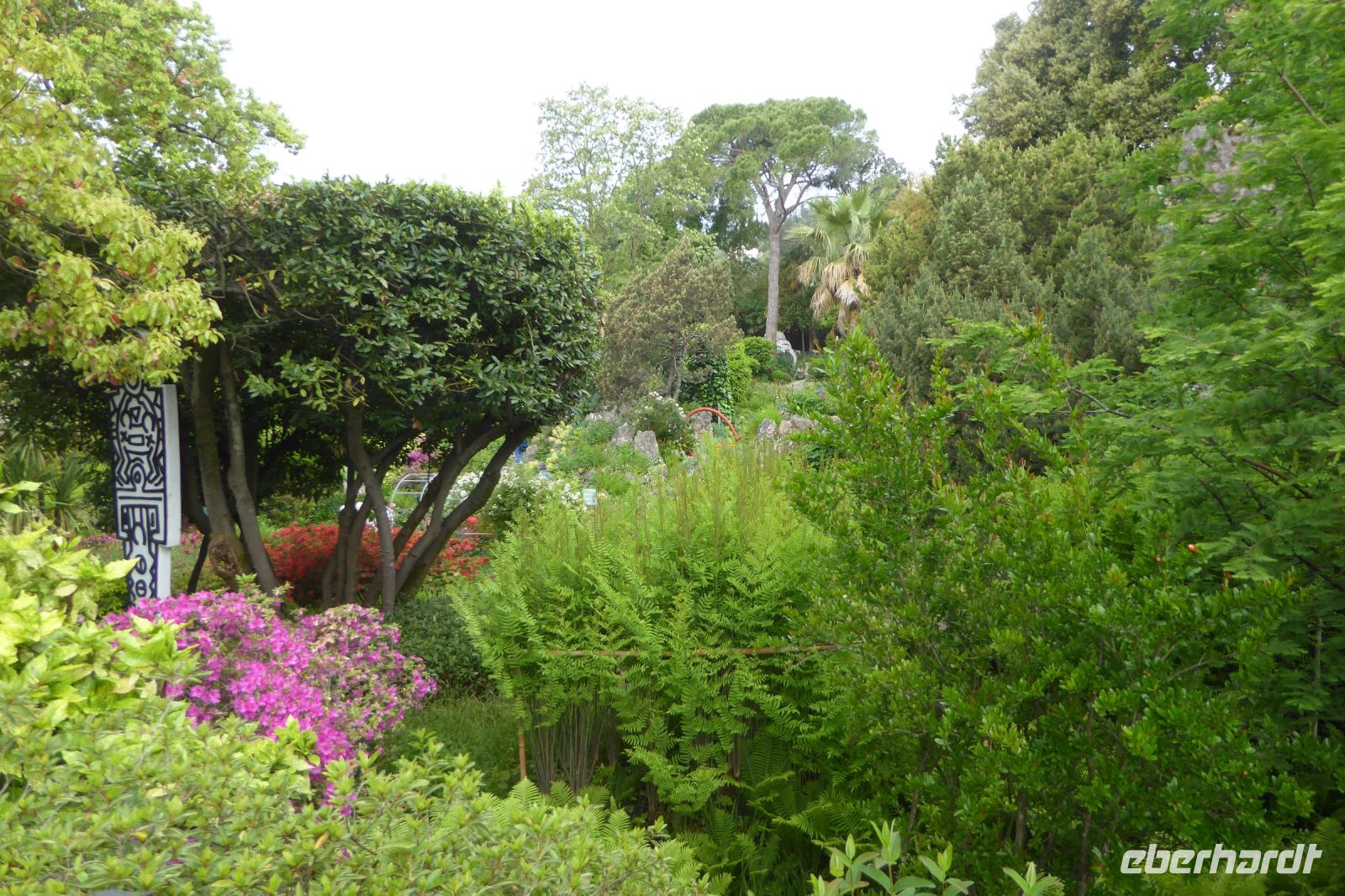 Nach einem guten Frühstück starteten wir gestärkt in den Tag und freuten uns auf kommende Ereignisse. Heute stand der botanische Garten des Multimediakünstlers André Heller in Gardone Riviera auf dem Programm. Diese Anlage ist vor allem für ihre Sammlung floraler Schätze aus Afrika, Südamerika, Asien, Europa und Australien bekannt- und für die außergewöhnliche Mischung unterschiedlicher Pflanzengruppen. Meterhohe Baumfarne, Bananenstauden, Yucca, Catalpa, Ilex, Oliven- und Eichenbäume sowie Bambus gliedern den Garten. Im Baumschatten gedeihen Blütenpflanzen und ein Hain mit duftenden Rosen ist ein Fest für alle Sinne. Der Garten wurde kurz vor dem Ersten Weltkrieg von dem Zahnarzt und Botaniker Arthur Hruska angelegt. Dieser sah ihn als eine Oase des Friedens und der Harmonie, in der er Pflanzen aus aller Welt zusammensammelte und so einen Weltgarten erschuf. Die aus Quellen gespeisten Bachläufe und kleine Seen geben der Anlage Struktur und inneren Zusammenhalt. Sie bietet so einen harmonischen Ort des Genießens. Am oberen Ende des Gartens ist ein kleines Bistro integriert. Bei einem kühlen Schluck Spumante ließ sich die Philosophie dieser Gartenanlage bestens nachvollziehen: der Suche nach Ruhe und Kontemplation gepaart mit einem Genuss für alle Sinne in der Abgeschiedenheit eines vom Menschen geschaffenen geborgenen Naturraumes. Vor fünfunddreißig Jahren hat André Heller das fast vergessene Paradies wiederentdeckt und es mit eigenen Werken sowie Skulpturen zeitgenössischer Künstler wie Keith Haring, Roy Lichtenstein, Susanne Schmögner und Rudolf Hirt aufgewertet. Die insgesamt dreißig Kunstwerke drängen sich nicht in den Vordergrund, sie fügen sich harmonisch in den Garten ein und ordnen sich den „Kunstwerken“ der Natur unter, ja, heben diese sogar noch hervor!
