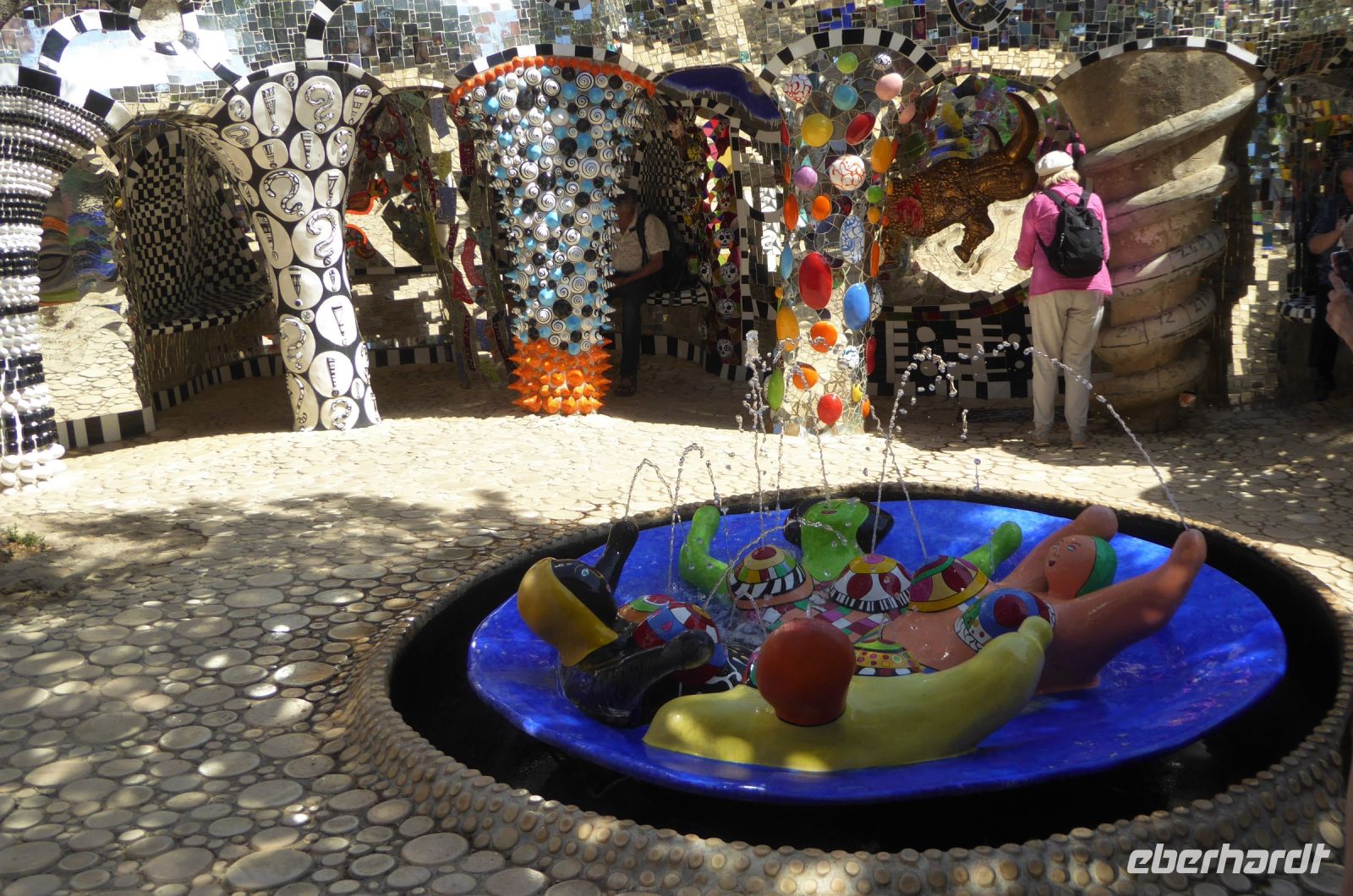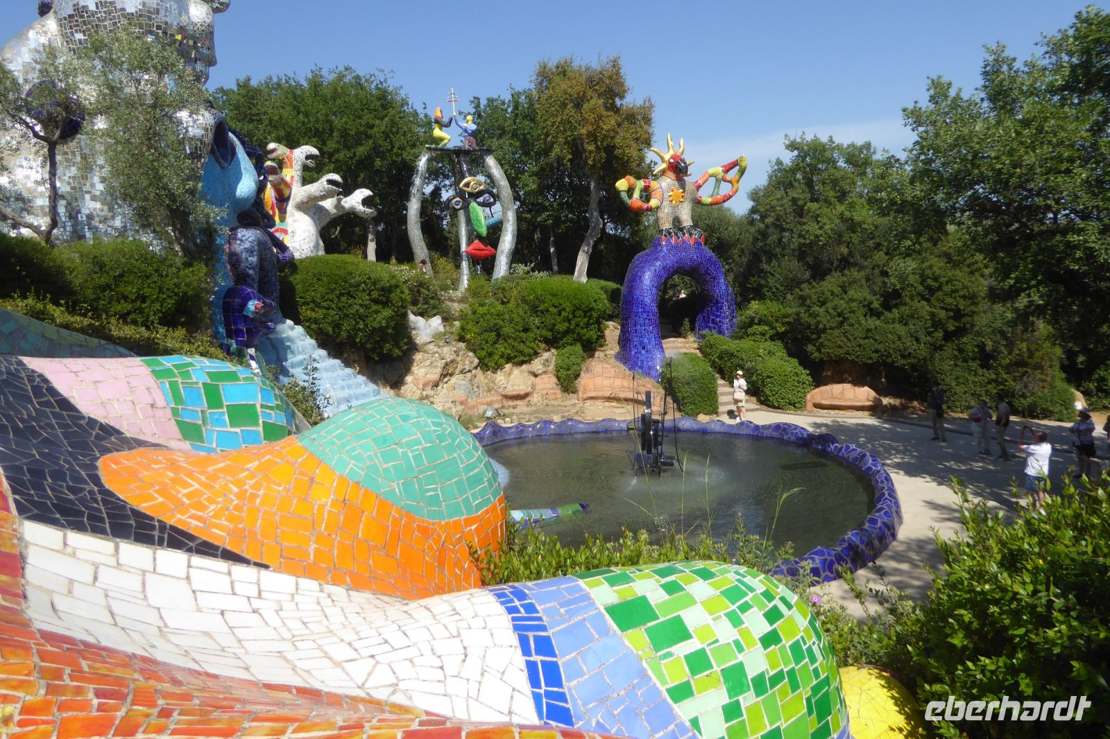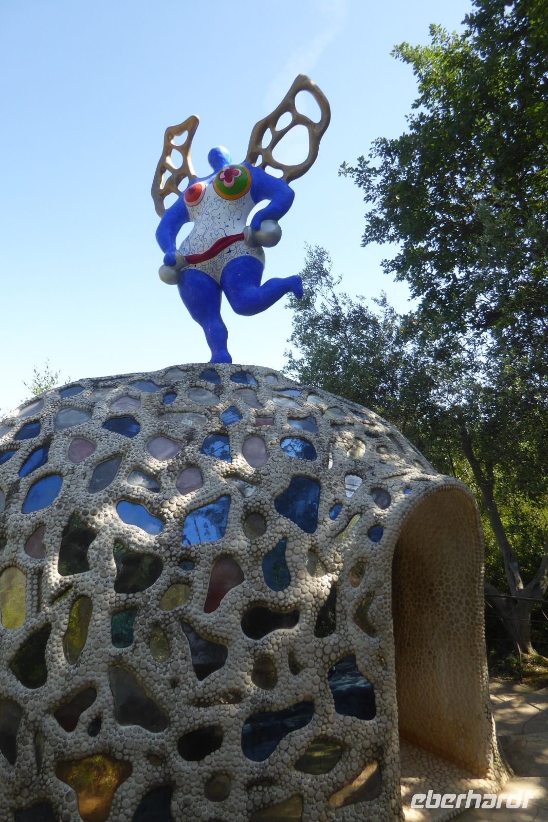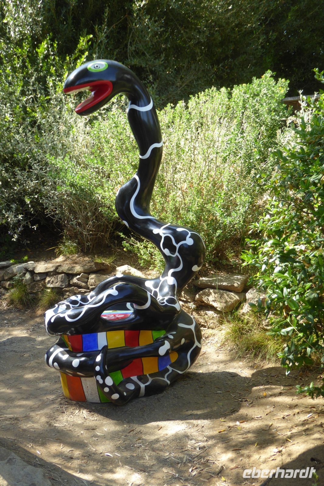 Auch der nächste Garten entführte uns in eine Fantasiewelt- in die fantastische bunte Welt der Nicki de Saint Phalle. Geboren 1930 in einem Nobelvorort von Paris, wuchs Niki hauptsächlich in den USA auf. 2002, im gleichen Jahr wie ihr Terrorgarten in der Toskana offiziell anerkannt wird, stirbt Niki de Saint Phalle in ihrer Wahlheimat in La Jolla, Kalifornien. Dazwischen liegen spannende Jahre, in denen sie ihre Kunst entwickelt, mit der sie die einschneidenden Erlebnisse in ihrem Leben zu verarbeiten versuchte. In diesem Park, der von einer großen Tuffsteinmauer, die der Architekt Mario Botta entworfen hat, befinden sich zweiundzwanzig enorme, bis zu 15 m hohe teilweise begehbare Skulpturen aus Stahl und Zement, die mit Spiegeln, buntem Glas und Keramikstückchen verziert, die Figuren der großen Arkana des Tarots darstellen. Niki selbst sagt dazu: „das Leben ist wie ein Kartenspiel; wir werden geboren, ohne die Regeln zu kennen, aber jeder von uns muss mit dem Blatt spielen, das er bekommt.“ Fast zwanzig Jahre ihres Lebens hat sie an der Seite mit Jean Tinguely an der Verwirklichung dieses Gartens, der ihr und uns eine Reise in die eigene Gedankenwelt ermöglicht, gearbeitet.