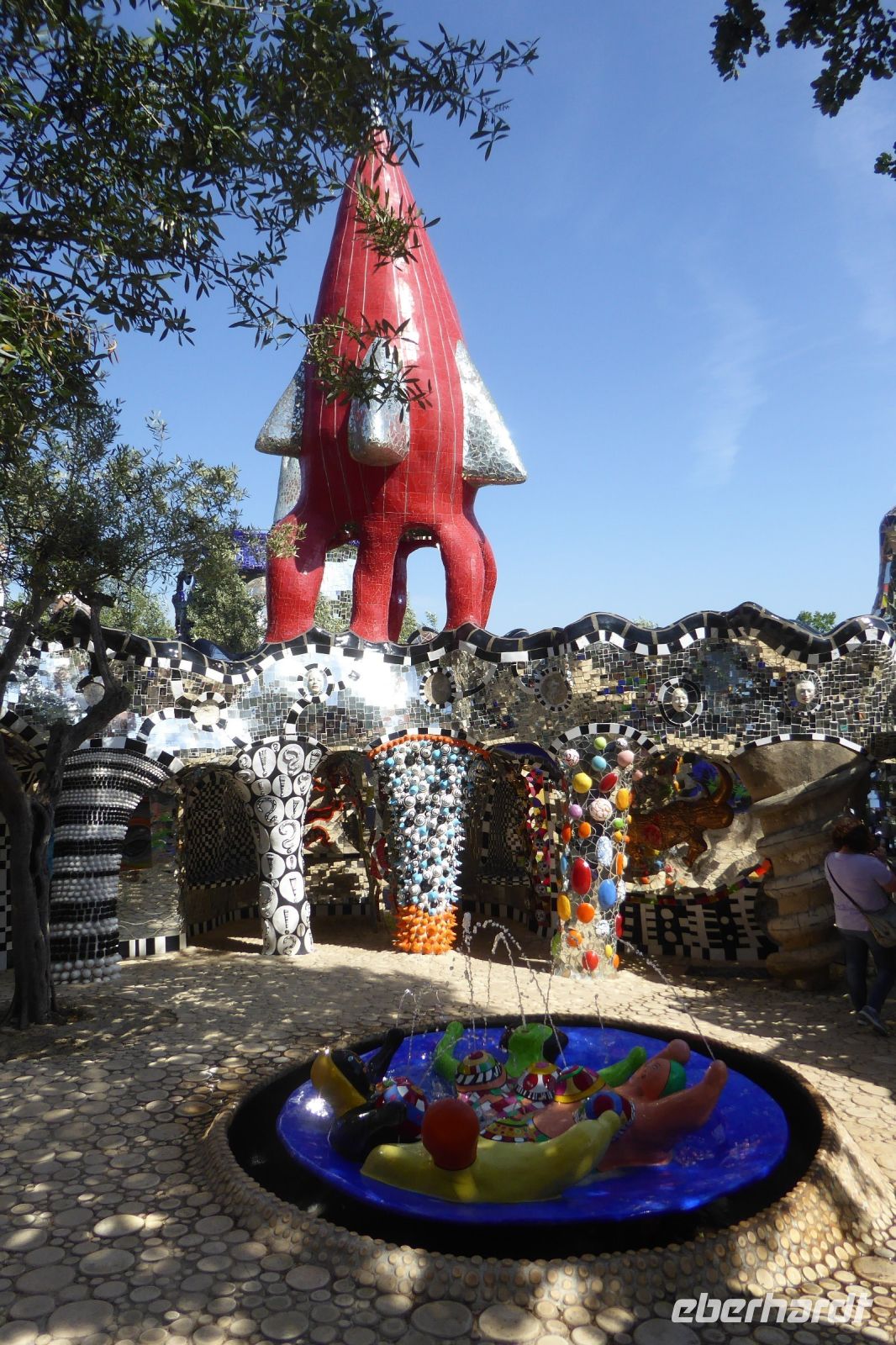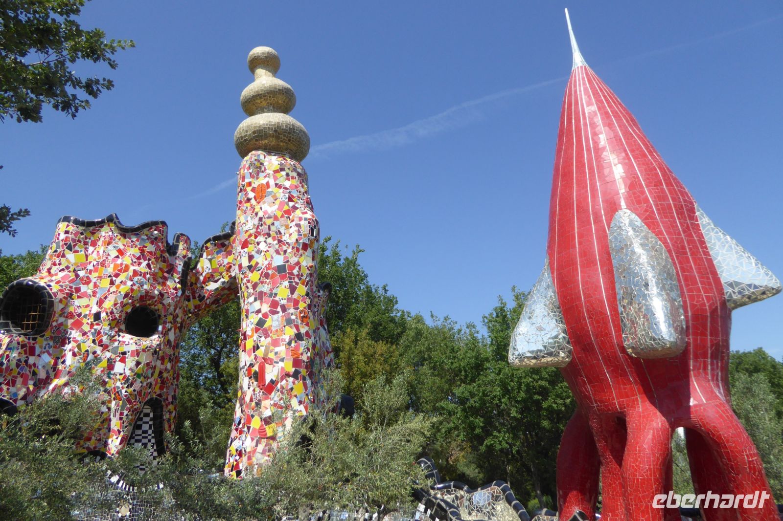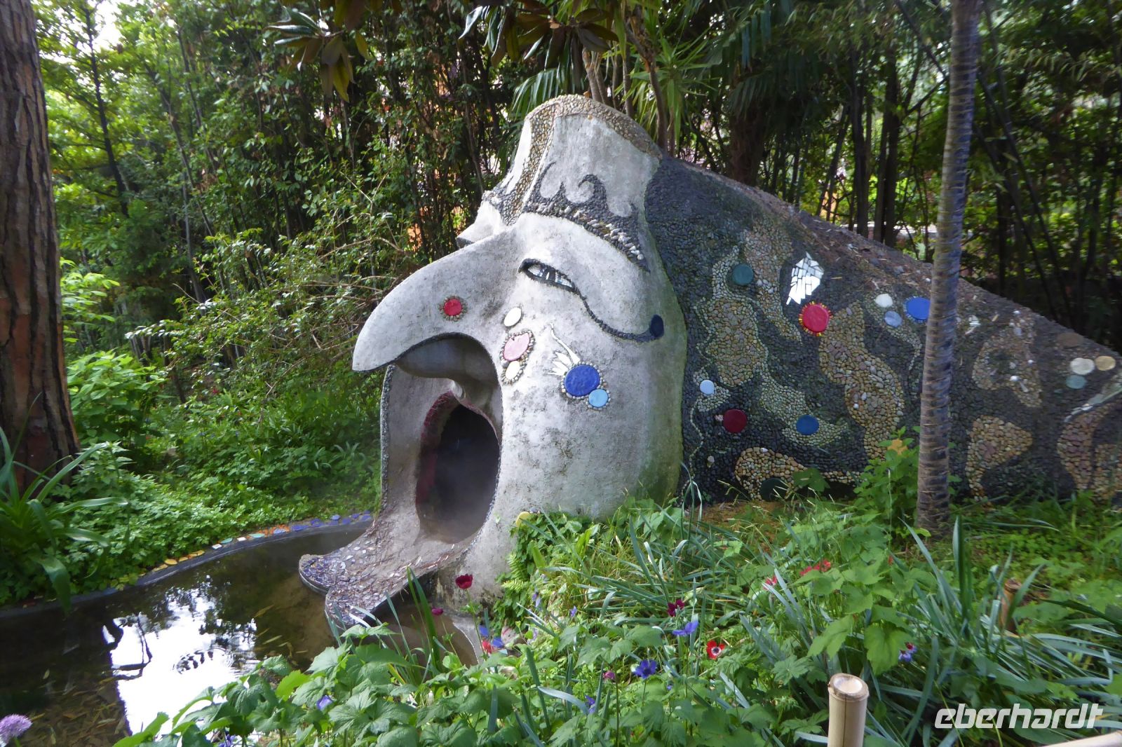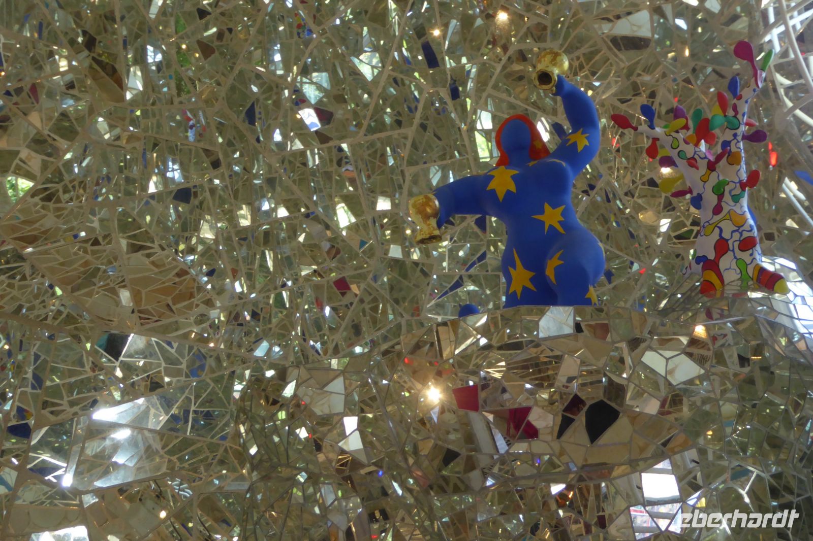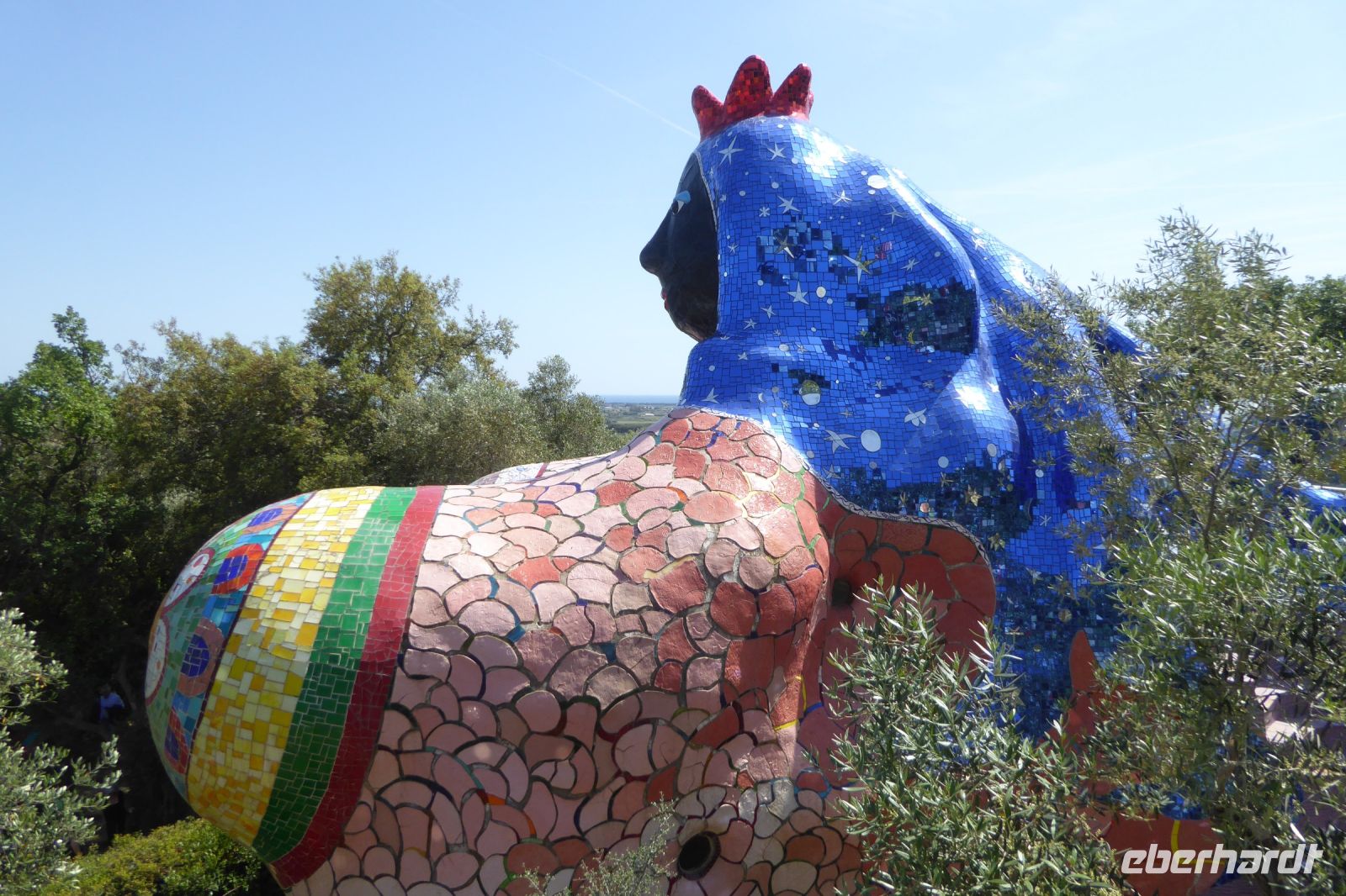 Auch der nächste Garten entführte uns in eine Fantasiewelt- in die fantastische bunte Welt der Nicki de Saint Phalle. Geboren 1930 in einem Nobelvorort von Paris, wuchs Niki hauptsächlich in den USA auf. 2002, im gleichen Jahr wie ihr Terrorgarten in der Toskana offiziell anerkannt wird, stirbt Niki de Saint Phalle in ihrer Wahlheimat in La Jolla, Kalifornien. Dazwischen liegen spannende Jahre, in denen sie ihre Kunst entwickelt, mit der sie die einschneidenden Erlebnisse in ihrem Leben zu verarbeiten versuchte. In diesem Park, der von einer großen Tuffsteinmauer, die der Architekt Mario Botta entworfen hat, befinden sich zweiundzwanzig enorme, bis zu 15 m hohe teilweise begehbare Skulpturen aus Stahl und Zement, die mit Spiegeln, buntem Glas und Keramikstückchen verziert, die Figuren der großen Arkana des Tarots darstellen. Niki selbst sagt dazu: „das Leben ist wie ein Kartenspiel; wir werden geboren, ohne die Regeln zu kennen, aber jeder von uns muss mit dem Blatt spielen, das er bekommt.“ Fast zwanzig Jahre ihres Lebens hat sie an der Seite mit Jean Tinguely an der Verwirklichung dieses Gartens, der ihr und uns eine Reise in die eigene Gedankenwelt ermöglicht, gearbeitet.