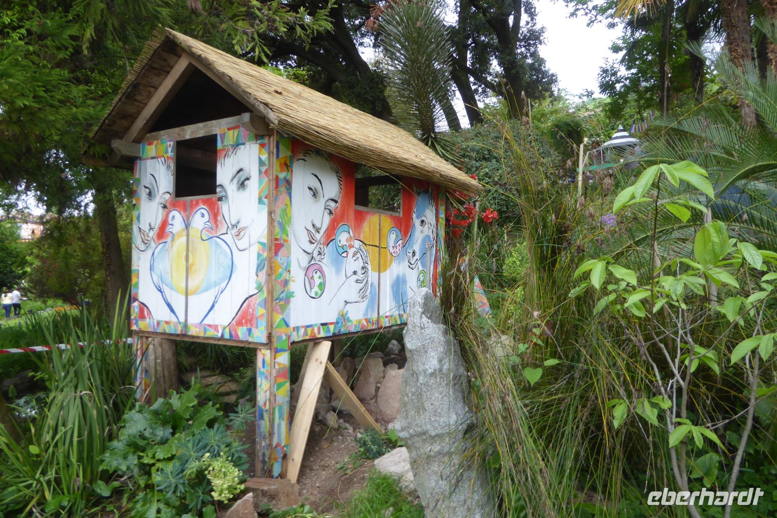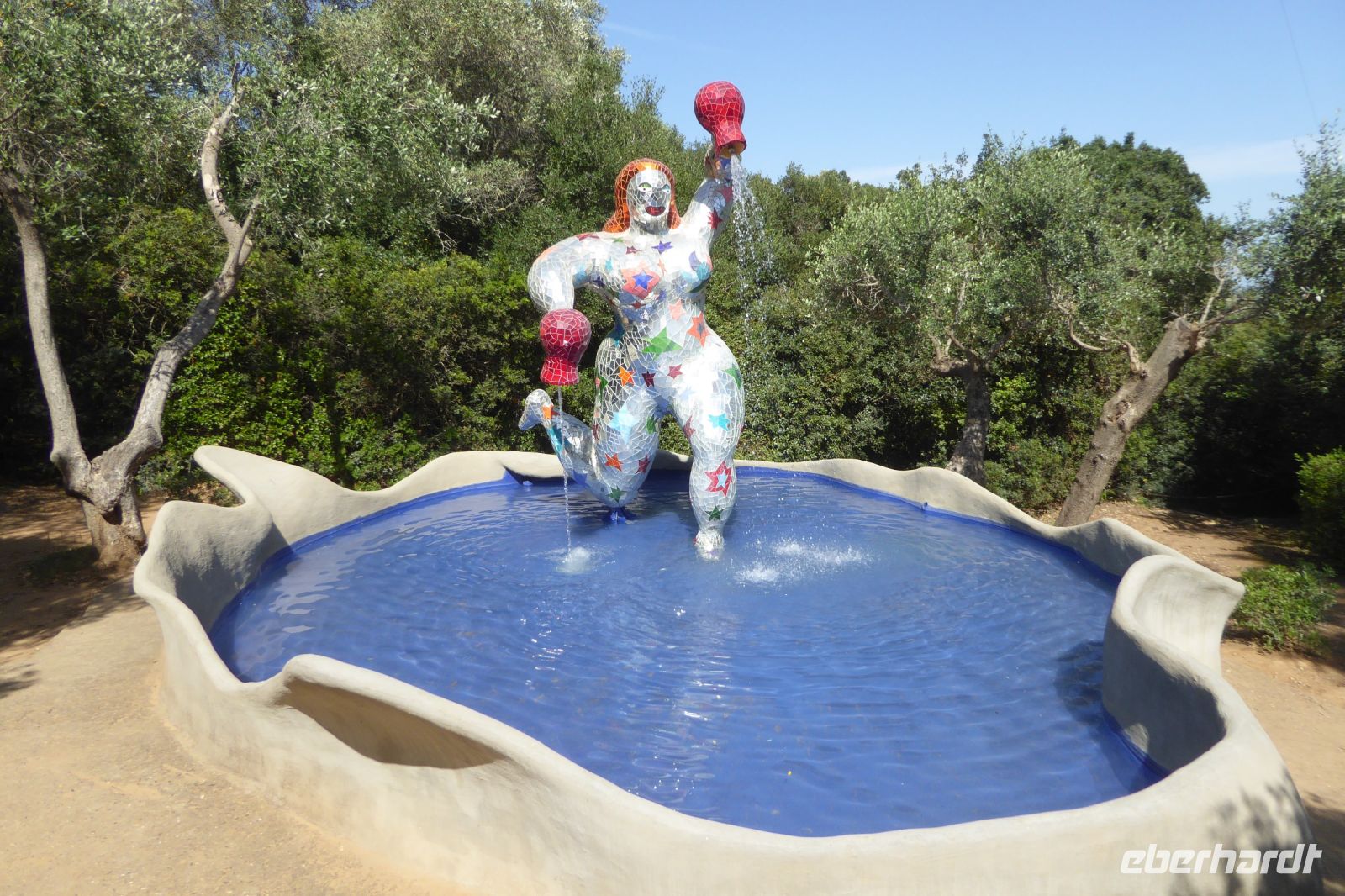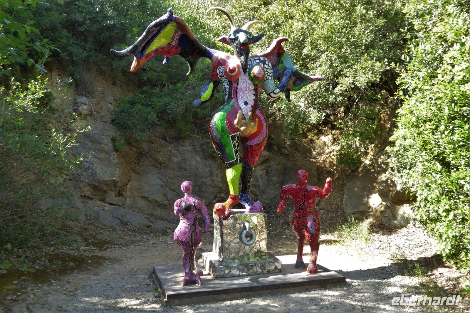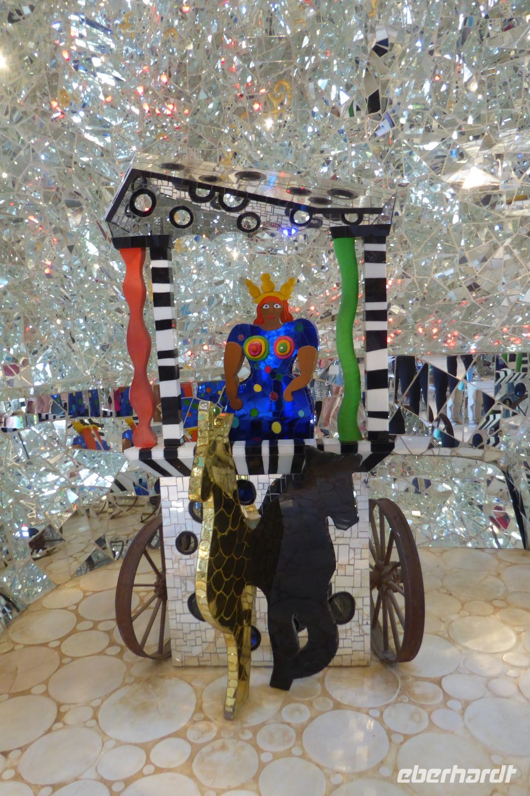 Auch der nächste Garten entführte uns in eine Fantasiewelt- in die fantastische bunte Welt der Nicki de Saint Phalle. Geboren 1930 in einem Nobelvorort von Paris, wuchs Niki hauptsächlich in den USA auf. 2002, im gleichen Jahr wie ihr Terrorgarten in der Toskana offiziell anerkannt wird, stirbt Niki de Saint Phalle in ihrer Wahlheimat in La Jolla, Kalifornien. Dazwischen liegen spannende Jahre, in denen sie ihre Kunst entwickelt, mit der sie die einschneidenden Erlebnisse in ihrem Leben zu verarbeiten versuchte. In diesem Park, der von einer großen Tuffsteinmauer, die der Architekt Mario Botta entworfen hat, befinden sich zweiundzwanzig enorme, bis zu 15 m hohe teilweise begehbare Skulpturen aus Stahl und Zement, die mit Spiegeln, buntem Glas und Keramikstückchen verziert, die Figuren der großen Arkana des Tarots darstellen. Niki selbst sagt dazu: „das Leben ist wie ein Kartenspiel; wir werden geboren, ohne die Regeln zu kennen, aber jeder von uns muss mit dem Blatt spielen, das er bekommt.“ Fast zwanzig Jahre ihres Lebens hat sie an der Seite mit Jean Tinguely an der Verwirklichung dieses Gartens, der ihr und uns eine Reise in die eigene Gedankenwelt ermöglicht, gearbeitet.