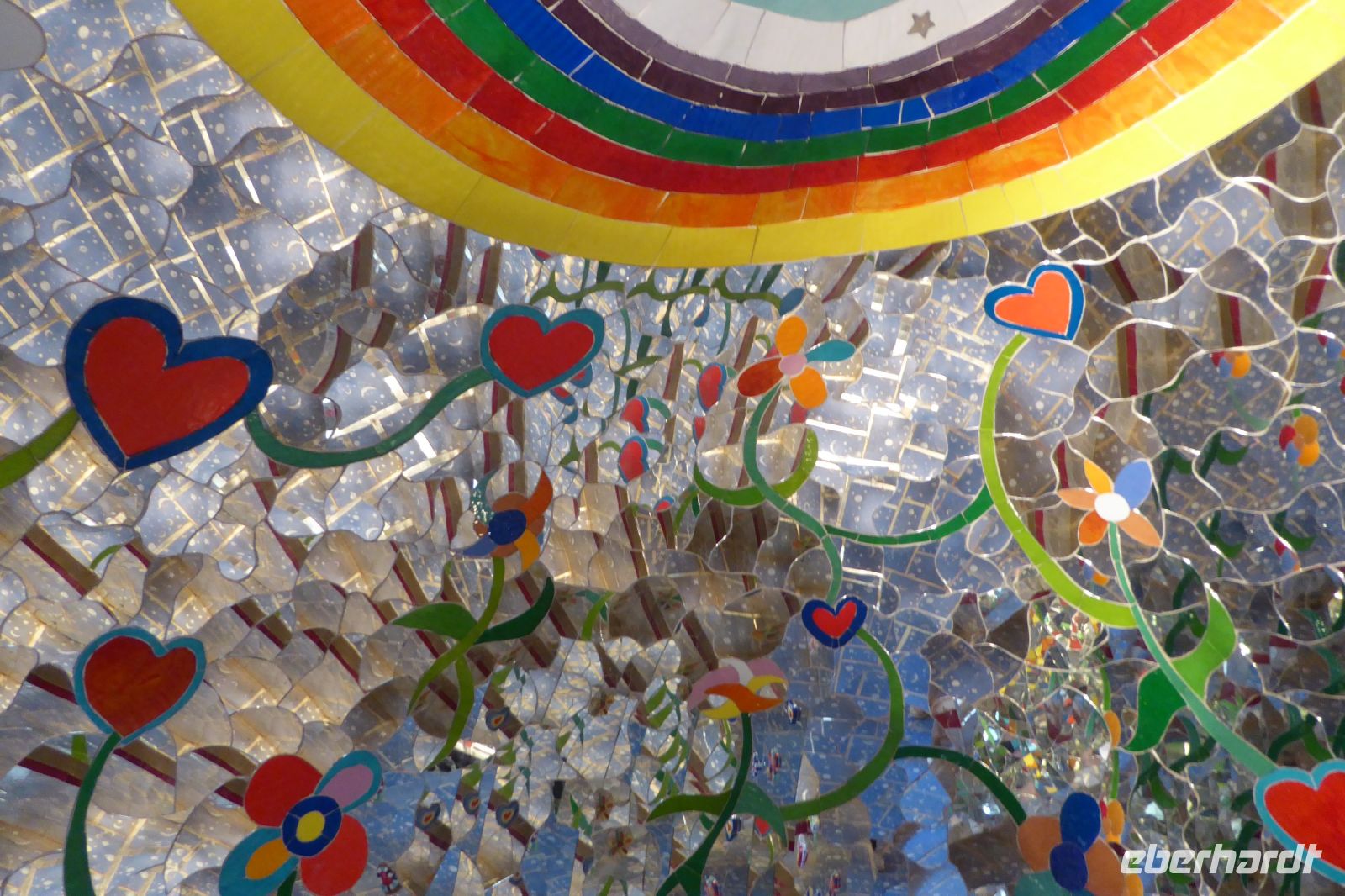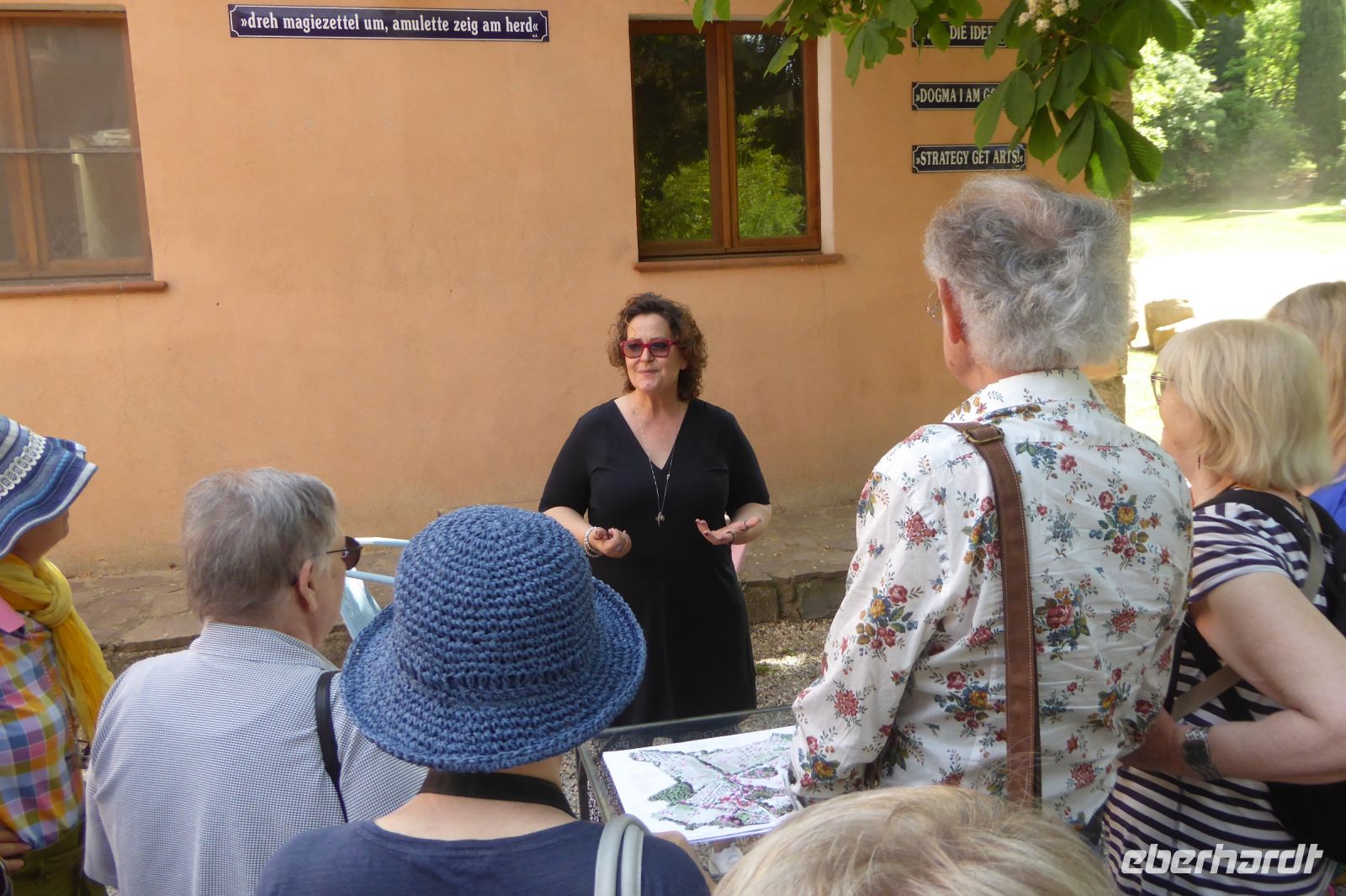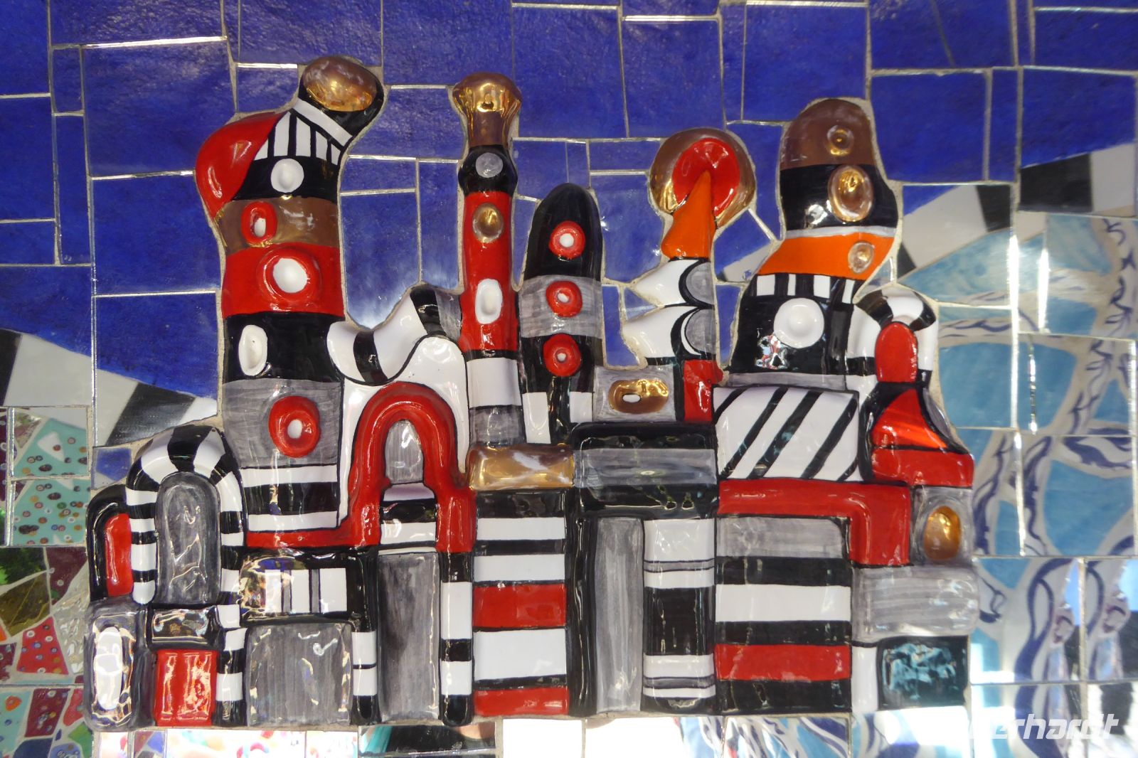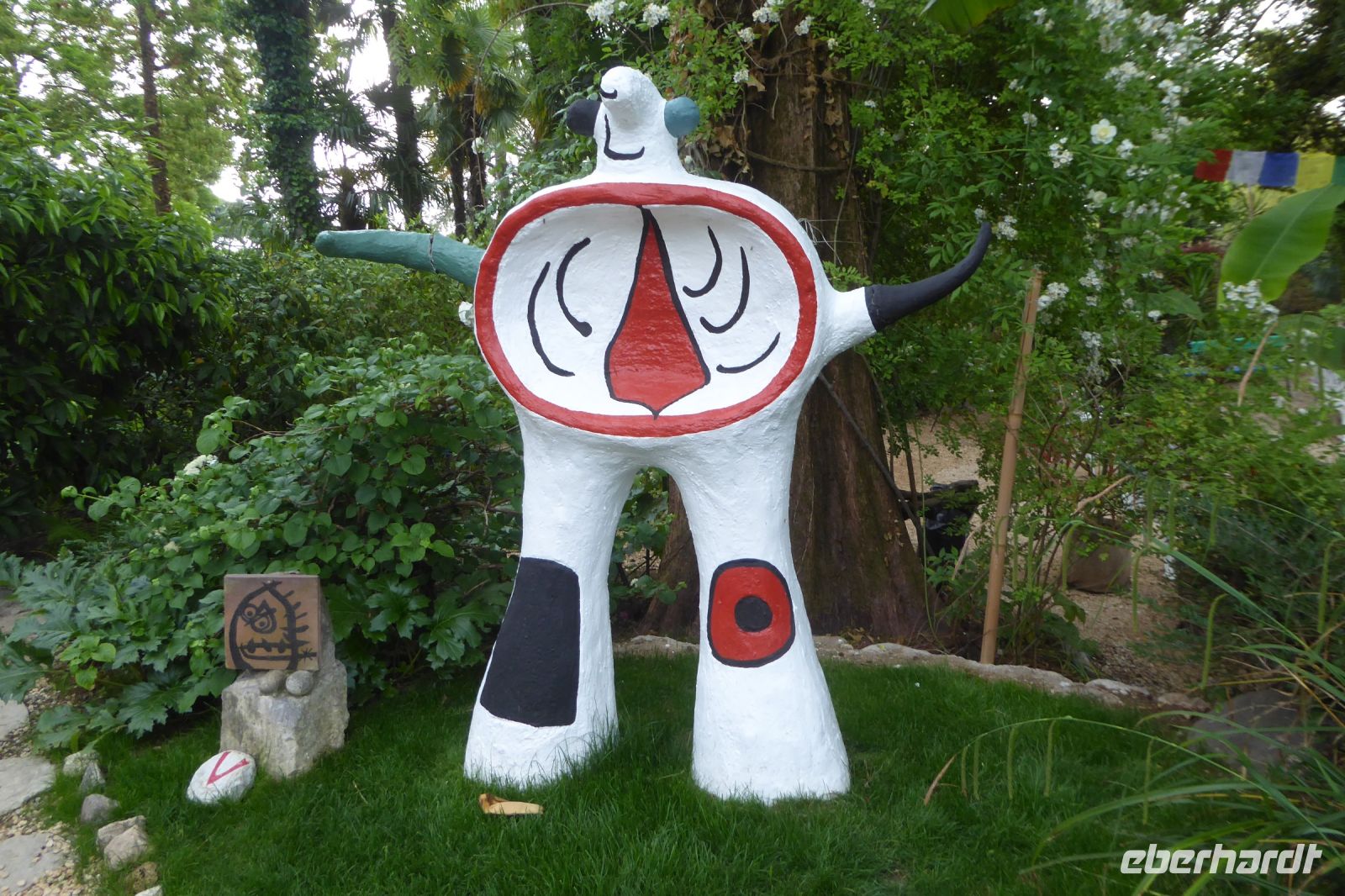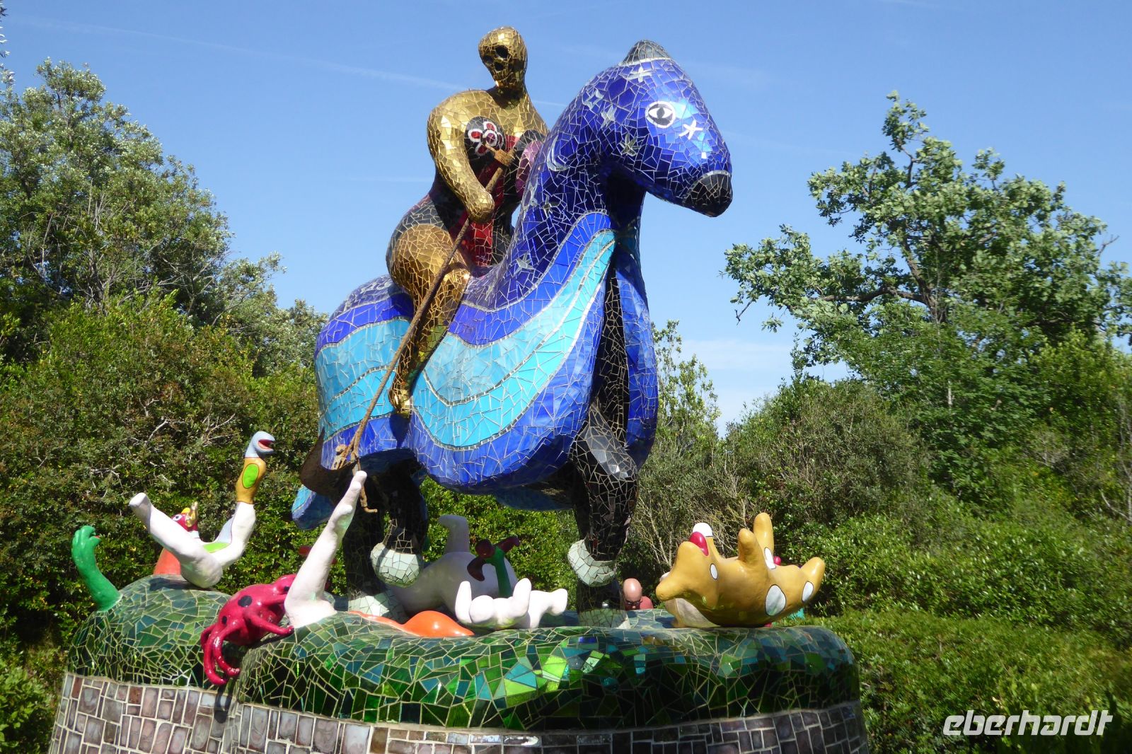 Auch der nächste Garten entführte uns in eine Fantasiewelt- in die fantastische bunte Welt der Nicki de Saint Phalle. Geboren 1930 in einem Nobelvorort von Paris, wuchs Niki hauptsächlich in den USA auf. 2002, im gleichen Jahr wie ihr Terrorgarten in der Toskana offiziell anerkannt wird, stirbt Niki de Saint Phalle in ihrer Wahlheimat in La Jolla, Kalifornien. Dazwischen liegen spannende Jahre, in denen sie ihre Kunst entwickelt, mit der sie die einschneidenden Erlebnisse in ihrem Leben zu verarbeiten versuchte. In diesem Park, der von einer großen Tuffsteinmauer, die der Architekt Mario Botta entworfen hat, befinden sich zweiundzwanzig enorme, bis zu 15 m hohe teilweise begehbare Skulpturen aus Stahl und Zement, die mit Spiegeln, buntem Glas und Keramikstückchen verziert, die Figuren der großen Arkana des Tarots darstellen. Niki selbst sagt dazu: „das Leben ist wie ein Kartenspiel; wir werden geboren, ohne die Regeln zu kennen, aber jeder von uns muss mit dem Blatt spielen, das er bekommt.“ Fast zwanzig Jahre ihres Lebens hat sie an der Seite mit Jean Tinguely an der Verwirklichung dieses Gartens, der ihr und uns eine Reise in die eigene Gedankenwelt ermöglicht, gearbeitet.