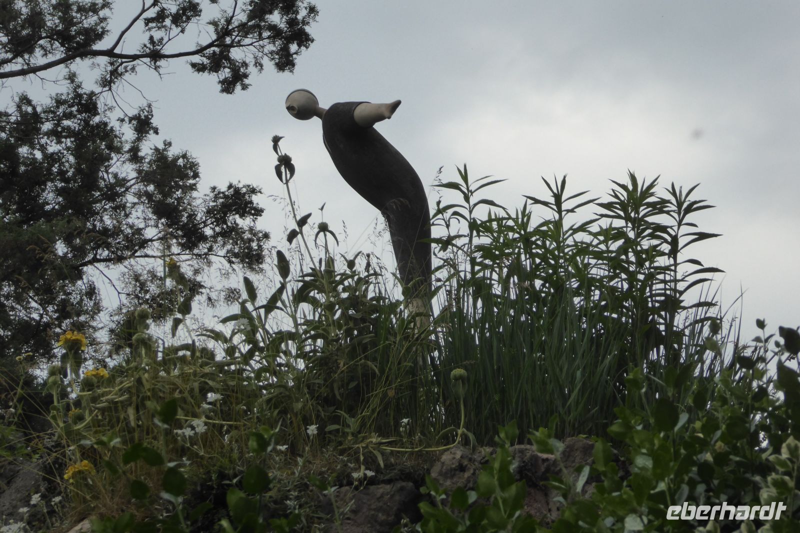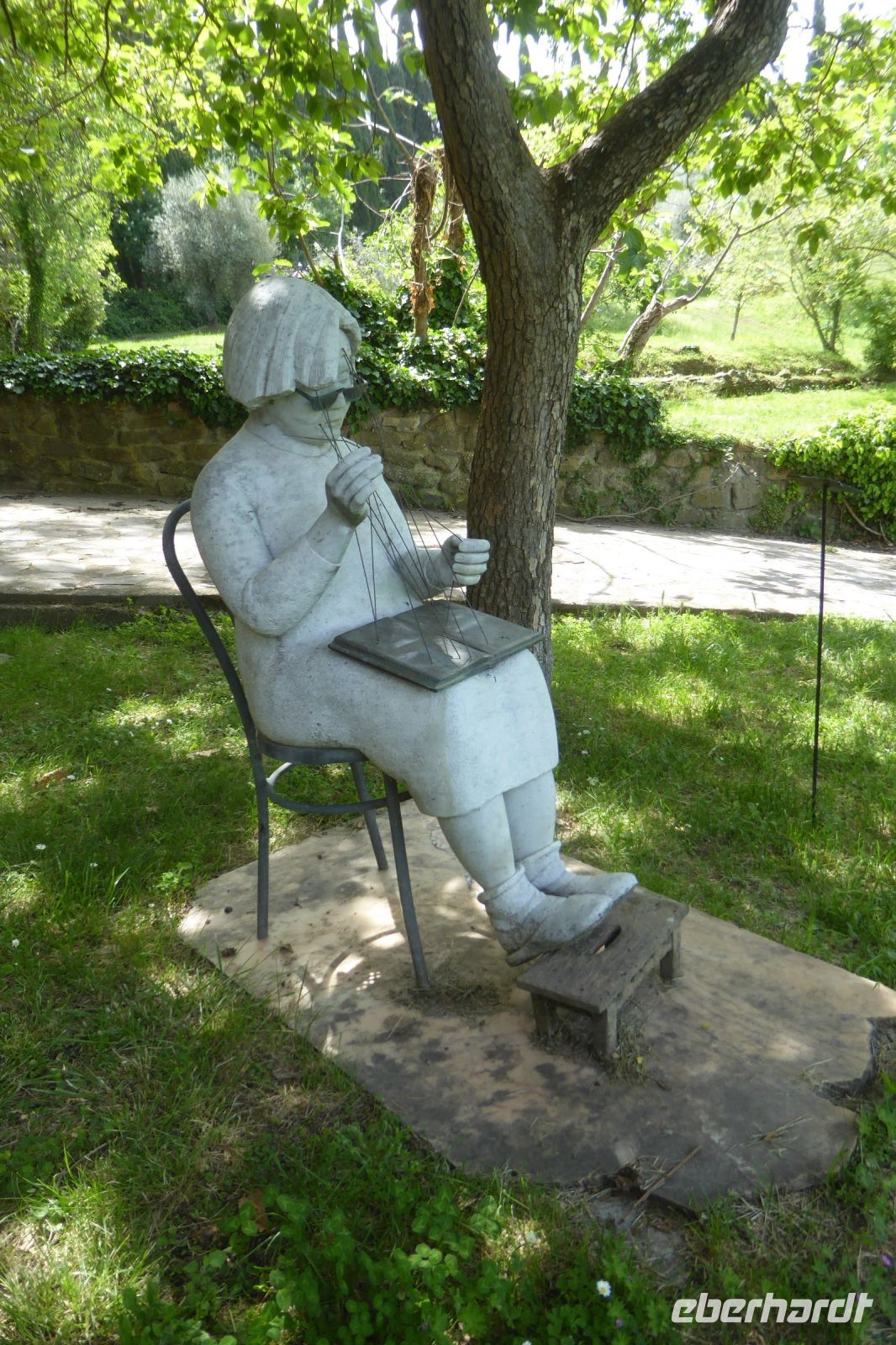 Unser heutiger Ausflug führte uns auf kurvenreichen Sträßchen durch die Bilderbuchlandschaft der Toskana in die ca. 50 km entfernte Ortschaft Seggiano. Der kleine Ort ist seit dem sechzehnten Jahrhundert Teil des Herzogtum Toskana. Dort hat sich 1997 der Schweizer Künstler Daniel Spoerri niedergelassen. Seinen ursprünglichen Plan auf dem 16 ha großen Areal Landwirtschaft zu betreiben, hat er schnell aufgegeben, wie uns Romy Degner, die verantwortliche Leiterin der Anlage schmunzelnd berichtete. Bei ihren einleitenden Worten zum Garten und zum Werk des 1930 in Rumänien geborenen Ausnahmekünstlers Spoerri sprang gleich der Funke über, und man konnte ihre Begeisterung für den Künstler, seine Werke und den von ihm geschaffenen „Kunst – Garten“ spüren. In der weitläufigen Gartenanlage, zu Füßen des Monte Amiata, gibt es viel zu entdecken. Mittlerweile sind es 117 Kunstwerke unterschiedlichster Künstler aus dem Freundeskreis, die hier ihre Werke mitten in der Natur platzieren konnten. Darunter die beeindruckende Bronze Skulptur von Aldo Mondino, einem Fisch auf einem Fuß, oder die 160 lebensgroßen Gänse aus Stahlbeton von Olivier Estoppey und natürlich auch die Charakterköpfe von Eva Äppli, der ersten Ehefrau von Jean Tinguely, dessen Werke auch hier zu finden sind. Der Großteil der Objekte ist von Daniel Spoerri selbst geschaffen und entspringt seiner grenzenlosen Fantasie, seiner Entdecker- und Schaffensfreude. So ist man auf Schritt und Tritt mit dem Ungewöhnlichen konfrontiert und passt sich ganz automatisch der Sehweise des Künstlers an. Altes und Gewohntes verändert sich mit dem Blickwinkel. Mit einem geschärften Blick für das vermeintlich Alltägliche entsteht Raum für neue Erkenntnisse.