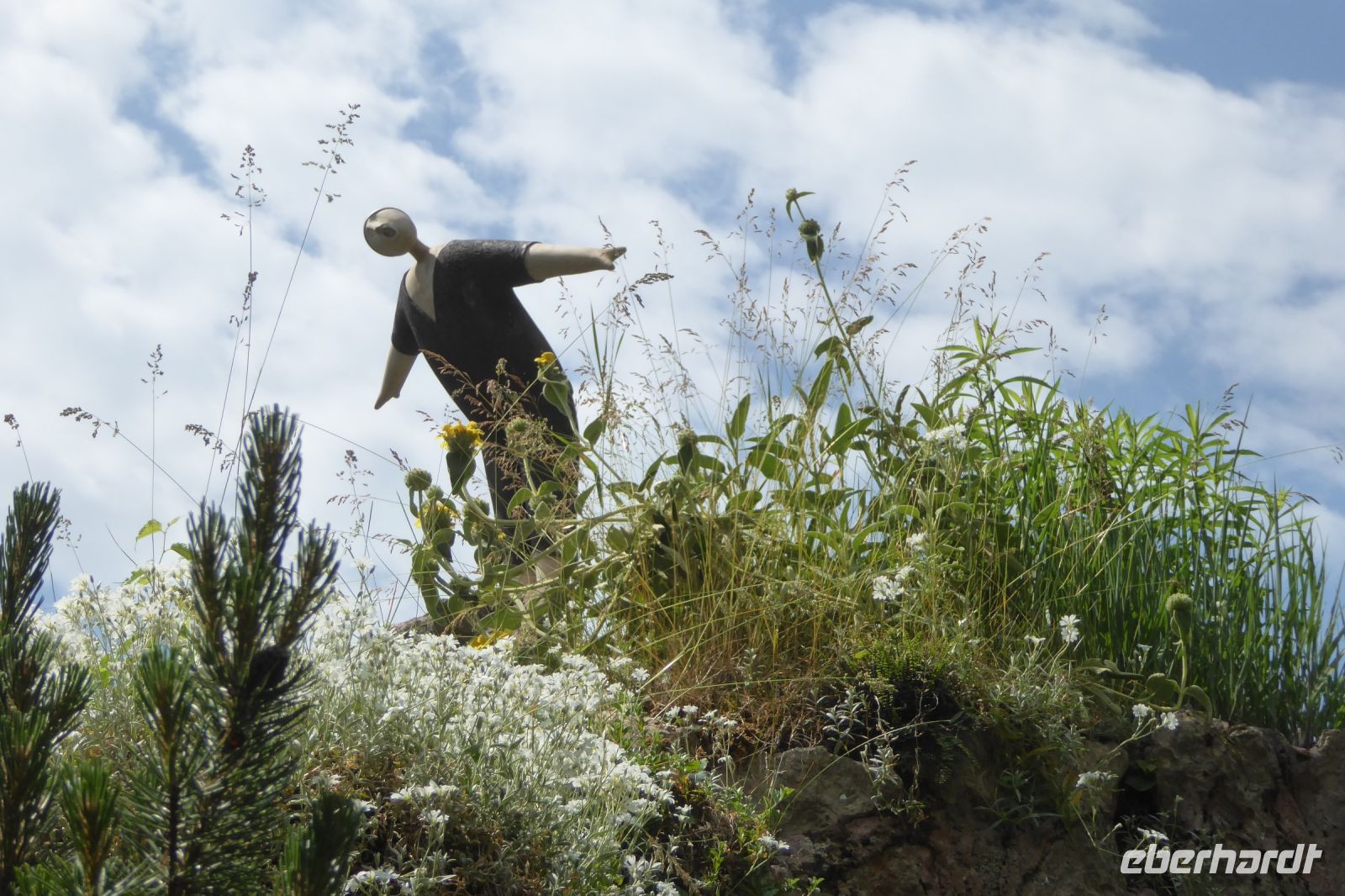 Auch wir konnten uns dem Zauber der Anlage nicht entziehen und schlenderten über die verschlungenen Wege zu den inmitten der Wiesen stehenden Kunstwerken. Mit Erstaunen stellten wir fest, dass der von Spöri selbst beklagte Rückzug der Natur aufgehalten wurde. Verschiedene Arten von Knabenkraut, Stendelwurzen und Ragwurzen gaben sich in den Wiesen wieder ein Stelldichein!