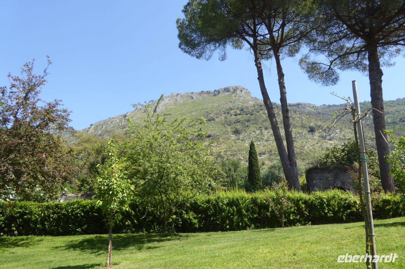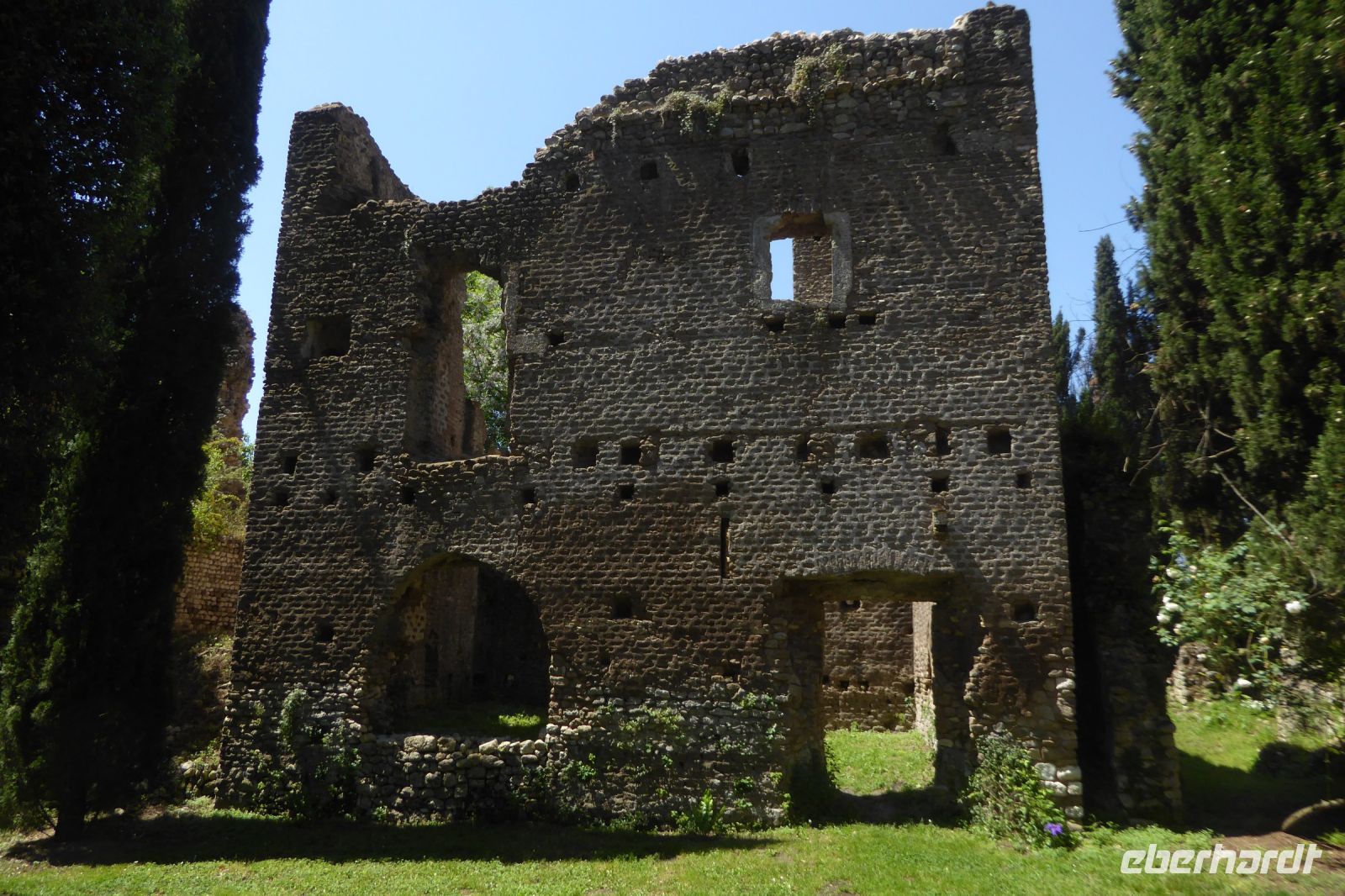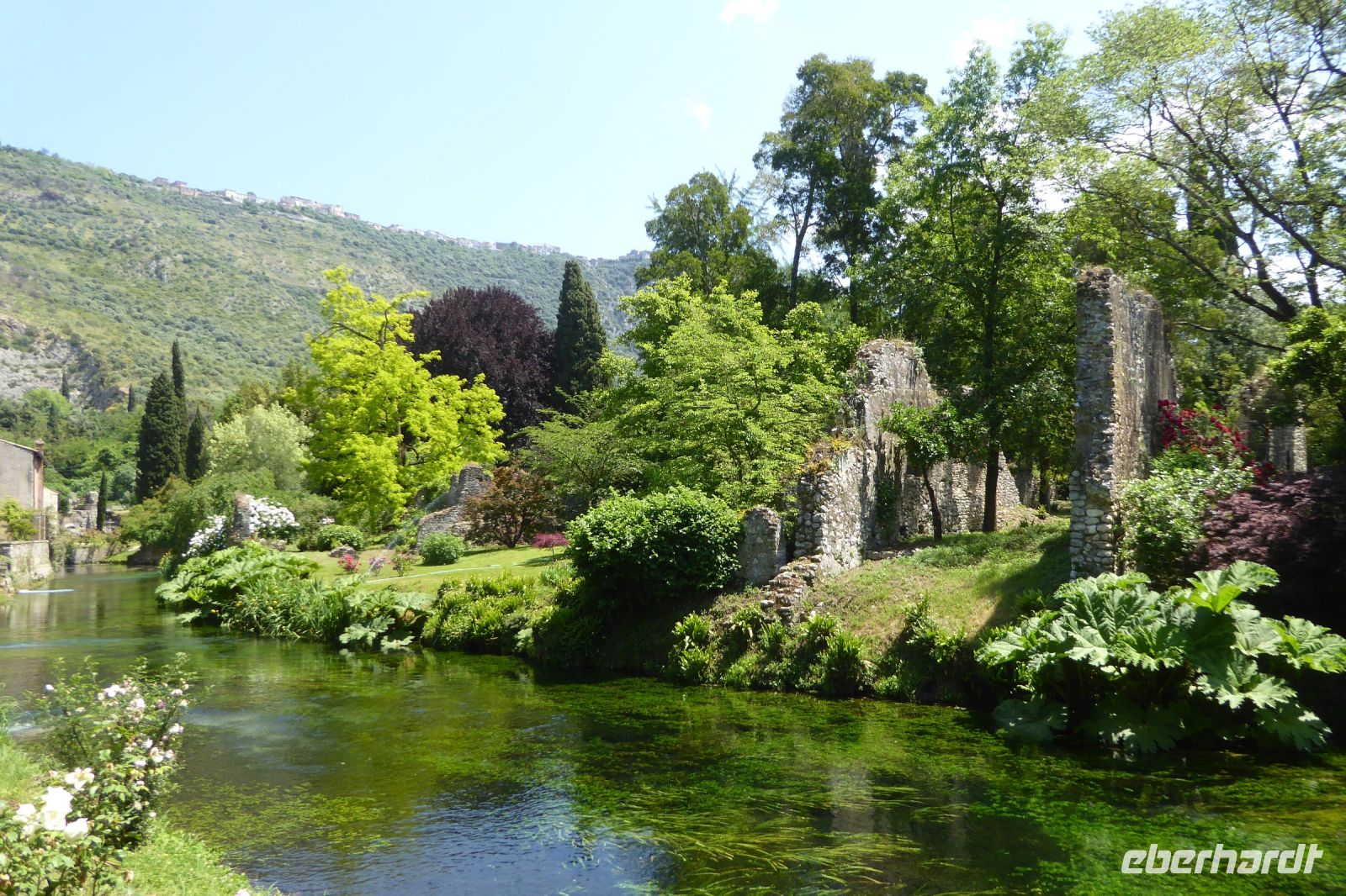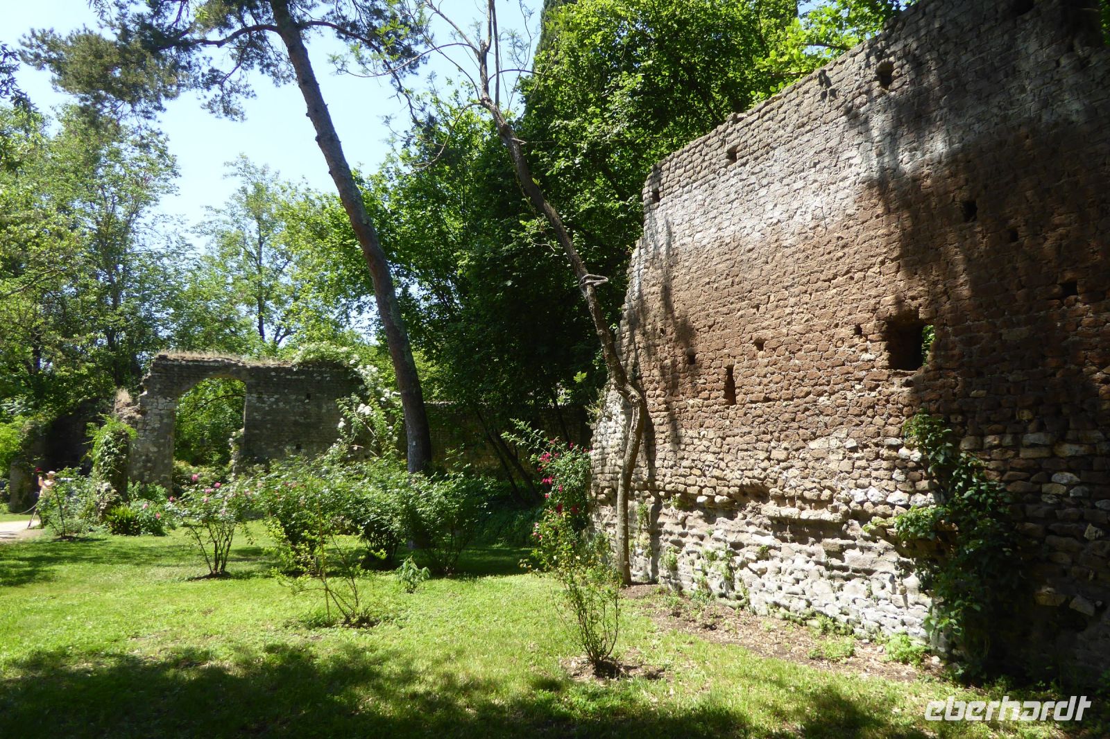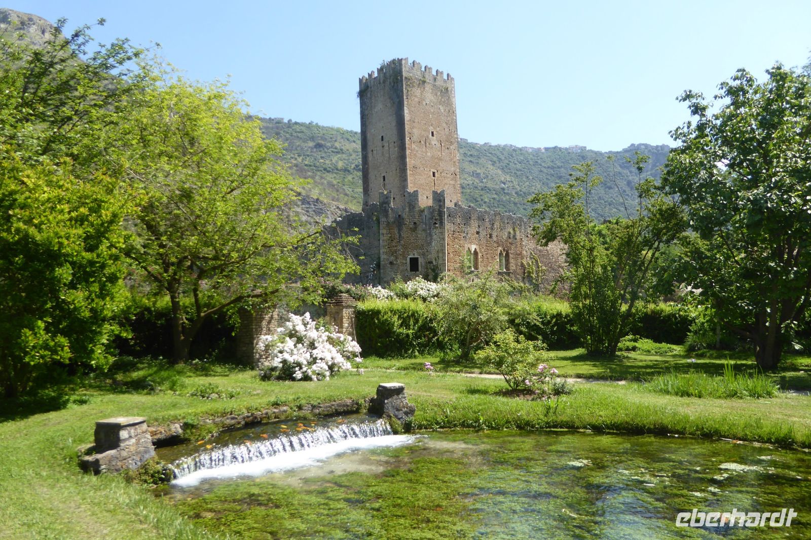Heute erreichten wir mit dem wohl romantischten Garten Italiens den südlichsten Punkt unserer Reise: den Garten der Nymphen mitten in den.Pontinischen Sümpfen. Der heutige Ort Ninfa liegt an den Hängen der Monti Lepini, die hier eine Höhe von fast 1000 m erreichen. In römischer Zeit hatte die Stadt, die an der Straße von Neapel nach Rom lag, 2000 Einwohner. Hier stand ein Tempel, der den Göttinnen des Quellwassers, den Nymphen gewidmet war. Bis zu ihrer Zerstörung im vierzehnten Jahrhundert verfügte die reiche Stadt mit 150 Steinhäusern, über vierzehn Kirchen, Mühlen, Brücken und eine Burg. Eine gewaltige Mauer mit elf Türmen diente der Stadt zum Schutz. Seit dem sechzehnten Jahrhundert steht Ninfa, unter der Herrschaft der Feudalherren von Sermoneta, der Familie Caetani, in deren Besitz das Anwesen bis heute ist. Diese Familie war es auch, die den von dem deutschen Historiker Ferdinand Gregorovius als „Pompeji des Mittelalters“ beschriebenen Ort wieder zum Leben erweckte. „Dieses entzückende Nymphea ist das reizendste Märchen der Geschichte und Natur das sich irgend in der Welt gesehen habe“, so der Literat. Seit den zwanziger Jahren des zwanzigsten Jahrhunderts wurden die von zahlreichen Pflanzen überwucherten Ruinen von den Besitzern, eben jener alten römischen Adelsfamilie Caetani, in den Traum eines englischen Landschaftsgarten integriert und zu einer unvergesslichen harmonischen Symbiose von Ruinen und Pflanzen umgewandelt. Die wasserreiche Südlage unterhalb der schützenden Berge sowie die mittelalterlichen Mauern schaffen ein spezifisches Mikroklima in dem exotische Pflanzen wie japanische Ahornbäume, Bambus, Hartriegel, Kamelien, Magnolien, Callistemon, Laburnum und verschiedene Rosensorten sowie großblättrige Gunnera und Wasserlilien entlang des Baches, üppig gedeihen. Unsere charmante Führerin Umbertina hat mit ihrem Wissen und ihrer fröhlichen Art viel dazu beigetragen, dass uns dieser Garten noch lange in bester Erinnerung bleiben wird.