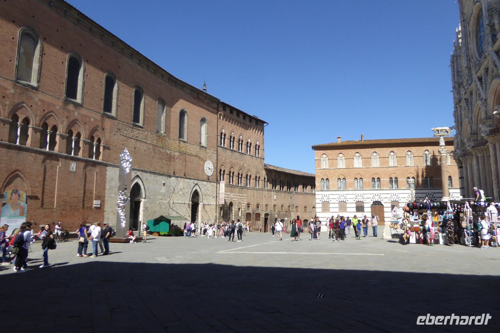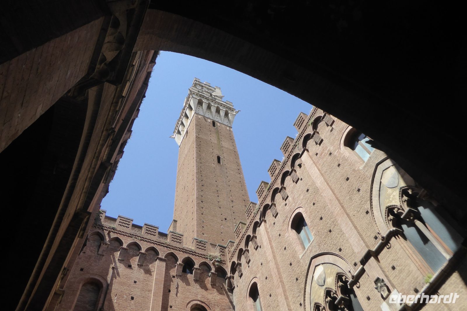 Die Führung endete an der berühmten Piazza del Campo mit seinem beeindruckenden Palazzo Pubblico. Auf dem halbrunden Platz mit seiner beeindruckenden Architektur findet zweimal jährlich das berühmte Pferderennen Palio di Siena statt. Die Regeln dieses Pferderennens haben sich seit dem Mittelalter nicht verändert. Es gilt als das wichtigste kulturelle Ereignis Sina. Siebzehn Contraden, Nachbarschaftsgemeinden, die die Stadtteile Sienas repräsentieren, wetteifern um den Sieg. Bis zu 60.000 Menschen sind im Juli und August bei dem kaum zwei Minuten dauernden Rennen als Zuschauer dabei. Im James Bond Film "Ein Quantum Trost", der zu Beginn in Siena spielt, werden Originalszenen des Palio aus dem Jahre 2007 gezeigt.