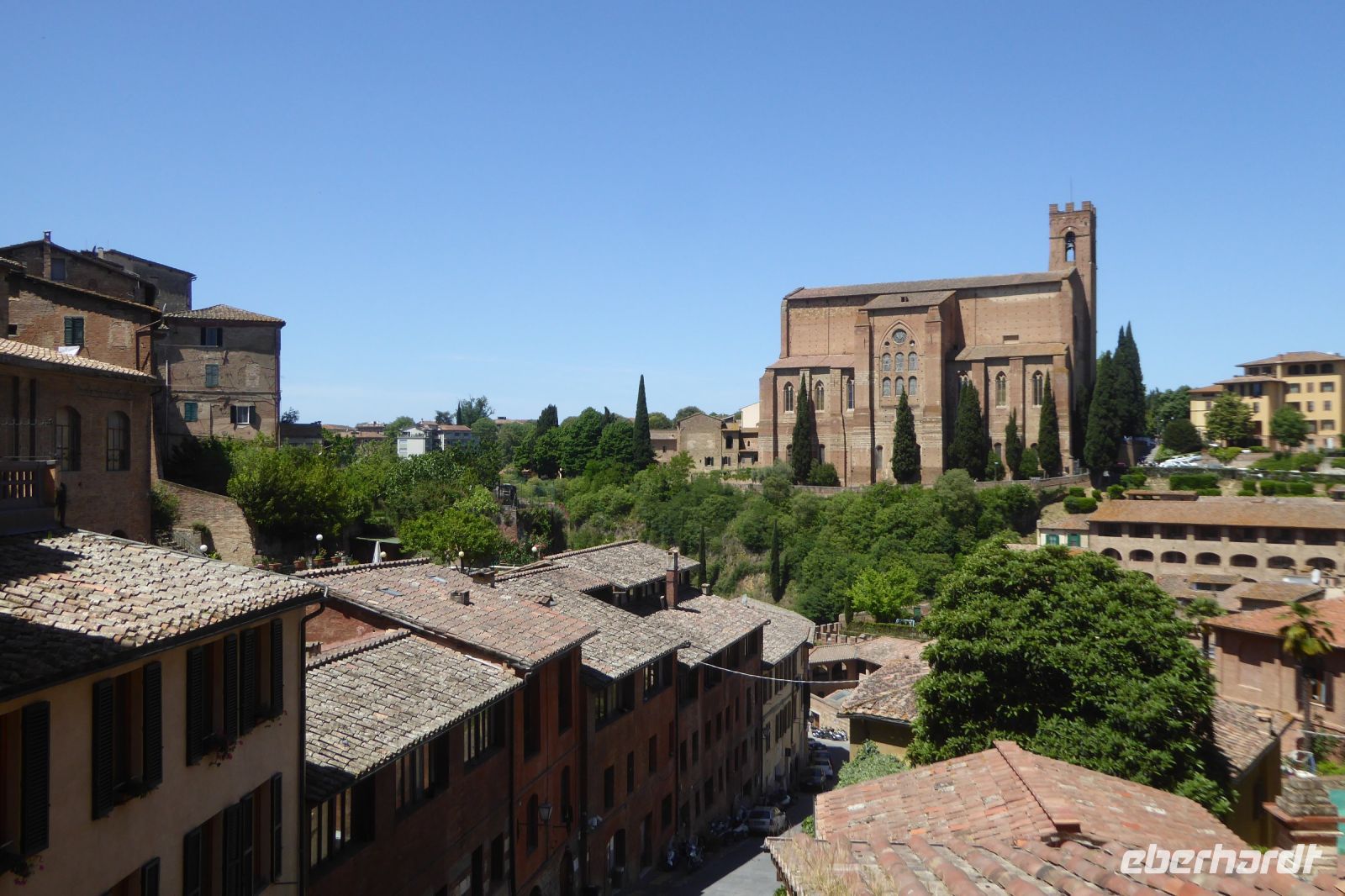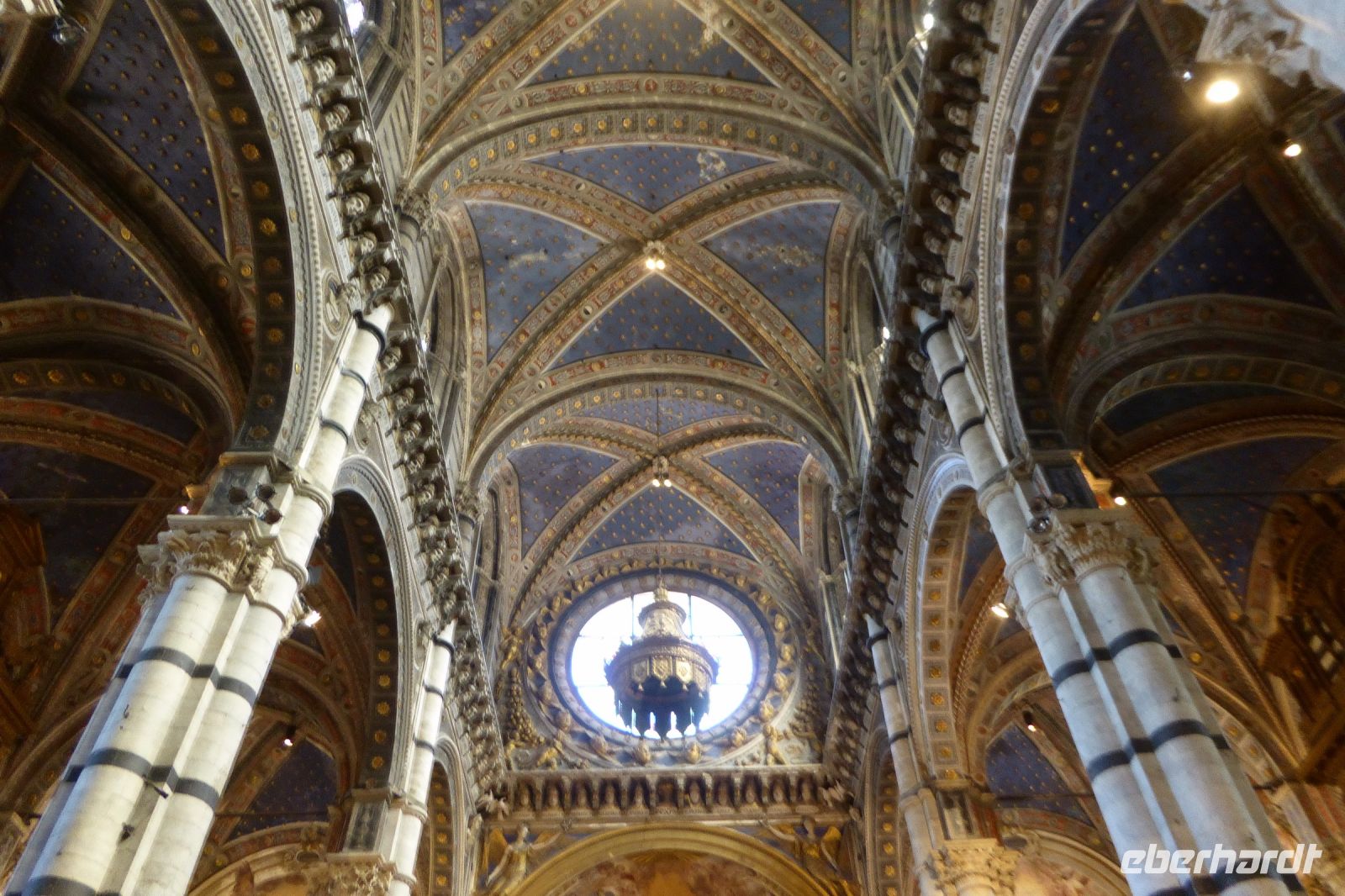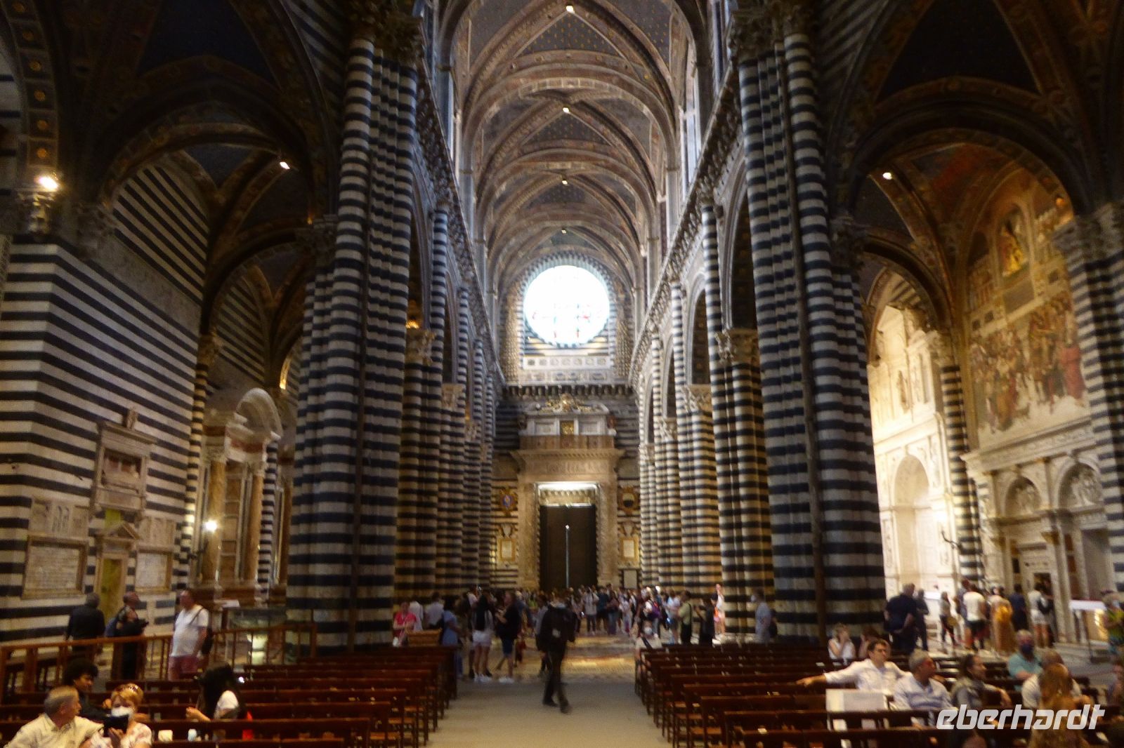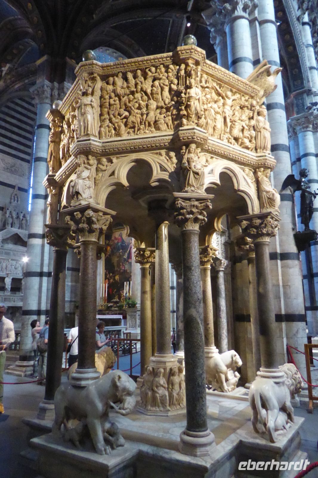 Nur wenige Kilometer von Murlo entfernt liegt Siena, eine der schönsten Städte der Toskana. Seit 1995 gehört die historische Altstadt zum UNESCO Welterbe. Seit der Mitte des dreizehnten Jahrhunderts hat die Stadt eine Universität und wenige Jahre später begannen die Arbeiten an der Fassade des Domes unter Giovanni Pisano. Die ehrgeizigen Baupläne der Stadt, die sich schon immer in Konkurrenz zu Florenz sah, wurden allerdings durch die Pest, eine Wirtschaftskrise und Baugrundprobleme torpediert und führten zur Einstellung aller Arbeiten am Dom in der Mitte des vierzehnten Jahrhunderts. Der Dom aus schwarzem und weißem Marmor ist so eines der bedeutenden Beispiele der gotischen Architektur in Italien. Bei einem Rundgang mit unserer Führerin Luisa erfuhren wir viel über die auf drei Hügeln gelegene Stadt und den Dom, den wir auch im Inneren besichtigten. Die beeindruckende Kanzel von Niccolò Pisano aus dem Jahre 1266 beeindruckt durch ihre Detailfülle und ist eines der wichtigsten Werke der Bildhauerkunst des Mittelalters.