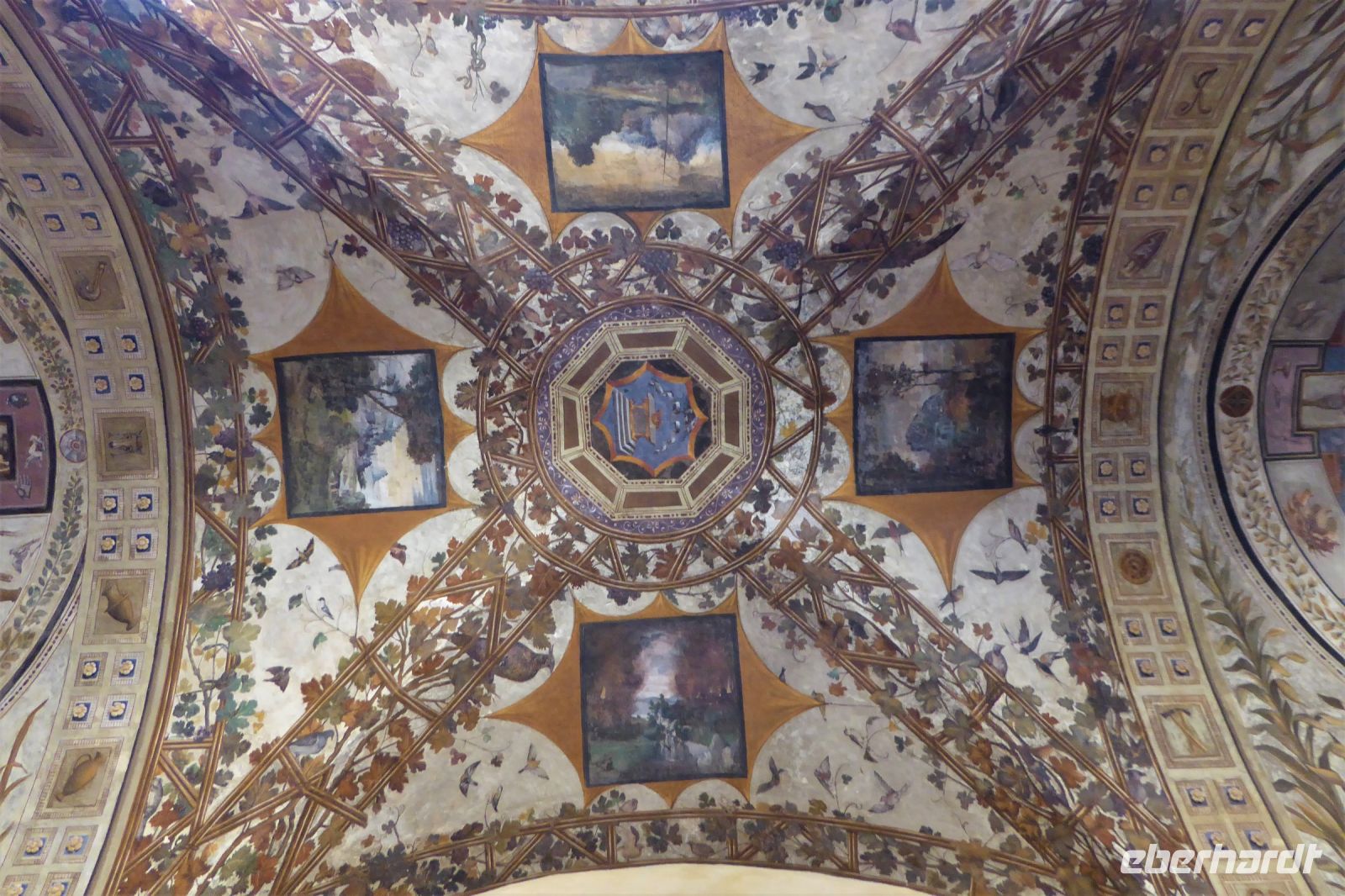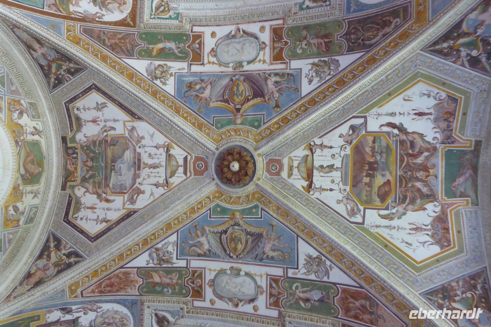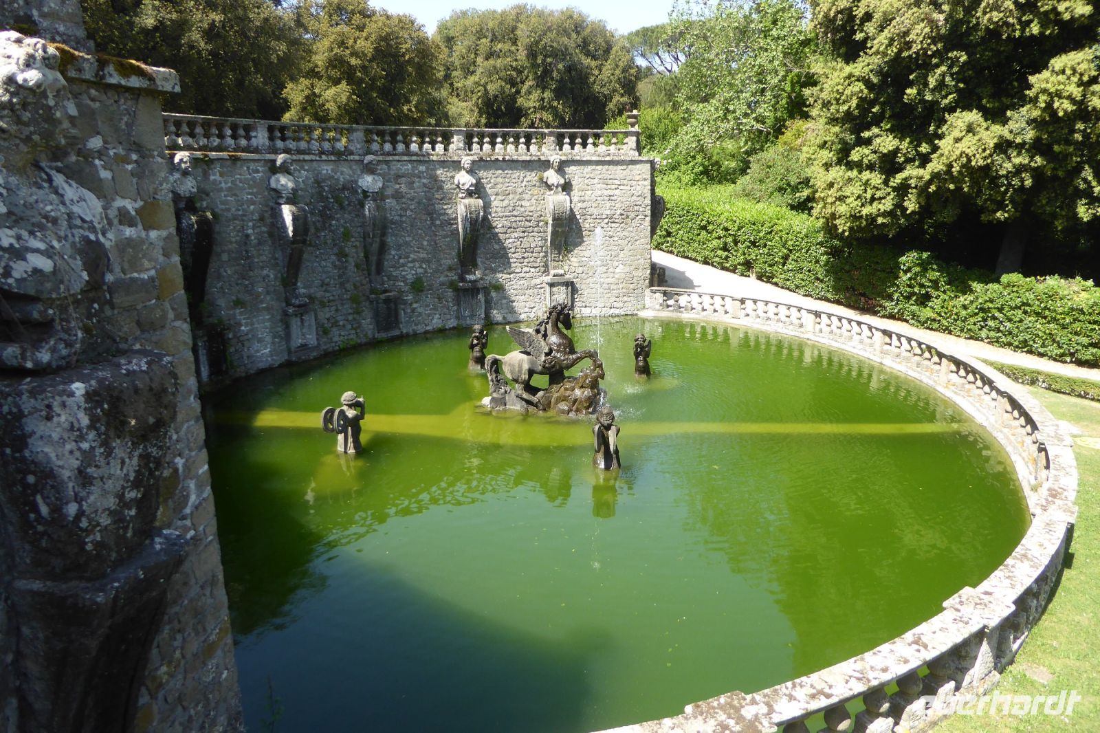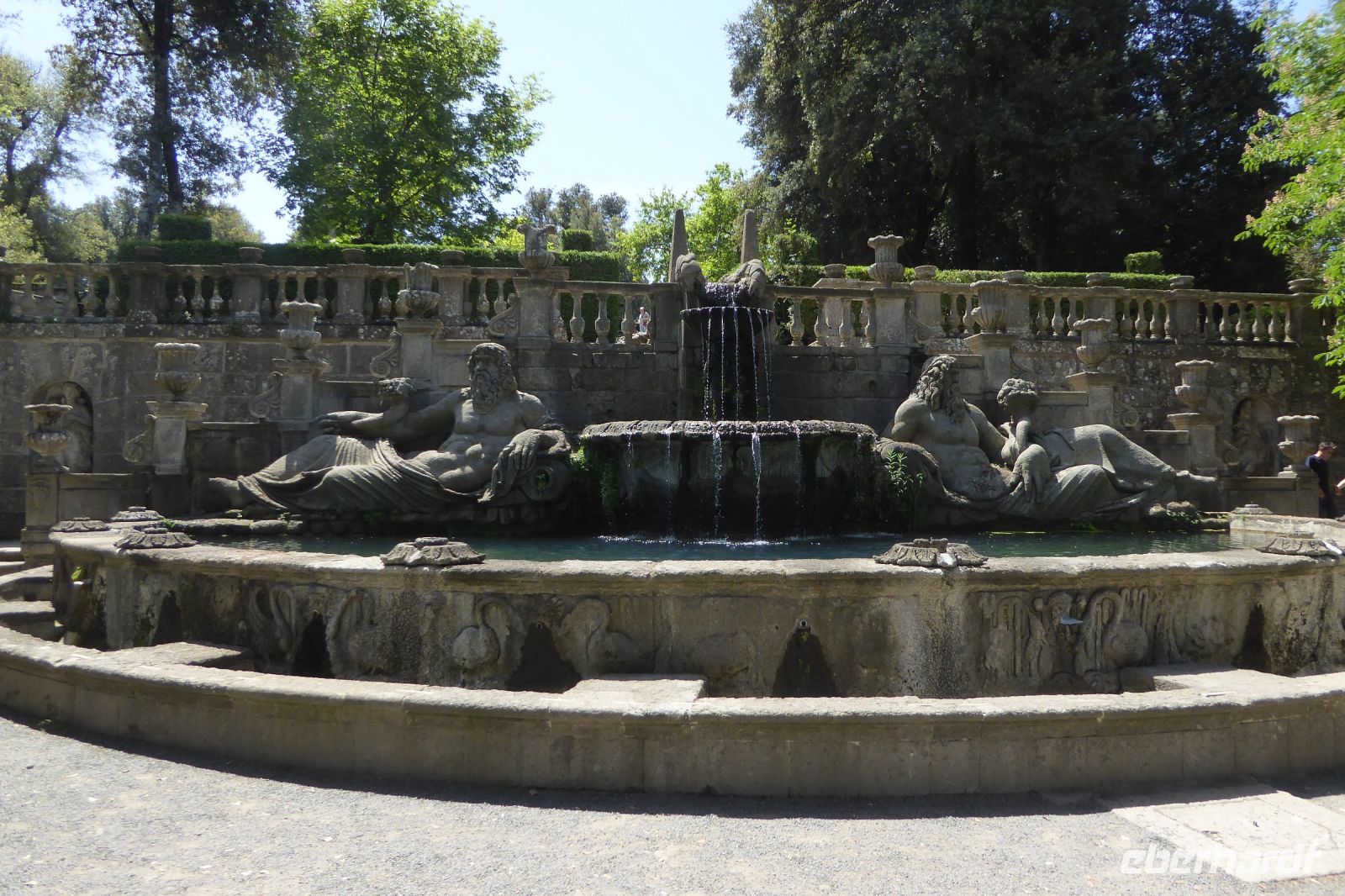 Mit dem Besuch in der Villa Lante im kleinen Ort Bagnaia, waren wir wieder in der Toskana und bestaunten dieses Mal einen der typischen Renaissancegärten Mittelitaliens. Diese Gärten waren Orte des geselligen Vergnügens und strahlten Lebensfreude aus. Der Mensch rückt in den Mittelpunkt der Betrachtung, philosophische und religiöse Themen bewegen die Menschen und die Wissenschaft setzt neue Akzente. Weltliche sowie kirchliche Fürsten verspüren das Bedürfnis nach Repräsentanz und statten ihre Adelssitze nach antikem Vorbild mit Statuen, Gemälden und Brunnenanlagen aus. Der Garten tritt in eine Beziehung zur Umgebung, Grenzen scheinen sich aufzuheben und der Blick des Betrachters weitet sich. Es entsteht ein Spiel mit der vom Menschen geschaffenen "Kunstnatur" und der natürlichen Umgebung. f1477 errichtet Kardinal Raffaele Riario für Papst Leo X das erste Gebäude, einen Jagdpavillon. Hundert Jahre später übernahm Kardinal Francesco Gambara das Gebäude und ließ zwei weitere Häuser errichten. In die Symmetrie eingepasst liegt ein Labyrinthgarten auf der Terrasse unterhalb der sogenannten Casini. Im Zentrum befindet sich eine quadratische Brunnenanlage mit einem kreisförmigen Becken in der Mitte. Vier Figuren,