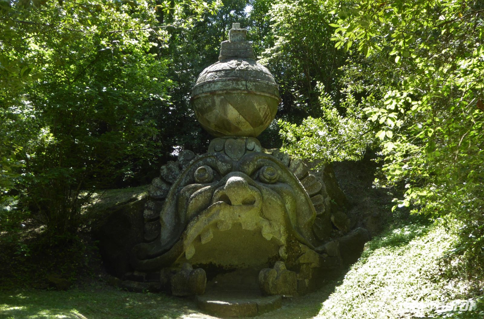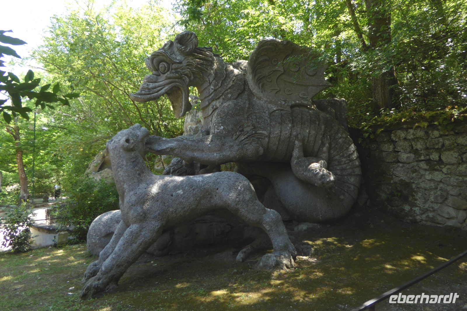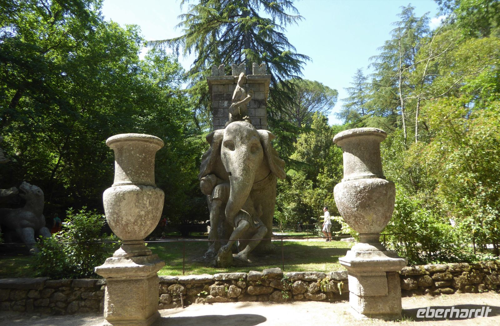 Es ist liegt im Wesen eines Gartens, lateinisch hortus, von einer Mauer, einem Zaun oder einer Hecke umfriedet zu sein. So wird der Garten zum Hort, den der Mensch ganz nach seinen Vorstellungen ausgestaltet. Das ist der kleinste gemeinsame Nenner aller unserer Gärten. Die Ausgestaltung der von uns besuchten Gärten könnte nicht unterschiedlicher sein! Heute stand die Fantasiewelt, die Vicino Orsini, der letzte Feudalherr von Bomarzo im sechzehnten Jahrhundert in einem kleinen bewaldeten Tal in der mittelitalienischen Provinz Viterbo am Nordrand der Region Latium hat entstehen lassen, auf unserem Programm. Der Park steckt voller Skulpturen und Inschriften, die mehr verwirren als erhellen. Gestalten der griechischen Mythologie verbinden sich mit antiken historischen und literarischen Motiven der Renaissance. Manches lässt sich interpretieren, andere Figurengruppen entziehen sich komplett jeglicher logischen Zuordnung. Die erste Idee für den Garten entstand nach dem Tod der Ehefrau Orsinis, Giulia Farnese. Er wollte eine Erinnerung für und über seine Gattin schaffen, die sie beide überdauert. Er beauftragte verschiedene Künstler monumentale Skulpturen zu erschaffen, die er in seinem Park, der nun „Sacro Bosco“, Heiliger Wald, genannt wurde, aufstellen ließ. In der „Casa pendente“, einem zweistöckigen Haus, das Orsini für seinen Freund, den Fürstbischof und Kardinal Christoph Madruzzo errichten ließ, gibt es keine rechten Winkel. Alles löst sich im Chaos und Verwirrung auf. Die gesamte Anlage ist als Gegenentwurf zum Park von Bagnaia (Villa Lante) mit seinen geraden Wegen und seiner augenfälligen Ordnung zu sehen, die Madruzzo als Spiritus Rector für Kardinal Giovan Francesco Gambara entwarf.