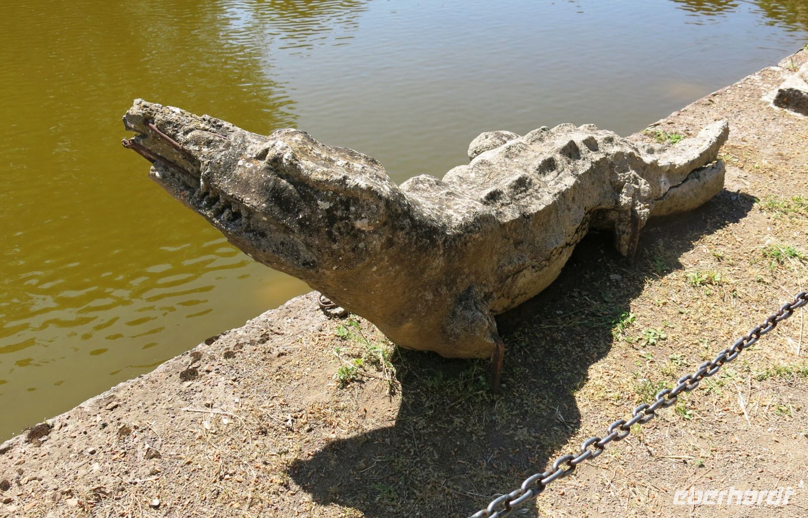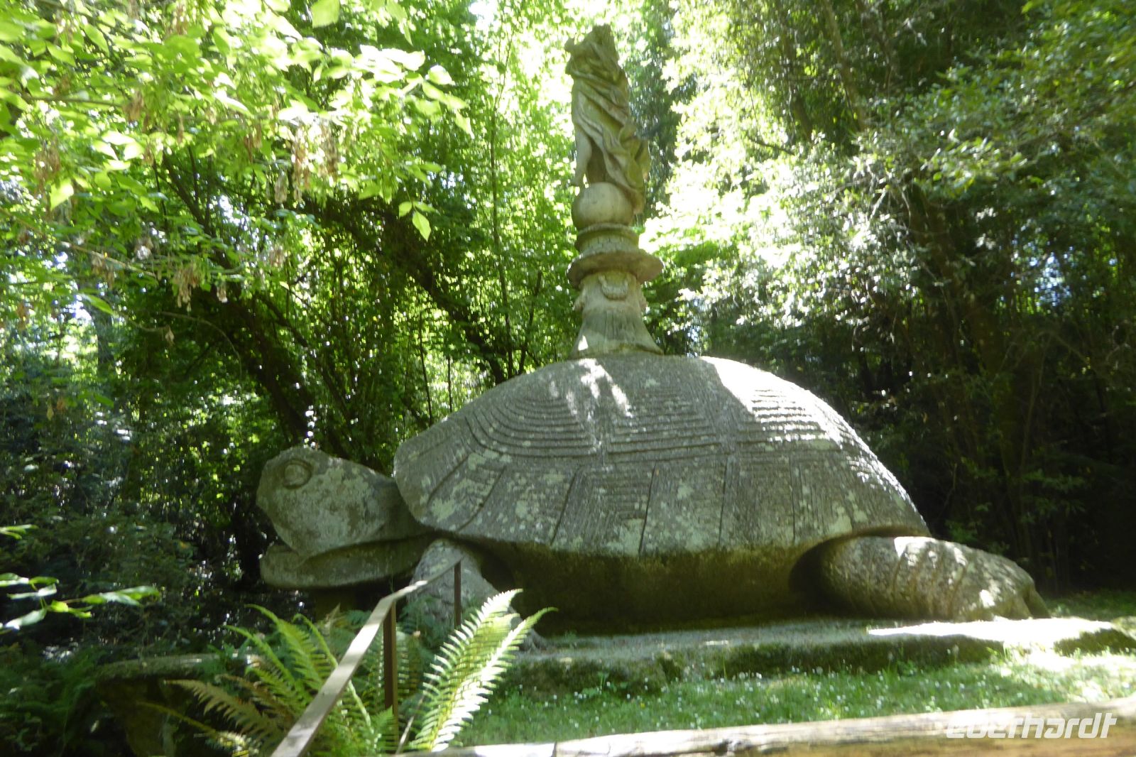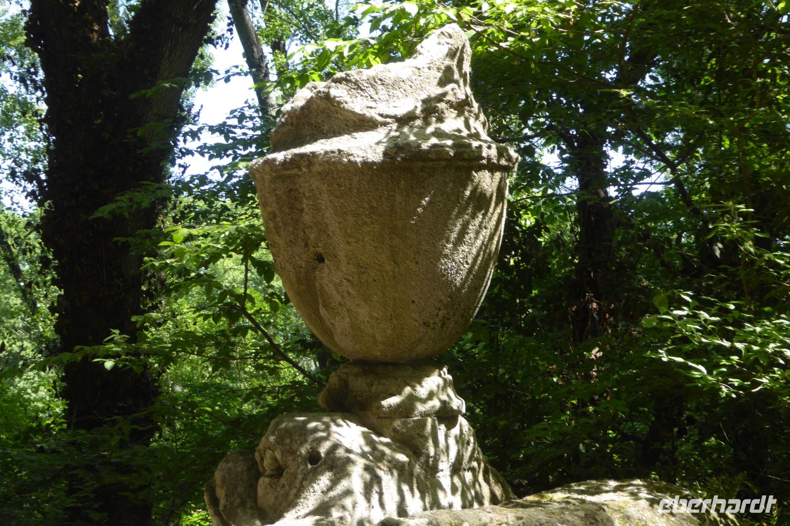 Es ist liegt im Wesen eines Gartens, lateinisch hortus, von einer Mauer, einem Zaun oder einer Hecke umfriedet zu sein. So wird der Garten zum Hort, den der Mensch ganz nach seinen Vorstellungen ausgestaltet. Das ist der kleinste gemeinsame Nenner aller unserer Gärten. Die Ausgestaltung der von uns besuchten Gärten könnte nicht unterschiedlicher sein! Heute stand die Fantasiewelt, die Vicino Orsini, der letzte Feudalherr von Bomarzo im sechzehnten Jahrhundert in einem kleinen bewaldeten Tal in der mittelitalienischen Provinz Viterbo am Nordrand der Region Latium hat entstehen lassen, auf unserem Programm. Der Park steckt voller Skulpturen und Inschriften, die mehr verwirren als erhellen. Gestalten der griechischen Mythologie verbinden sich mit antiken historischen und literarischen Motiven der Renaissance. Manches lässt sich interpretieren, andere Figurengruppen entziehen sich komplett jeglicher logischen Zuordnung. Die erste Idee für den Garten entstand nach dem Tod der Ehefrau Orsinis, Giulia Farnese. Er wollte eine Erinnerung für und über seine Gattin schaffen, die sie beide überdauert. Er beauftragte verschiedene Künstler monumentale Skulpturen zu erschaffen, die er in seinem Park, der nun „Sacro Bosco“, Heiliger Wald, genannt wurde, aufstellen ließ. In der „Casa pendente“, einem zweistöckigen Haus, das Orsini für seinen Freund, den Fürstbischof und Kardinal Christoph Madruzzo errichten ließ, gibt es keine rechten Winkel. Alles löst sich im Chaos und Verwirrung auf. Die gesamte Anlage ist als Gegenentwurf zum Park von Bagnaia (Villa Lante) mit seinen geraden Wegen und seiner augenfälligen Ordnung zu sehen, die Madruzzo als Spiritus Rector für Kardinal Giovan Francesco Gambara entwarf.