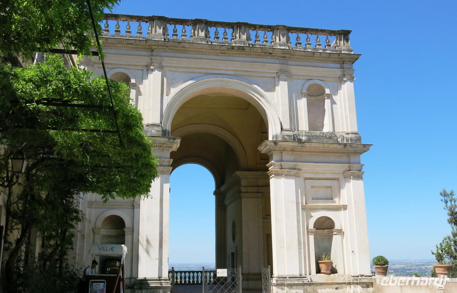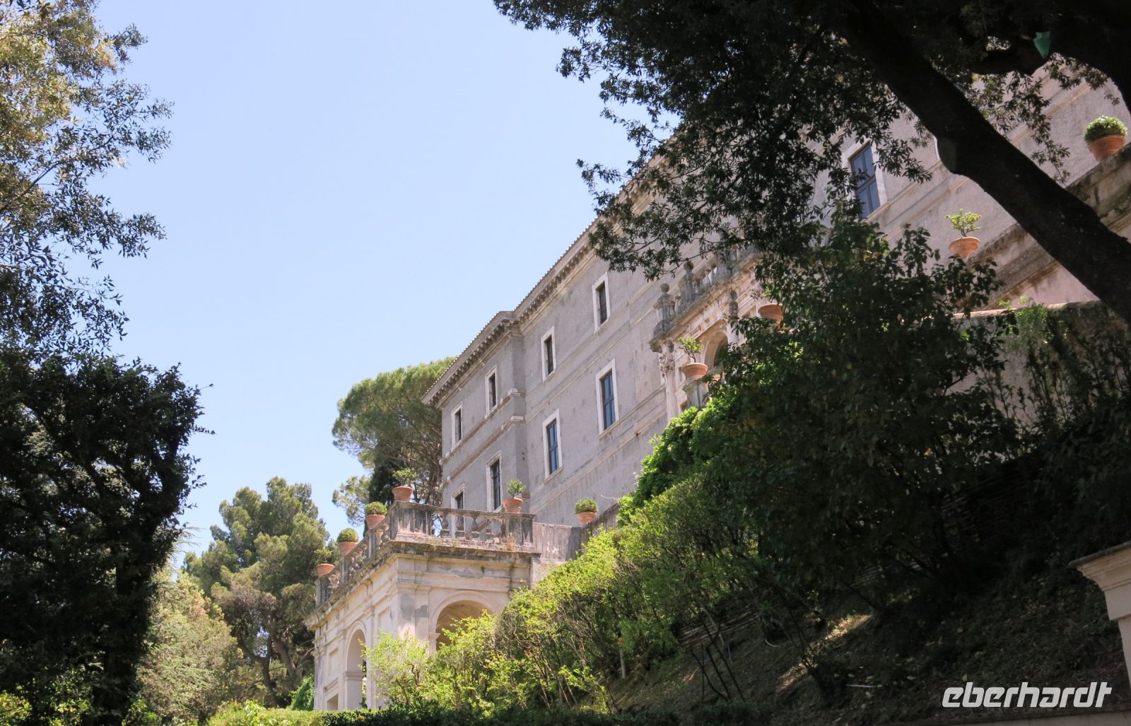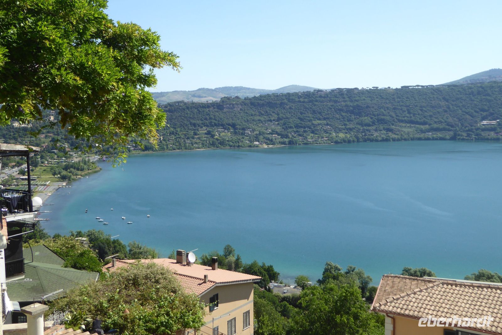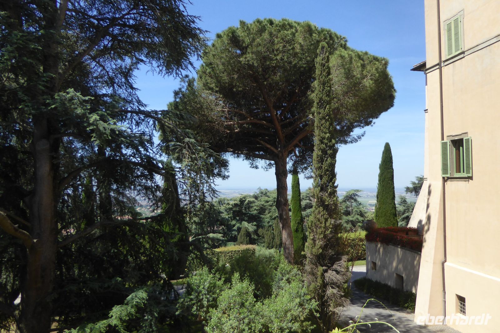 Weiter oben in den Albaner Bergen liegt Castel Gandolfo am Rand der Caldera eines erloschenen Vulkans. Der Albaner See liegt auf dem Kratergrund, 130 m unterhalb der Stadt. Die Stadt gilt als eine der schönsten Orte Italiens. Bekannt ist die Stadt wegen des hier befindlichen Papstpalastes , der seit dem siebzehnten Jahrhundert den Päpsten als Sommerresidenz dient. Auf Beschluss Papst Franziskus´ ist die Anlage seit 2016 als Museum allgemein zugänglich. Papst Benedikt XVI nutzte die Residenz während seines Pontifikats das ganze Jahr über häufig zur Erholung. Nach seinem Amtsverzicht am 28. Februar 2013 hat er sich erst hierher zurückgezogen. Heute lebt er im Vatikan im Kloster Mater Ecclesiae. Die Residenz ist ein Komplex von drei Villen auf einer Fläche von 55 Hektar. Aufgrund der günstigen Lage an der Via Appia und dem angenehmen Klima in den Bergen wurden schon im römischer Zeit zahlreiche Villen errichtet. Die größte der Villen ließ Kaiser Domitian, im ersten Jahrhundert nach Christus gerrichten. Die Villa ist der Vorgängerbau des heutigen päpstlichen Palastes. Die Ruinen sind in die weitläufige päpstliche Gartenanlage bei der Villa Barberini integriert. Der terrassierte Garten ist ganz im Stil der Renaissance klar und linear angelegt. Antike Statuen, Brunnen, große Terracottavasen und Pflanzgefäße mit Zitronenbäumen vervollständigen den prachtvollen Eindruck. Dazu kommt noch die grandiose Aussicht auf die Ebene mit der ewigen Stadt Rom. Bei gutem Wetter sieht man sogar das glitzernde Meer am Horizont. Auf der anderen Seite liegt der Albaner See. Hinter dem Garten befindet sich ein Bauernhof, der seit Generationen von den Gärtnern im Dienst des Papstes mitversorgt wird. Dessen Produkte bereichern bis heute die Tafel des Papstes, werden aber auch im Hofladen in Albano zum Kauf angeboten.