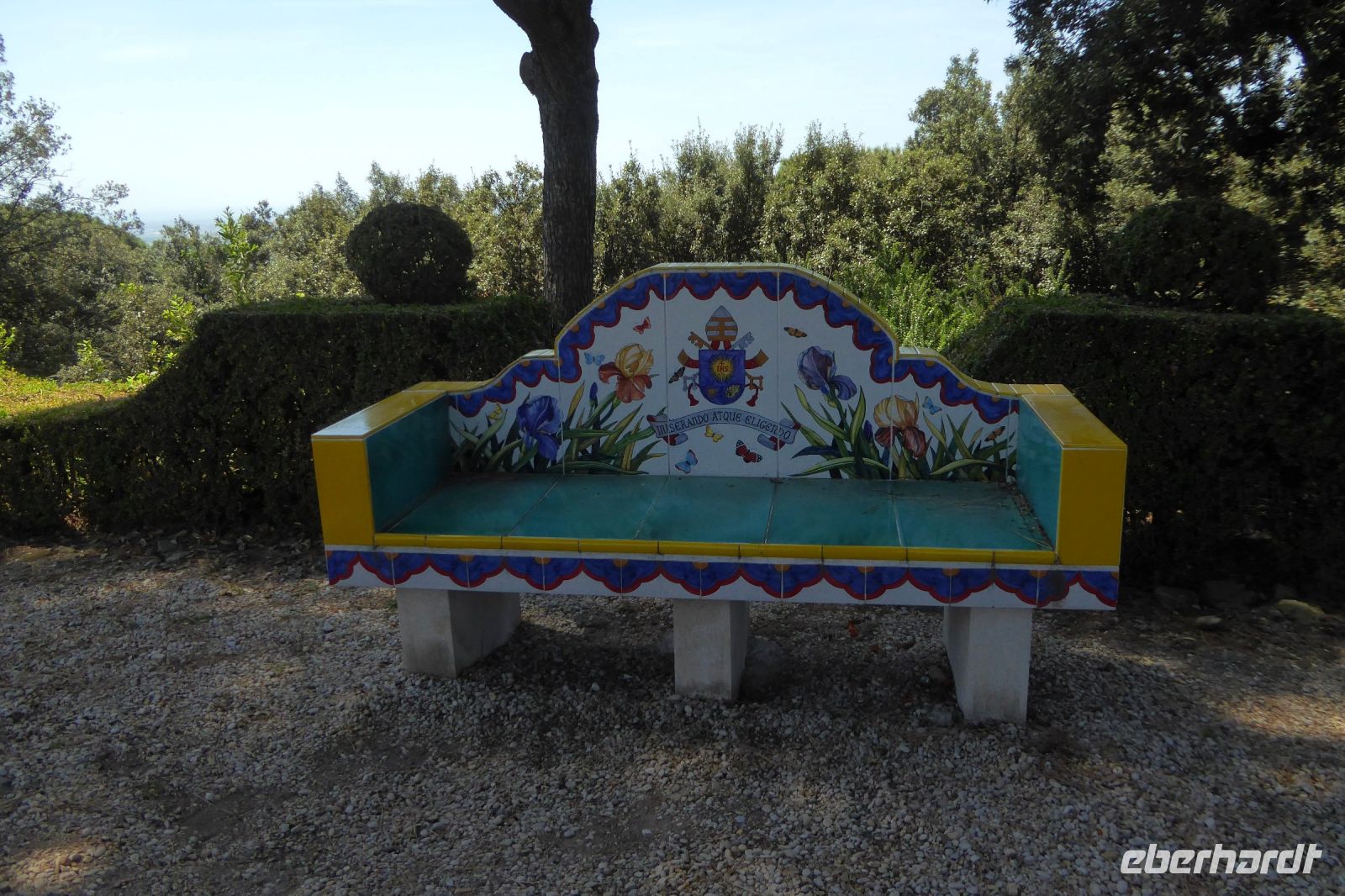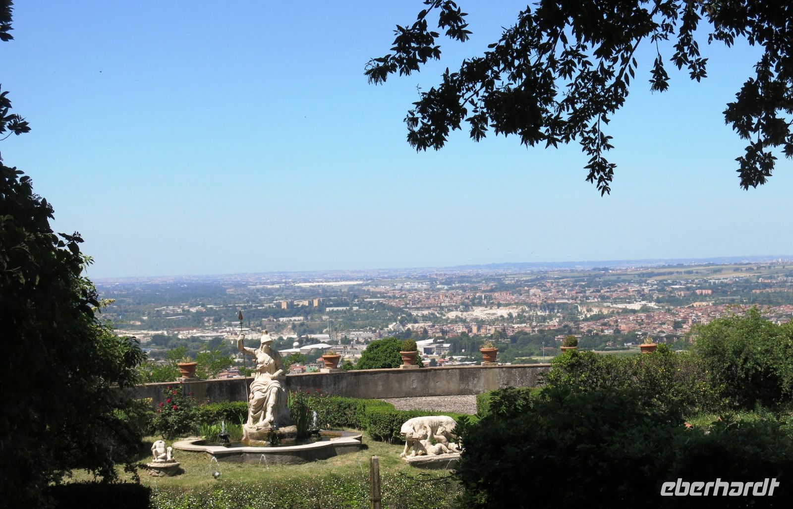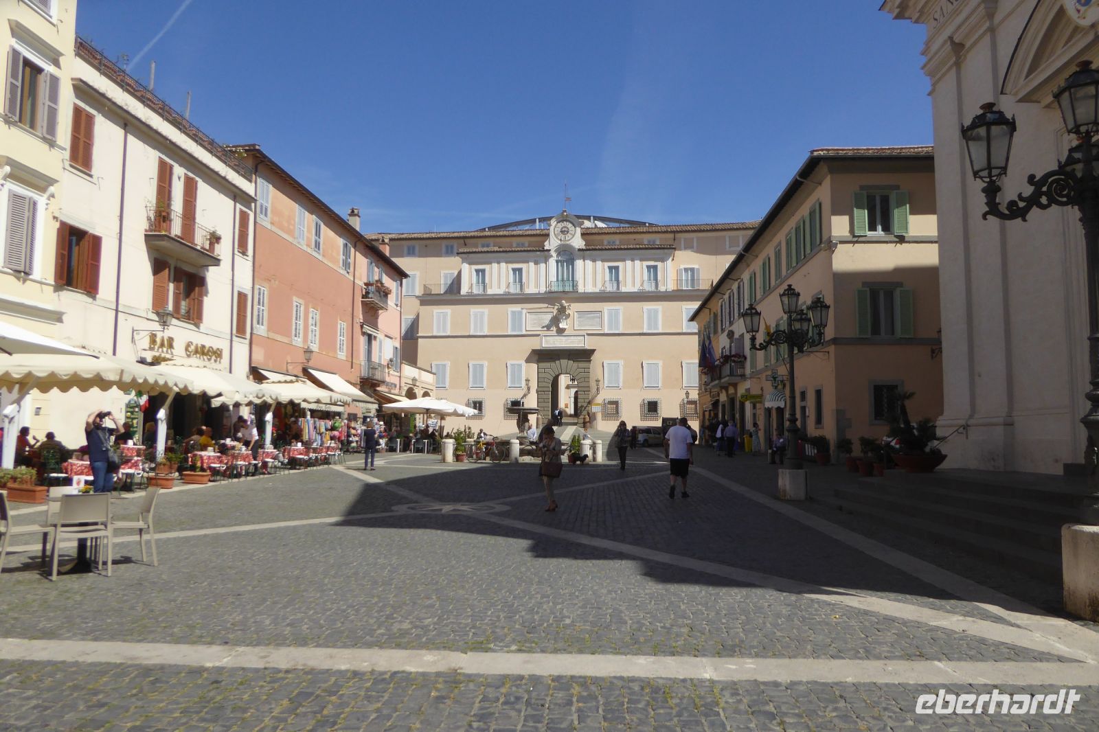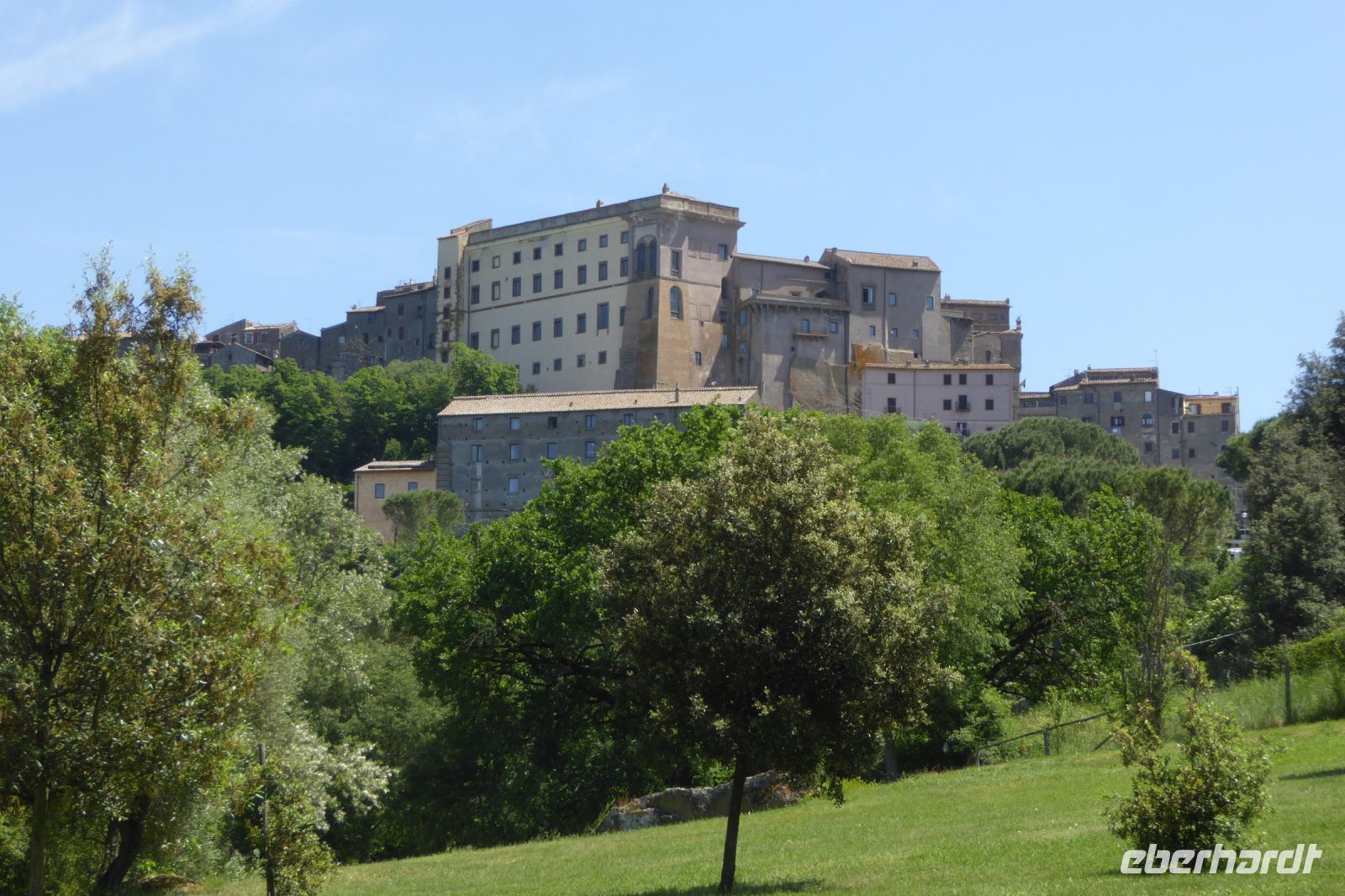 Weiter oben in den Albaner Bergen liegt Castel Gandolfo am Rand der Caldera eines erloschenen Vulkans. Der Albaner See liegt auf dem Kratergrund, 130 m unterhalb der Stadt. Die Stadt gilt als eine der schönsten Orte Italiens. Bekannt ist die Stadt wegen des hier befindlichen Papstpalastes , der seit dem siebzehnten Jahrhundert den Päpsten als Sommerresidenz dient. Auf Beschluss Papst Franziskus´ ist die Anlage seit 2016 als Museum allgemein zugänglich. Papst Benedikt XVI nutzte die Residenz während seines Pontifikats das ganze Jahr über häufig zur Erholung. Nach seinem Amtsverzicht am 28. Februar 2013 hat er sich erst hierher zurückgezogen. Heute lebt er im Vatikan im Kloster Mater Ecclesiae. Die Residenz ist ein Komplex von drei Villen auf einer Fläche von 55 Hektar. Aufgrund der günstigen Lage an der Via Appia und dem angenehmen Klima in den Bergen wurden schon im römischer Zeit zahlreiche Villen errichtet. Die größte der Villen ließ Kaiser Domitian, im ersten Jahrhundert nach Christus gerrichten. Die Villa ist der Vorgängerbau des heutigen päpstlichen Palastes. Die Ruinen sind in die weitläufige päpstliche Gartenanlage bei der Villa Barberini integriert. Der terrassierte Garten ist ganz im Stil der Renaissance klar und linear angelegt. Antike Statuen, Brunnen, große Terracottavasen und Pflanzgefäße mit Zitronenbäumen vervollständigen den prachtvollen Eindruck. Dazu kommt noch die grandiose Aussicht auf die Ebene mit der ewigen Stadt Rom. Bei gutem Wetter sieht man sogar das glitzernde Meer am Horizont. Auf der anderen Seite liegt der Albaner See. Hinter dem Garten befindet sich ein Bauernhof, der seit Generationen von den Gärtnern im Dienst des Papstes mitversorgt wird. Dessen Produkte bereichern bis heute die Tafel des Papstes, werden aber auch im Hofladen in Albano zum Kauf angeboten.