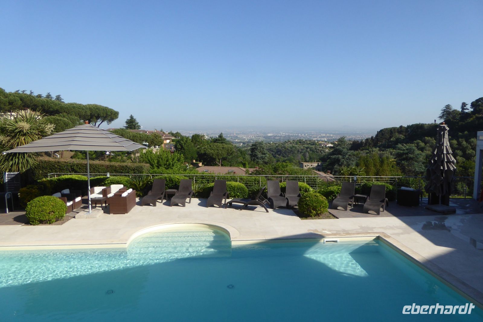 Mit Blick auf den hauseigenen Pool speisten wir im Panoramarestaurant des Hotels und genossen den Blick auf die Lichter der Stadt Rom.