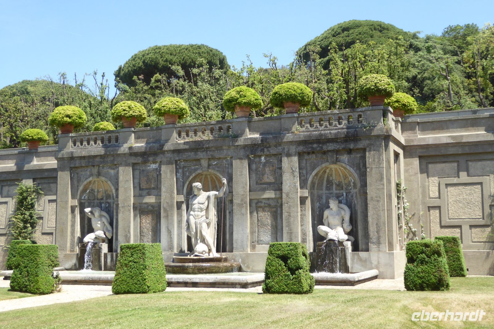 nackte Jünglinge, Taddeo Lantini zugeschrieben, halten das Wappen des Kardinals Montalto. Hinter den Casini steigt das Gelände an. Auf jeder Geländestufe befindet sich ein thematischer Brunnen. Durch den Tisch des Kardinals, eine vierzehn Meter lange Steinplatte, fließt kühles Wasser. Der Gigantenbrunnen wird von einem verspielten Wasserlauf gespeist. Und überall entdeckt man den roten Krebs, Gambero, das Wappentier des Kardinals. Beeindruckend in diesem schattigen Grund sind die wunderschönen blühenden Rhododendren und Azaleen.