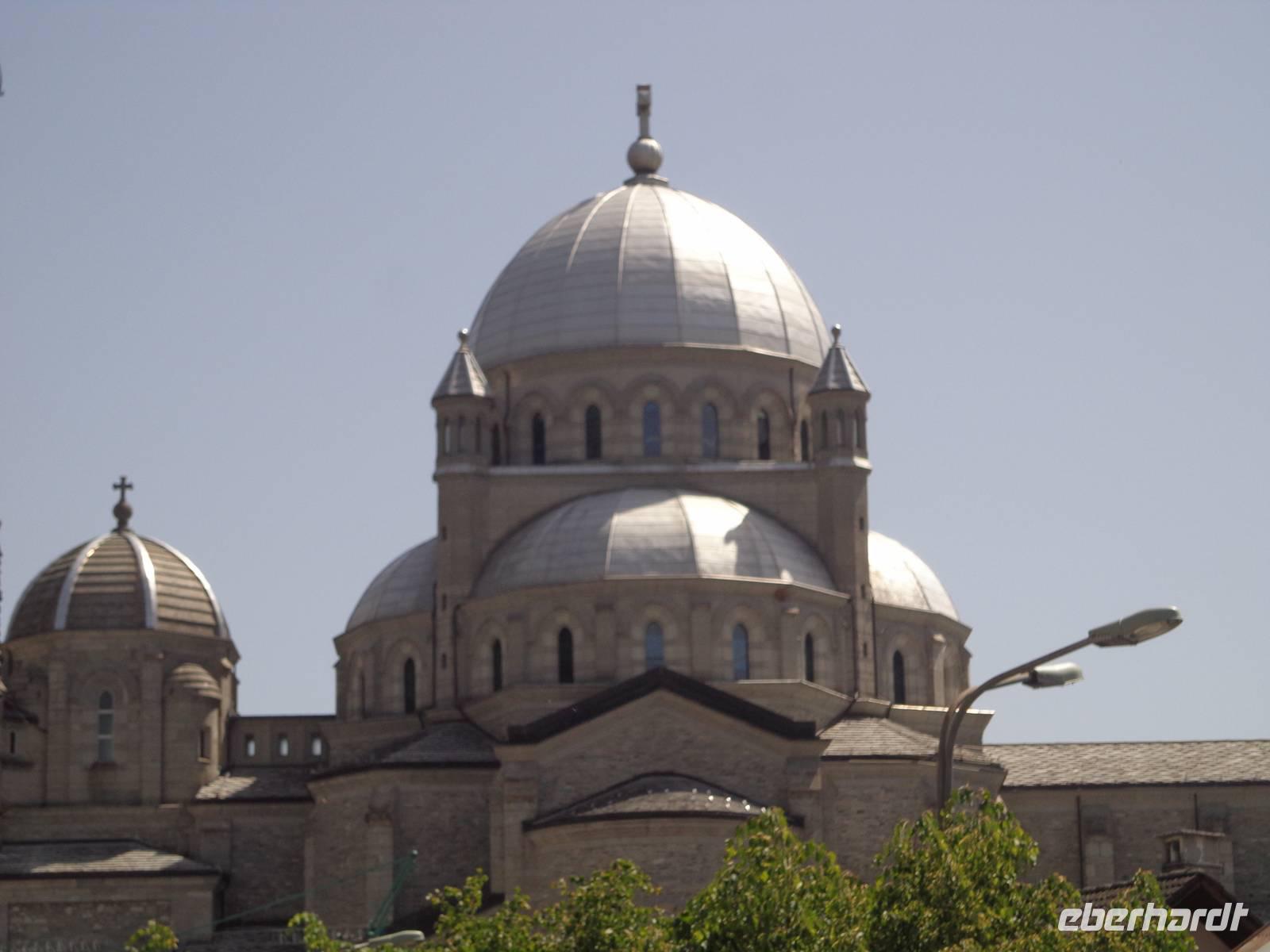 Die Kirche ist eine Kombination aus alter und neuer Kirche. Die Neue Wallfahrtskirche, aus Granit im byzantinischen Stil wurde 1956 geweiht. Im Inneren führen blaue Bänder den Blickfang