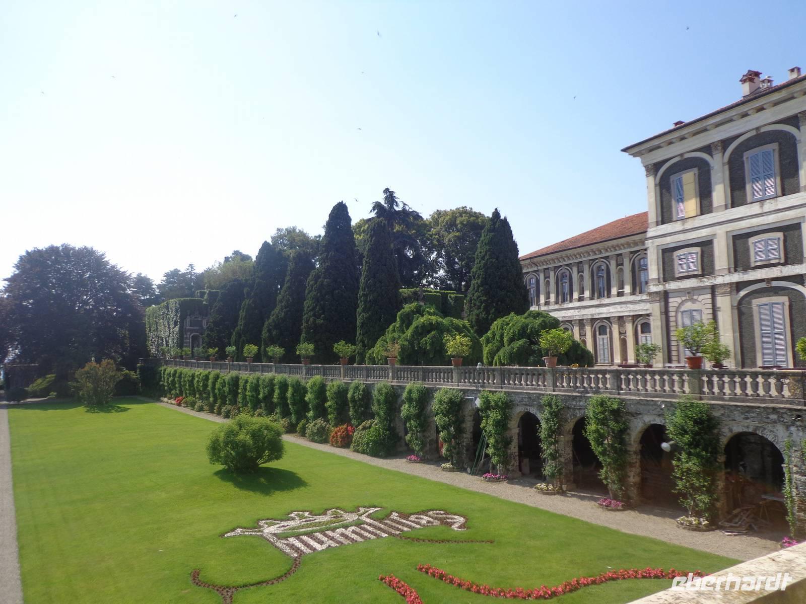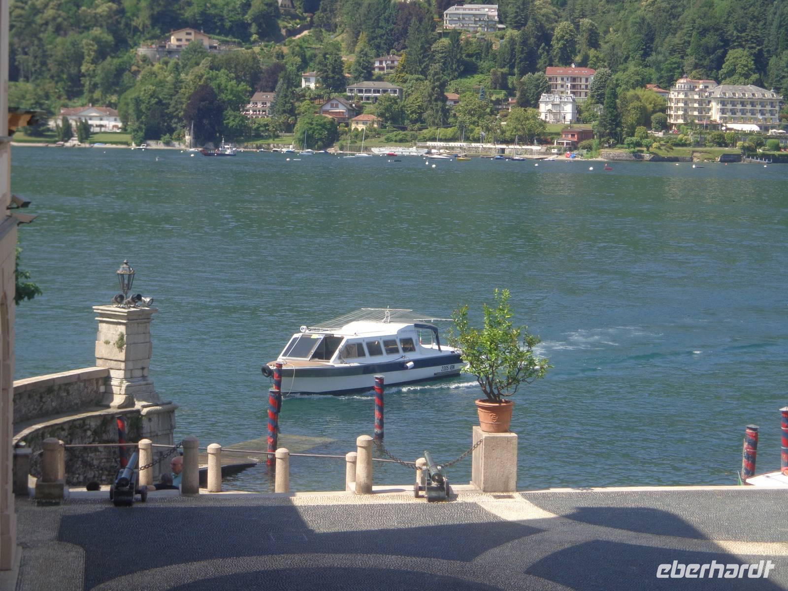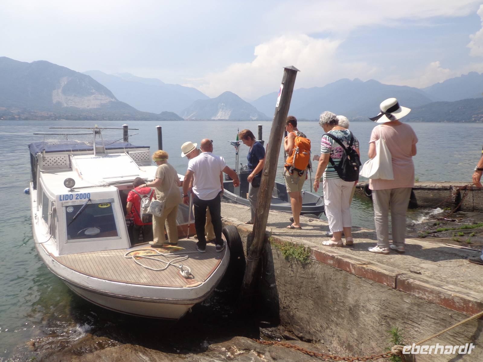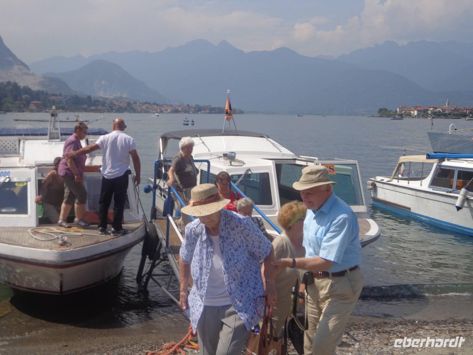 Unser Buschauffeur hat heute seinen Ruhetag. Ausgeruht unternehmen wir einen kleinen Spaziergang zur Anlegestelle der Privatboote. Auf unserem Programm stehen heute die bekannten Inseln im boromäischen Golf. Zunächst bringen uns die Boote zur Isola Bella, der berühmtesten im gleichnamigen Golf im Lago Maggiore. Sie ist ein geschaffenes Kunstwerk, mit dem Palazzo und dem terrassenförmig angelegtem Barockgarten. Bei einer Palastführung mit Romeo durchlaufen wir unter anderem den „Saal der Medaillen", den „Saal der Musik", den „Ballsaal" sehen das Dokument der Konferenz von Stresa, bestaunen den Mosaiktisch und die zahlreichen originalen Möbel, Bilder und die Wandteppiche. Im Anschluss an die Palastführung erreichen wir den Garten. Hier blühen die Rosen und Hortensien, die Pfauen schreiten stolz durch die Anlage und hoch über allem thront das Einhorn, ein Symbol der Familie Boromeo. Die Adelsfamilie ist auch in der heutigen Zeit im Besitz der Isola Bella - ebenso der Isola Madre. Diese erreichen wir am zeitigen Nachmittag. Auch hier haben wir für unsere Reisegruppe eine Palastführung bestellt. Unsere Gästeführerin erwartet uns schon. Anders als auf der Isola Bella erwartet uns hier ein Palazzo der zum wohnen genutzt wurde. Anders als im Palast auf der Isola Bella sind im Palazzo auf der Isola Madre keine originalen Möbel zu sehen. Vielmehr sind es Einrichtungsgegenstände die aus verschiedenen Palästen der Familie aus Mailand stammen.. Besonders sehenswert sind die alten Theaterkulissen und die dazu gehörigen Marionetten. Auch die automatische Tür erweckt die Aufmerksamkeit unserer Reisegäste. Bekannt ist die Isola Madre auch für ihren botanischen Garten, mit der Zypresse aus Kaschmir verschiedenen exotischen Pflanzen und freilaufenden Fasanen und Pfauen. Unseren Reisegästen bleibt Zeit, bei einem Capuccino, die Ausblicke zu genießen, bevor wir mit den Booten zurück fahren.