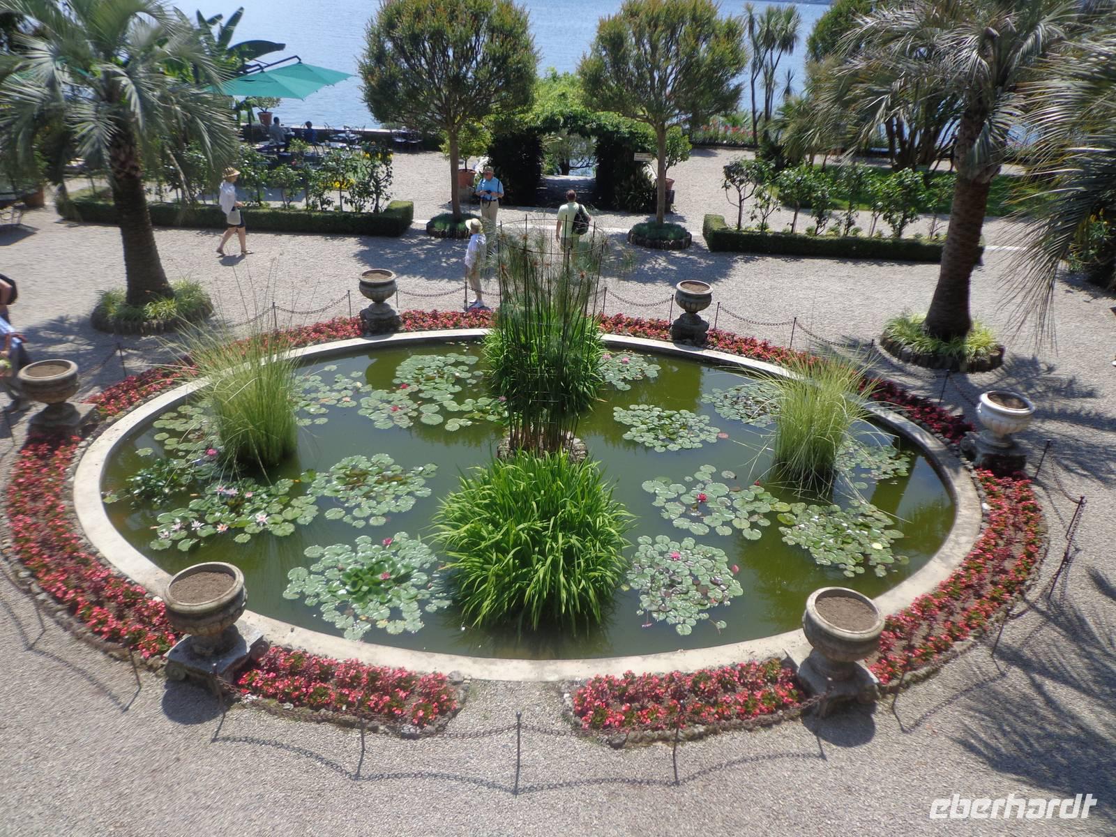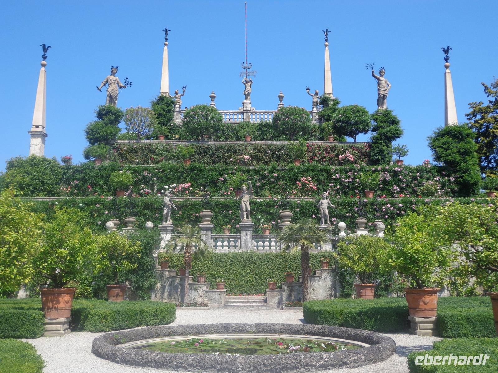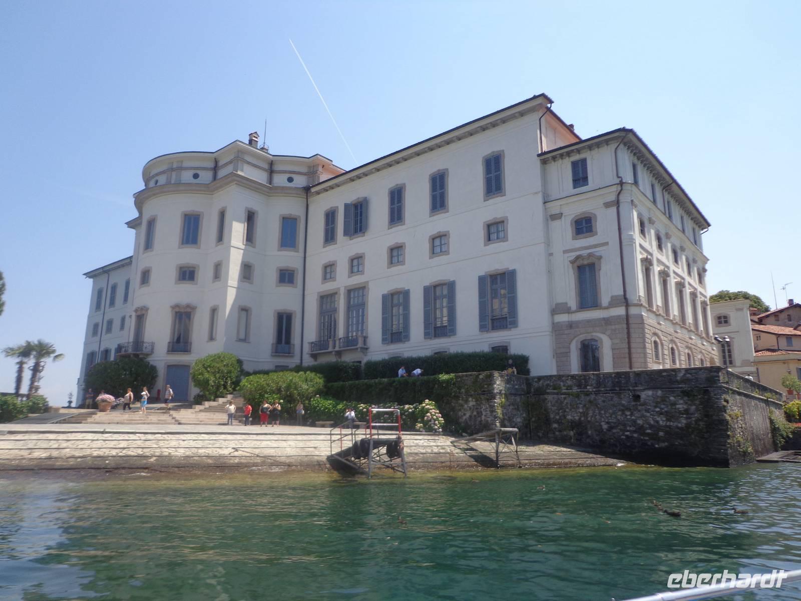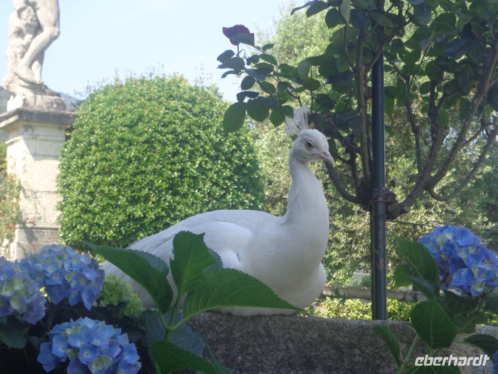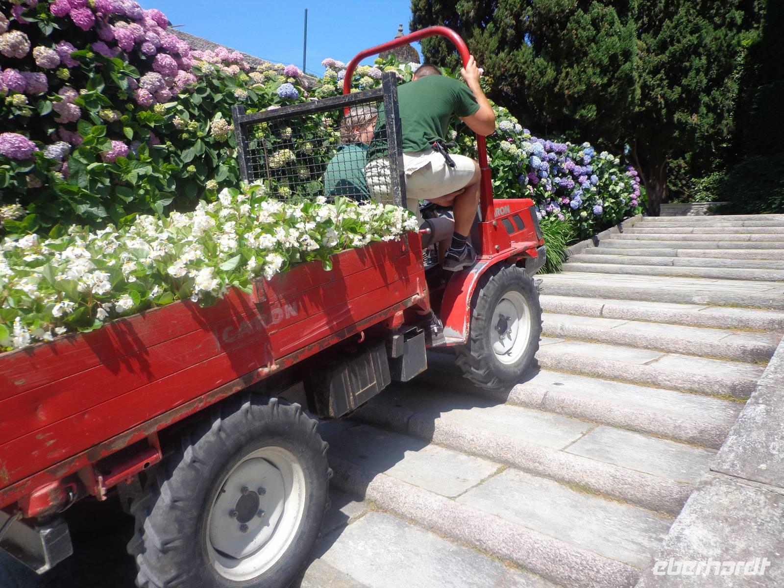 Unser Buschauffeur hat heute seinen Ruhetag. Ausgeruht unternehmen wir einen kleinen Spaziergang zur Anlegestelle der Privatboote. Auf unserem Programm stehen heute die bekannten Inseln im boromäischen Golf. Zunächst bringen uns die Boote zur Isola Bella, der berühmtesten im gleichnamigen Golf im Lago Maggiore. Sie ist ein geschaffenes Kunstwerk, mit dem Palazzo und dem terrassenförmig angelegtem Barockgarten. Bei einer Palastführung mit Romeo durchlaufen wir unter anderem den „Saal der Medaillen", den „Saal der Musik", den „Ballsaal" sehen das Dokument der Konferenz von Stresa, bestaunen den Mosaiktisch und die zahlreichen originalen Möbel, Bilder und die Wandteppiche. Im Anschluss an die Palastführung erreichen wir den Garten. Hier blühen die Rosen und Hortensien, die Pfauen schreiten stolz durch die Anlage und hoch über allem thront das Einhorn, ein Symbol der Familie Boromeo. Die Adelsfamilie ist auch in der heutigen Zeit im Besitz der Isola Bella - ebenso der Isola Madre. Diese erreichen wir am zeitigen Nachmittag. Auch hier haben wir für unsere Reisegruppe eine Palastführung bestellt. Unsere Gästeführerin erwartet uns schon. Anders als auf der Isola Bella erwartet uns hier ein Palazzo der zum wohnen genutzt wurde. Anders als im Palast auf der Isola Bella sind im Palazzo auf der Isola Madre keine originalen Möbel zu sehen. Vielmehr sind es Einrichtungsgegenstände die aus verschiedenen Palästen der Familie aus Mailand stammen.. Besonders sehenswert sind die alten Theaterkulissen und die dazu gehörigen Marionetten. Auch die automatische Tür erweckt die Aufmerksamkeit unserer Reisegäste. Bekannt ist die Isola Madre auch für ihren botanischen Garten, mit der Zypresse aus Kaschmir verschiedenen exotischen Pflanzen und freilaufenden Fasanen und Pfauen. Unseren Reisegästen bleibt Zeit, bei einem Capuccino, die Ausblicke zu genießen, bevor wir mit den Booten zurück fahren.