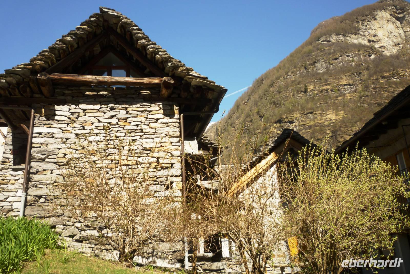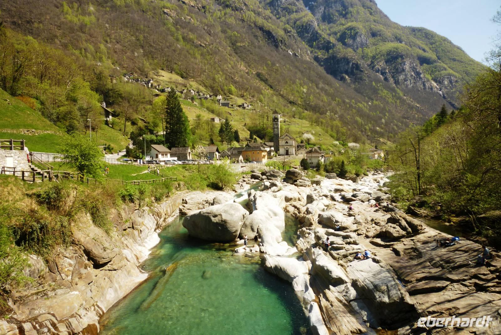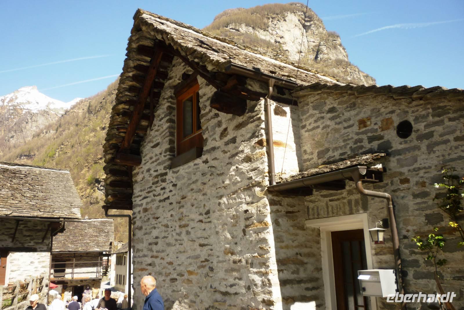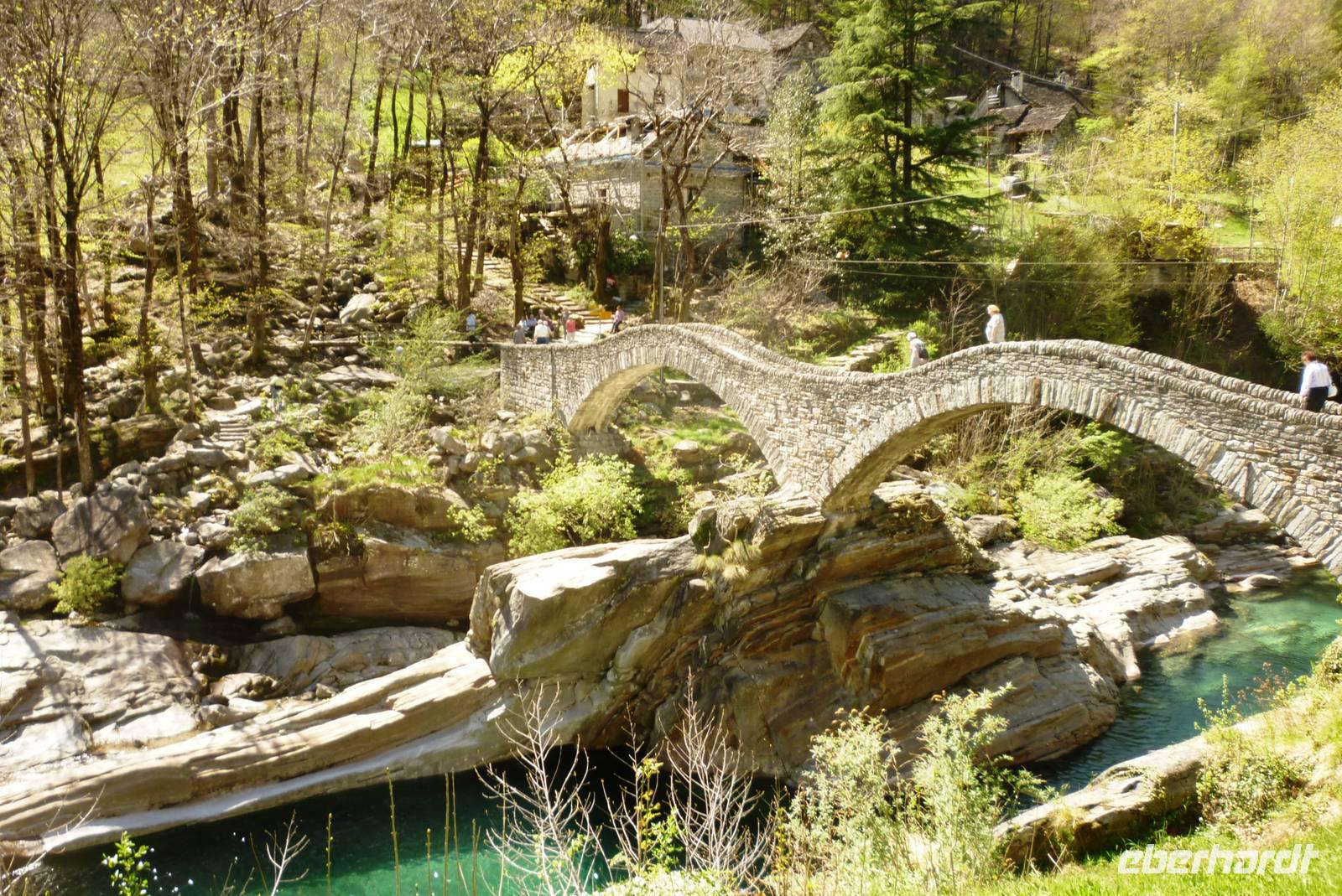 Weiter ging die Fahrt an den berühmten glattgeschliffenen riesigen Steinen im Fluß Verzasca vorbei. Bei Lavertezzo bestand die Möglichkeit, die alte Brücke Ponte dei Saltri zum Überqueren der wilden Verzasca zu nutzen. Vorbei an alten Bauerndörfern aus Steinplatten, Brücken, Kirchen gelangten wir bis zum letzten Dorf Sonogno. Nach Rundgängen im malerischen Ort traten wir die Rückfahrt an.