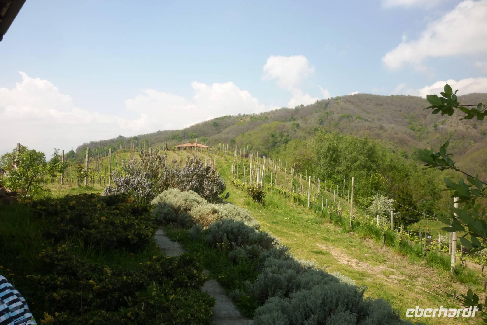 Weingut Podre ai Valloni. Die Wirtin empfing uns mit Picknick-Beutel und Wein. So bepackt wanderten wir in den Weinbergen am Gut auf einen Hügel, von dem aus eine herrliche Aussicht auf die Weinbau-Region möglich war. Gute Luft, gute Sicht, dazu Picknick und schönes Wetter, - eine gelungene Ausfahrt!