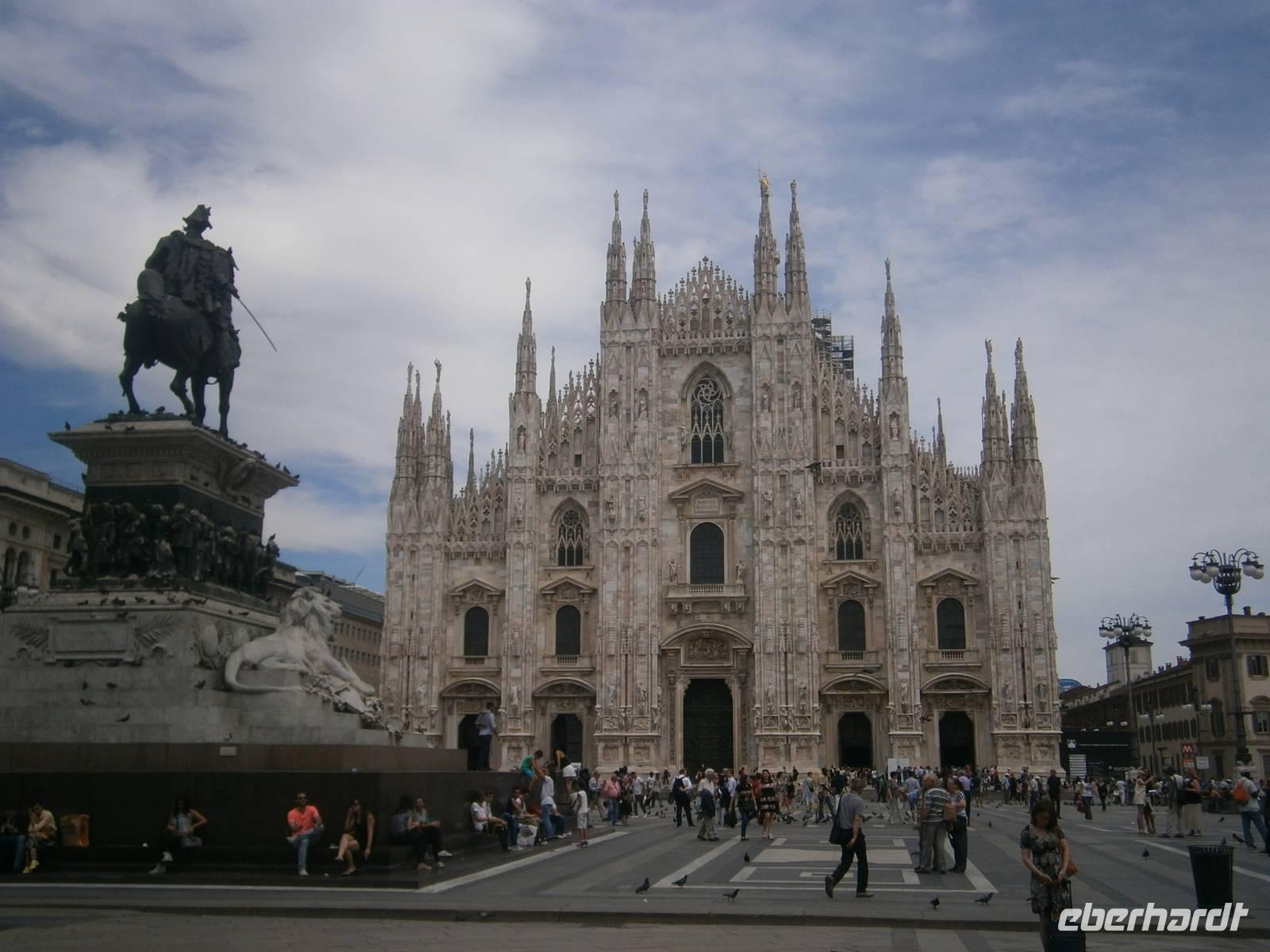 Durch die Galleria Vittorio Emmanuele erreichen wir die Piazza del Duomo, überragt vom Dom. Eines der berühmtesten Bauwerke Italiens. Der Dom ist 157 m lang und 109 m breit. Begonnen wurde mit dem Bau, unter Herzog Gian Galeazzo Visconti, Ende des 14. Jahrhunderts. Seine Bauzeit dauerte bis Mitte des 19. Jahrhunderts. Während seiner Bauzeit erlebte der Dom zahlreiche Baumeister. Vielfältige Stilformen sind in den Bau mit eingeflossen. Die ab dem 16. Jahrhundert begonnene Fassade ist im klassisch barockem Stil erbaut und Anfang des 19.Jahrhundert beendet. Der helle Marmor, stammt aus der Gegend vom Lago Maggiore, und die 4000 Statuen sind ein besonderes Merkmal für den Dom in Mailand. Besondere Aufmerksamkeit verdienen die Glasfenster. Die ältesten originalen Scheiben stammen aus dem 15. und 16. Jahrhundert. Der Einsatz von handgemalten Scheiben fand zu dieser Zeit seine größte Verbreitung. Mit Hilfe von Blei wurden sie dann zu ganzen Fenstern zusammen gesetzt. Noch etwas besonders steht auf dem Dach. Hoch oben auf der Domspitze glänzt die goldene Madonnina im Sonnenschein. Einige unserer Gäste nutzen die Zeit um auf das Dach des Mailänder Domes zu steigen und die fantastische Aussicht zu genießen. Die anderen nutzen die freie Zeit um sich modische Anregungen zu holen; denn Mailand ist ein teures Pflaster.