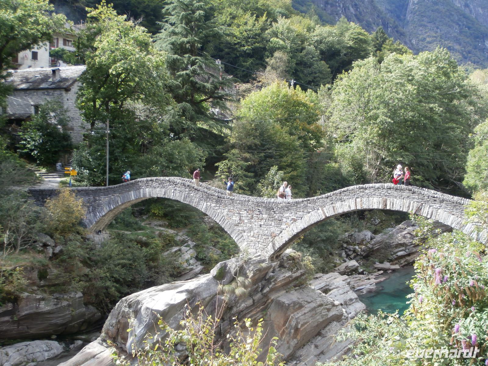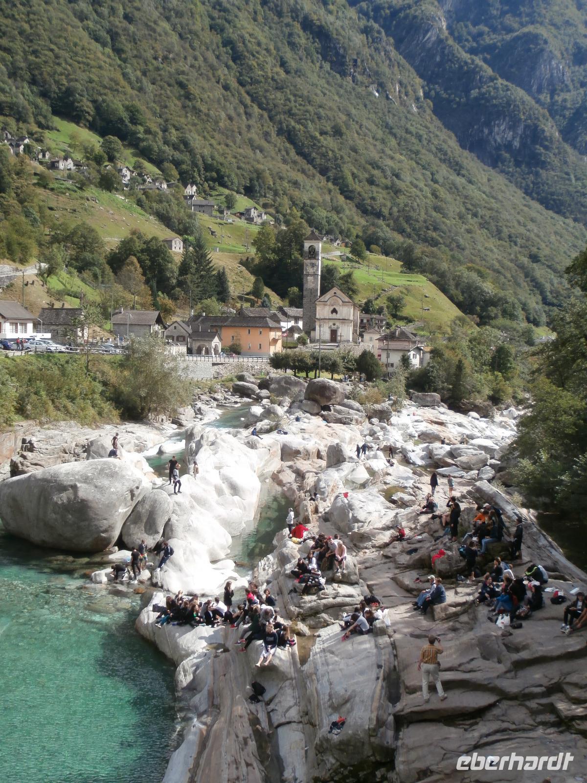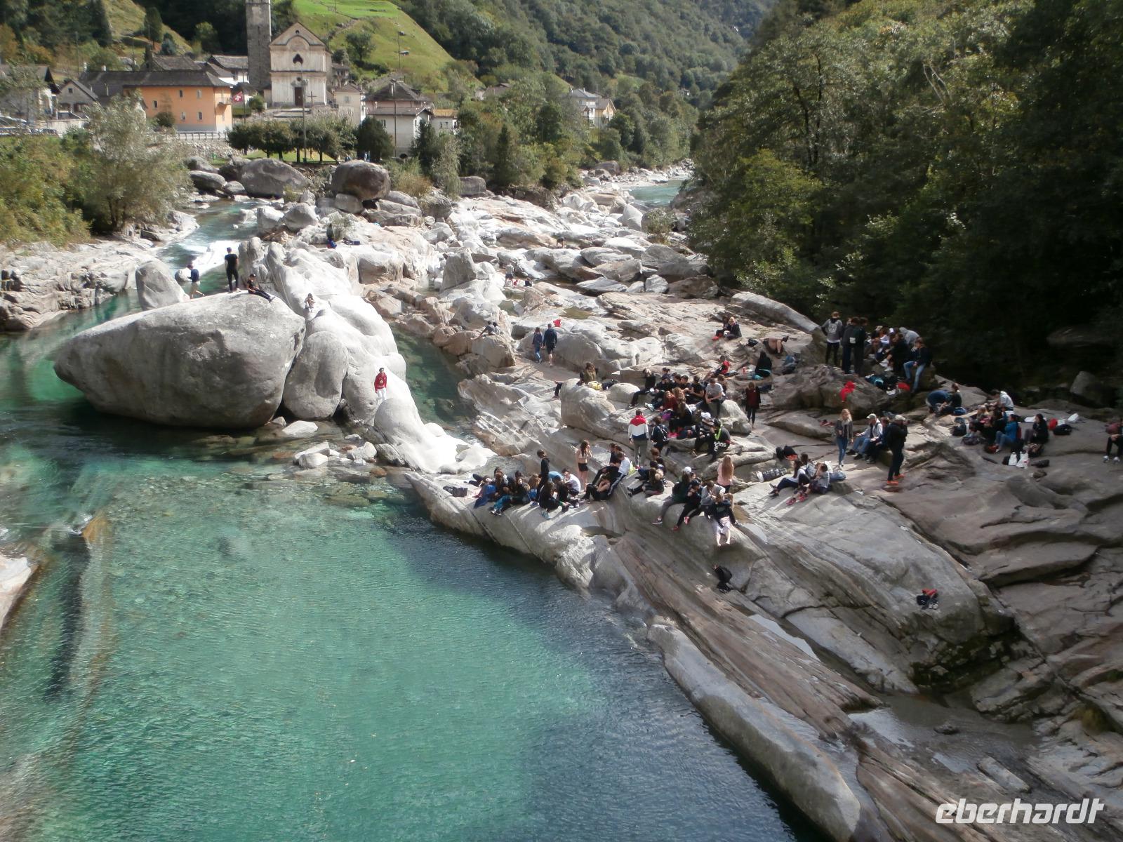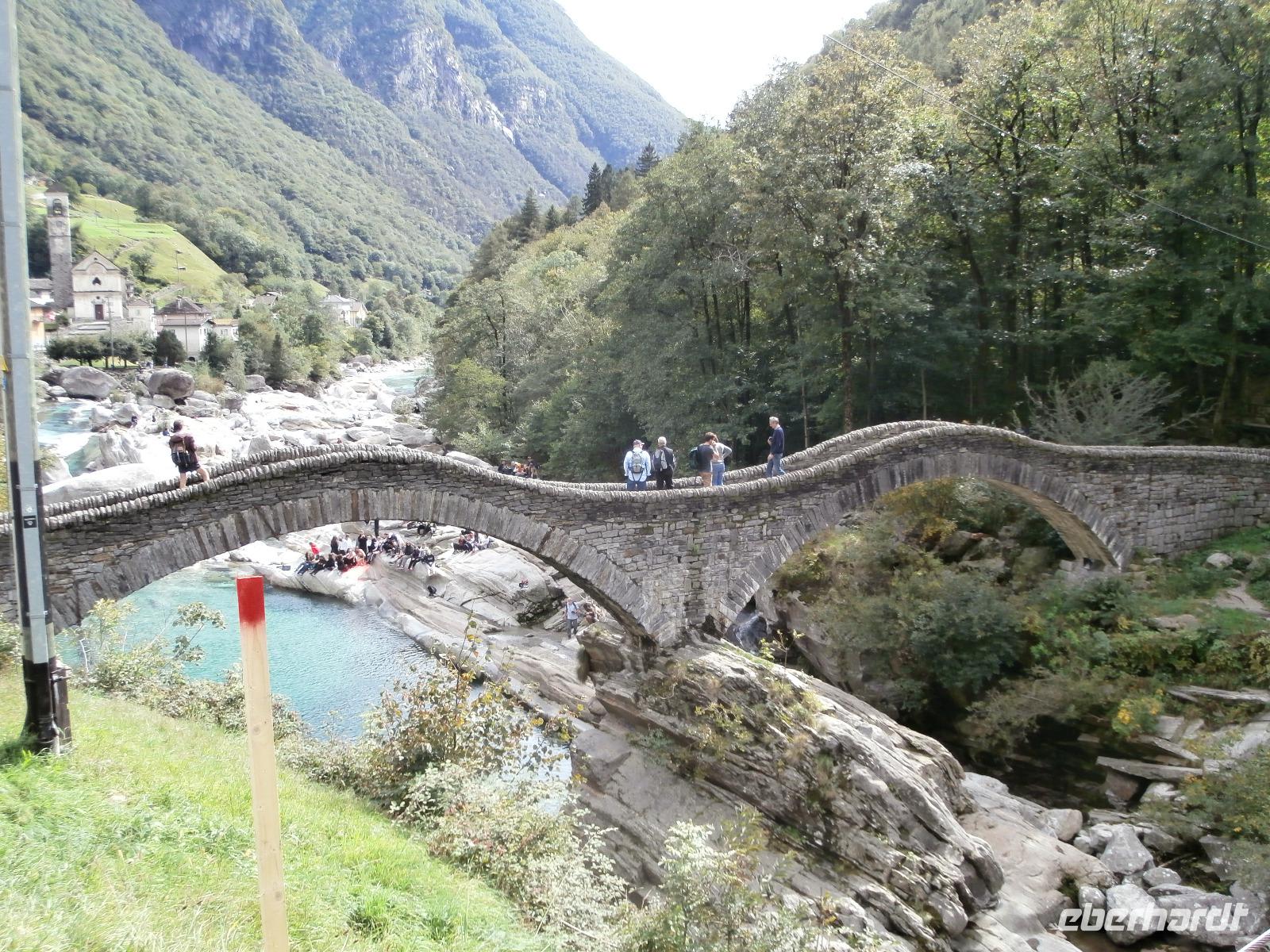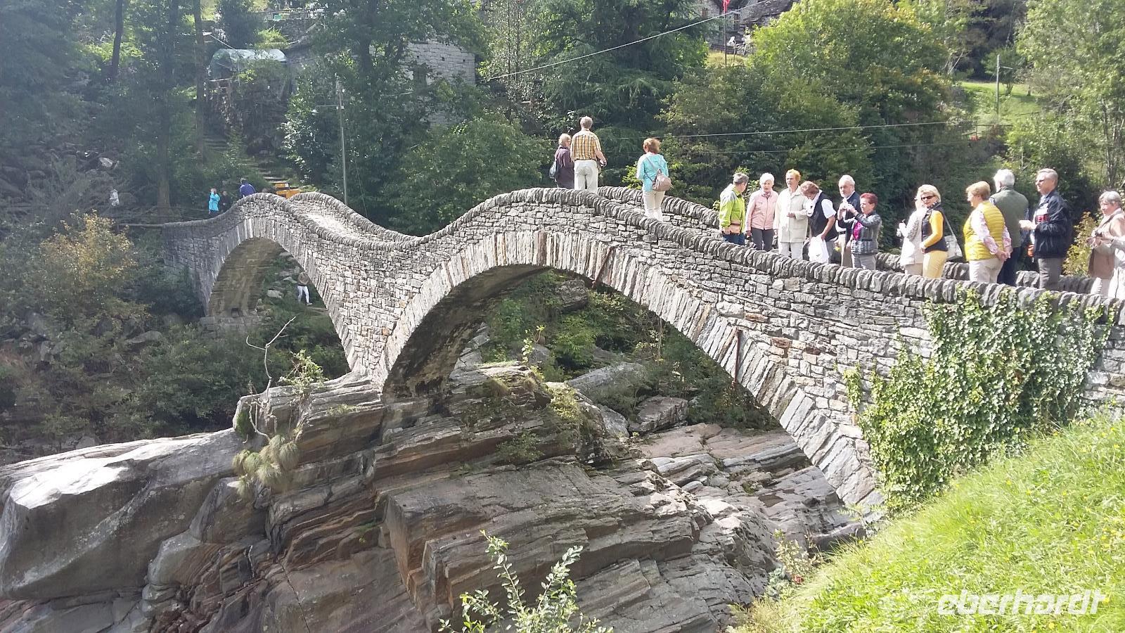 Wir sind hier am Lago Maggiore Glückskinder, verwöhnt mit tollem Wetter und das anders als vorausgesagt. Auch der heutige Ausflug in das Valle Verzasca ist bei schönem Wetter möglich. Entlang des Lago Maggiore fahren wir am Morgen, passieren die Schweizer Grenze und fahren an Ascona und Locarno vorbei in das fantastische Verzascatal, übersetzt auch das grüne Wasser und das sehen wir zwischen sehr großen Steinen, die das Wasser glatt und rund gehobelt hat, dahin fließen. Unseren ersten Stopp legen wir an der Staumauer „ La Selvatica" ein. Sie ist 220 Meter hoch und 380 m lang, wir spazieren auf ihr entlang. Von der Staumauer stürzte sich James Bond im Film „Golden Eye" in die Tiefe. Wir setzen unsere Fahrt im kurvenreichen Tal fort und der nächste Aufenthalt galt dem Ort Sonogno auf 918 m Höhe auch das letzte Dorf des Tales. Typische Häuser im gut erhaltenen Ortskern und die schöne Bepflanzung mit Sommerblumen begeistert uns alle. Zurück auf Fahrt im Verzascatal kommen wir an der römischen 2 Bogen Brücke „Ponte die Salti" an. Diese schöne mittelalterliche Brücke aus Stein ruht auf einem natürlichen Granitpfeiler. Viele junge Leute tummeln sich am grünlich schimmernden Wasser zwischen den glatt geschliffenen Steinen. Unser obligatorisches Gruppenbild nehmen wir hier auf.