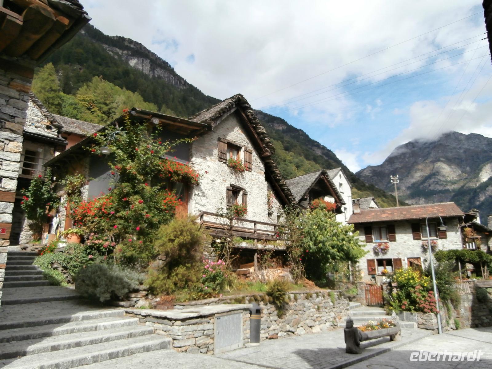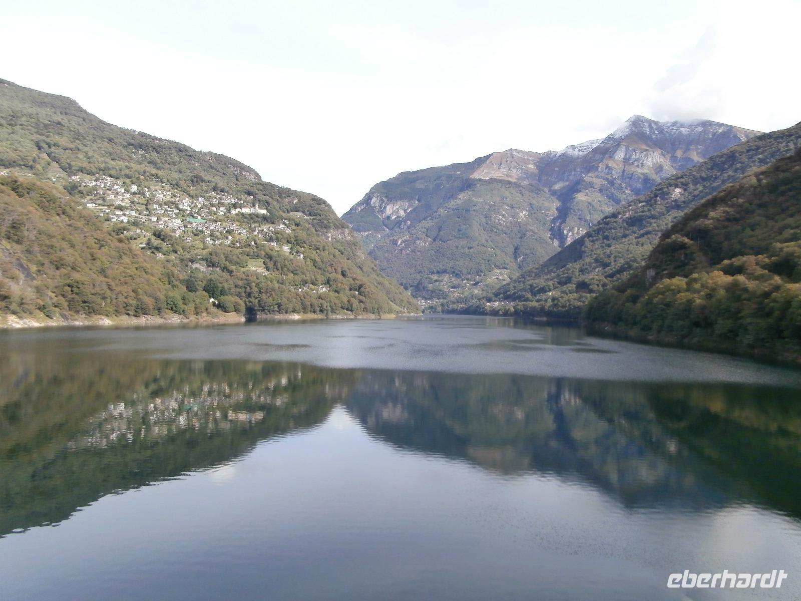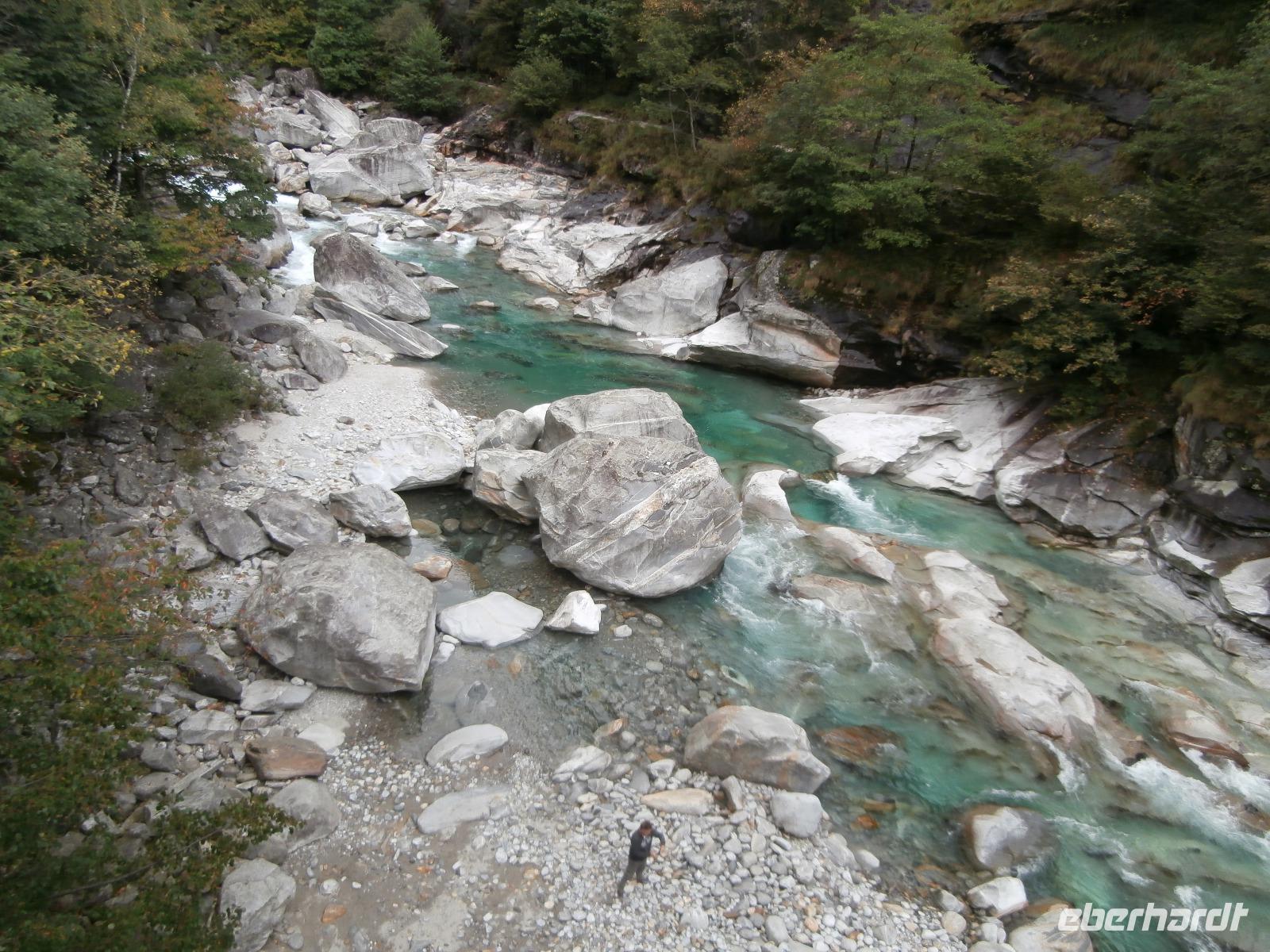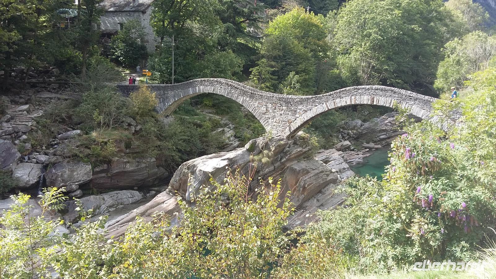 Wir sind hier am Lago Maggiore Glückskinder, verwöhnt mit tollem Wetter und das anders als vorausgesagt. Auch der heutige Ausflug in das Valle Verzasca ist bei schönem Wetter möglich. Entlang des Lago Maggiore fahren wir am Morgen, passieren die Schweizer Grenze und fahren an Ascona und Locarno vorbei in das fantastische Verzascatal, übersetzt auch das grüne Wasser und das sehen wir zwischen sehr großen Steinen, die das Wasser glatt und rund gehobelt hat, dahin fließen. Unseren ersten Stopp legen wir an der Staumauer „ La Selvatica" ein. Sie ist 220 Meter hoch und 380 m lang, wir spazieren auf ihr entlang. Von der Staumauer stürzte sich James Bond im Film „Golden Eye" in die Tiefe. Wir setzen unsere Fahrt im kurvenreichen Tal fort und der nächste Aufenthalt galt dem Ort Sonogno auf 918 m Höhe auch das letzte Dorf des Tales. Typische Häuser im gut erhaltenen Ortskern und die schöne Bepflanzung mit Sommerblumen begeistert uns alle. Zurück auf Fahrt im Verzascatal kommen wir an der römischen 2 Bogen Brücke „Ponte die Salti" an. Diese schöne mittelalterliche Brücke aus Stein ruht auf einem natürlichen Granitpfeiler. Viele junge Leute tummeln sich am grünlich schimmernden Wasser zwischen den glatt geschliffenen Steinen. Unser obligatorisches Gruppenbild nehmen wir hier auf.