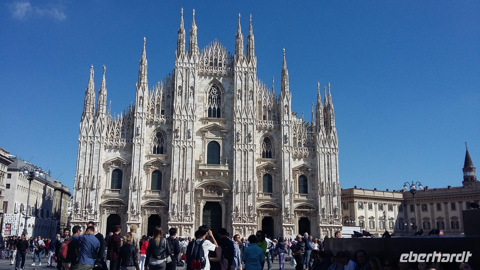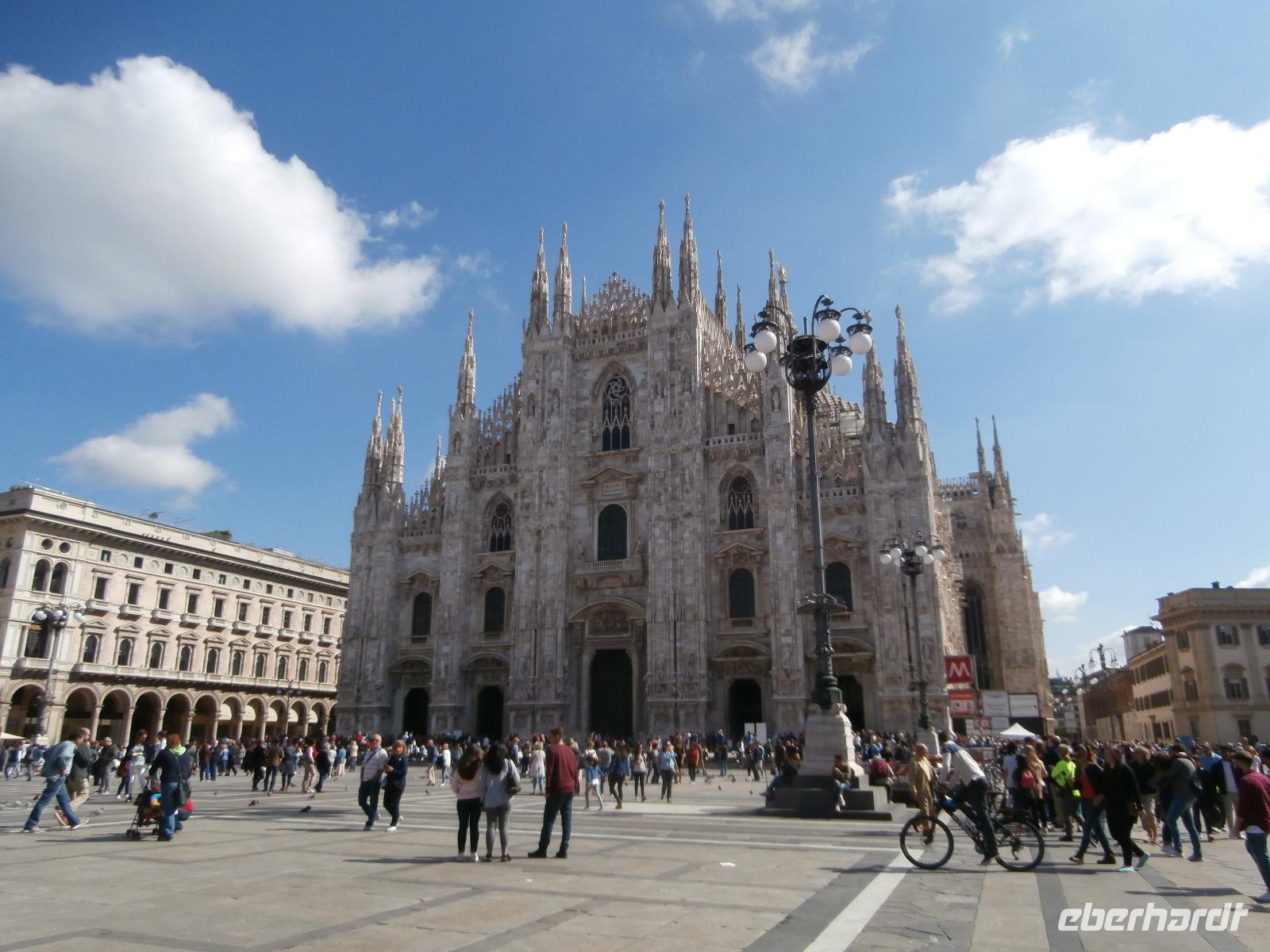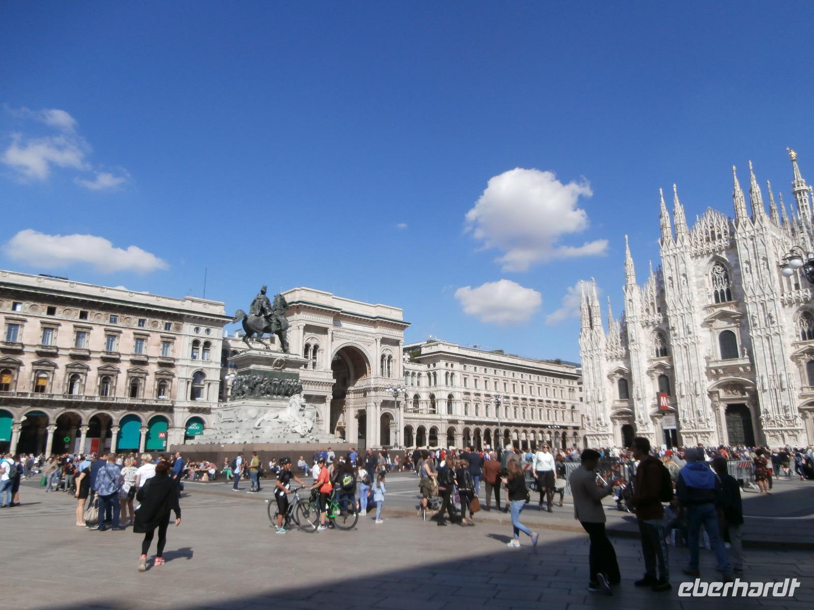 Verschiedene Radrennen in der Stadt machen eine Fahrt im Bus zum Zentrum unmöglich, deshalb nehmen wir die Straßenbahn bis hin zum Dom. Wie Zuckerbäckerwerk wirkt der Duomo, auf seinem Vierungsturm in 108 m Höhe wacht die vergoldete Marienstatue als Symbolfigur Mailands über das Wohl der Stadt. Bis Anfang des 16. JH war der Mailänder Dom die größte Kirche der Welt. Die Führung mit Mariarosa ist sehr informativ und die laufende Sonntagsmesse im Dom wir begleitet von Orgelspiel und Gesang. Der Himmel über uns ist heute azurblau, welch Wonne dieses herrliche Wetter. Wir spazieren gemeinsam durch die edle Galleria Vittorio Emanuele II., prächtig mit Mosaiken ausgestattet und teuren Geschäften. Unser Stadtrundgang endet am Piazza Della Scala, die Mailänder Scala ist der älteste im Original erhaltene Opernbau der Welt. Von außen etwas nüchtern das Bauwerk, begeistert die Scala mit einer prachtvollen Innenausstattung. Die Freizeit nutzen wir zum Shoppen in der Modestadt Mailand, zum Bummeln und Genießen im Sonnenschein.
