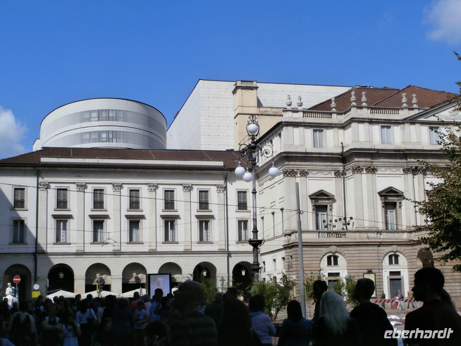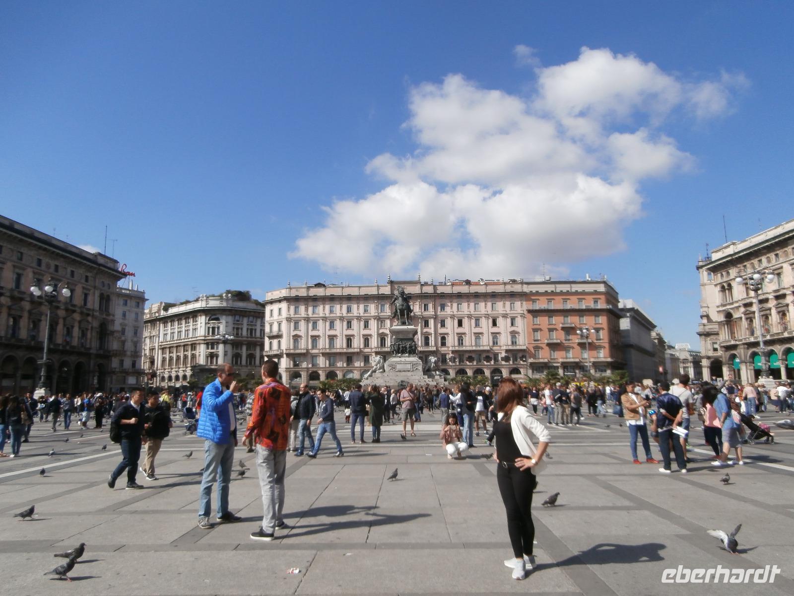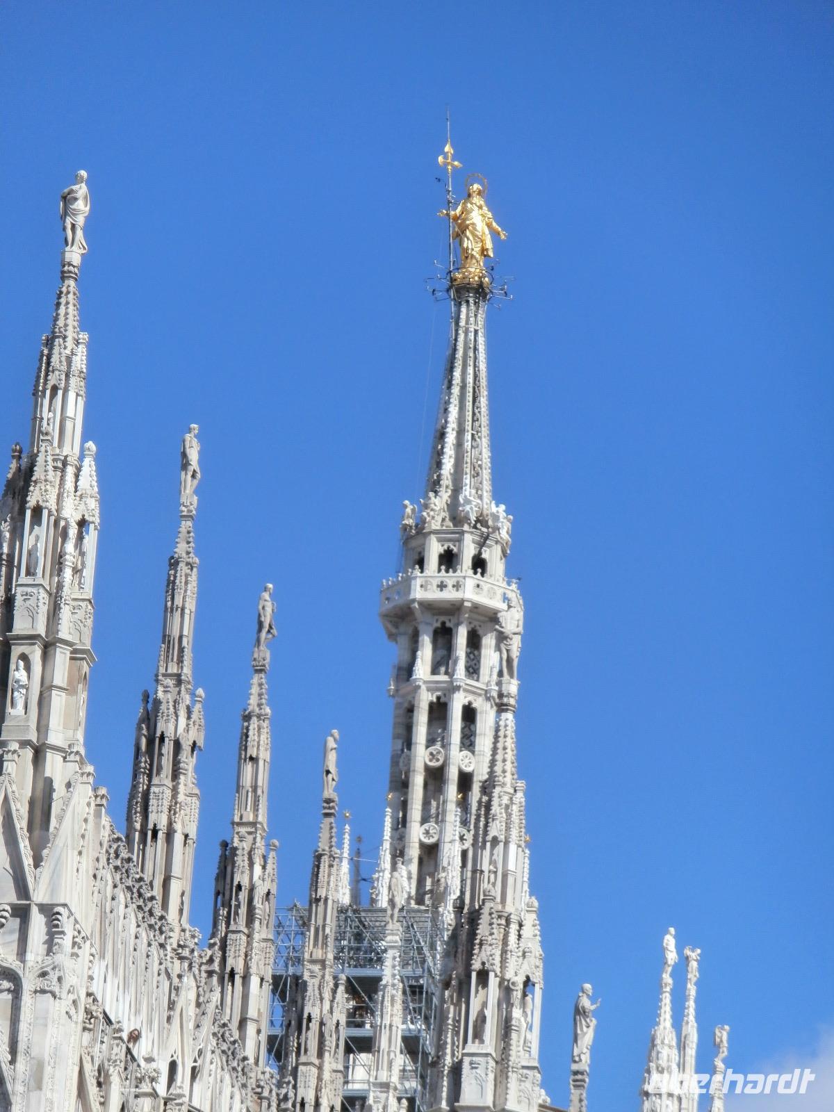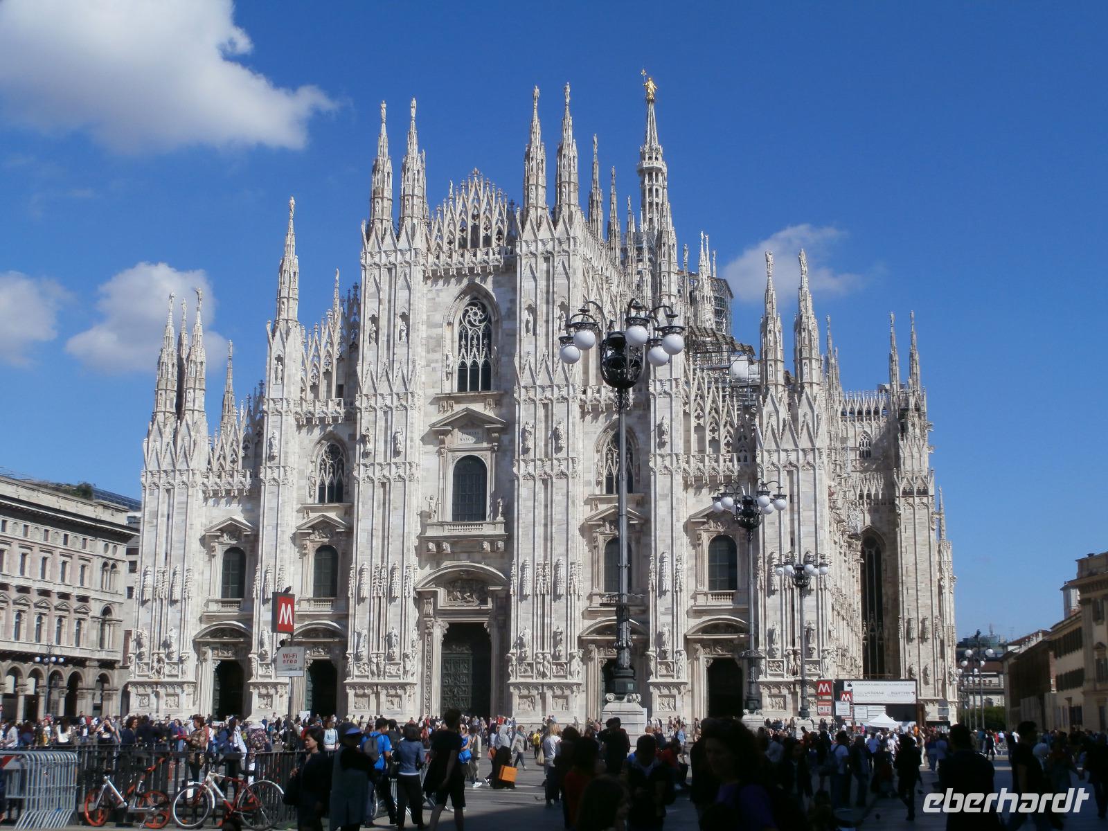 Verschiedene Radrennen in der Stadt machen eine Fahrt im Bus zum Zentrum unmöglich, deshalb nehmen wir die Straßenbahn bis hin zum Dom. Wie Zuckerbäckerwerk wirkt der Duomo, auf seinem Vierungsturm in 108 m Höhe wacht die vergoldete Marienstatue als Symbolfigur Mailands über das Wohl der Stadt. Bis Anfang des 16. JH war der Mailänder Dom die größte Kirche der Welt. Die Führung mit Mariarosa ist sehr informativ und die laufende Sonntagsmesse im Dom wir begleitet von Orgelspiel und Gesang. Der Himmel über uns ist heute azurblau, welch Wonne dieses herrliche Wetter. Wir spazieren gemeinsam durch die edle Galleria Vittorio Emanuele II., prächtig mit Mosaiken ausgestattet und teuren Geschäften. Unser Stadtrundgang endet am Piazza Della Scala, die Mailänder Scala ist der älteste im Original erhaltene Opernbau der Welt. Von außen etwas nüchtern das Bauwerk, begeistert die Scala mit einer prachtvollen Innenausstattung. Die Freizeit nutzen wir zum Shoppen in der Modestadt Mailand, zum Bummeln und Genießen im Sonnenschein.