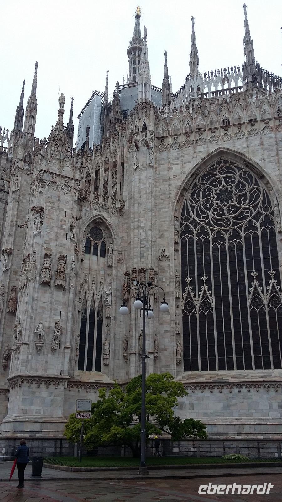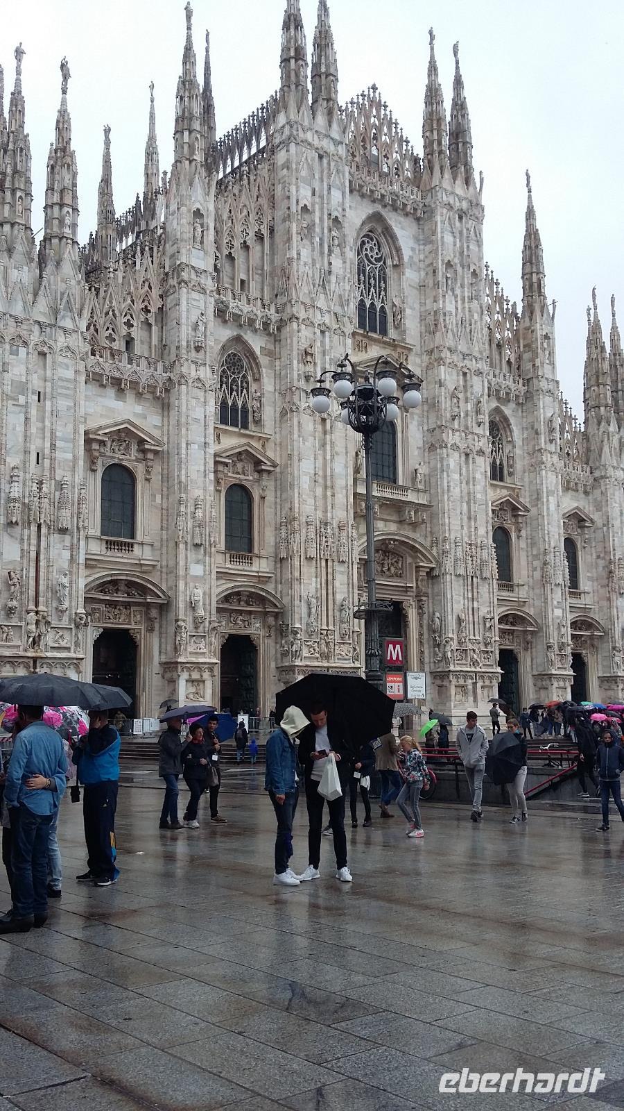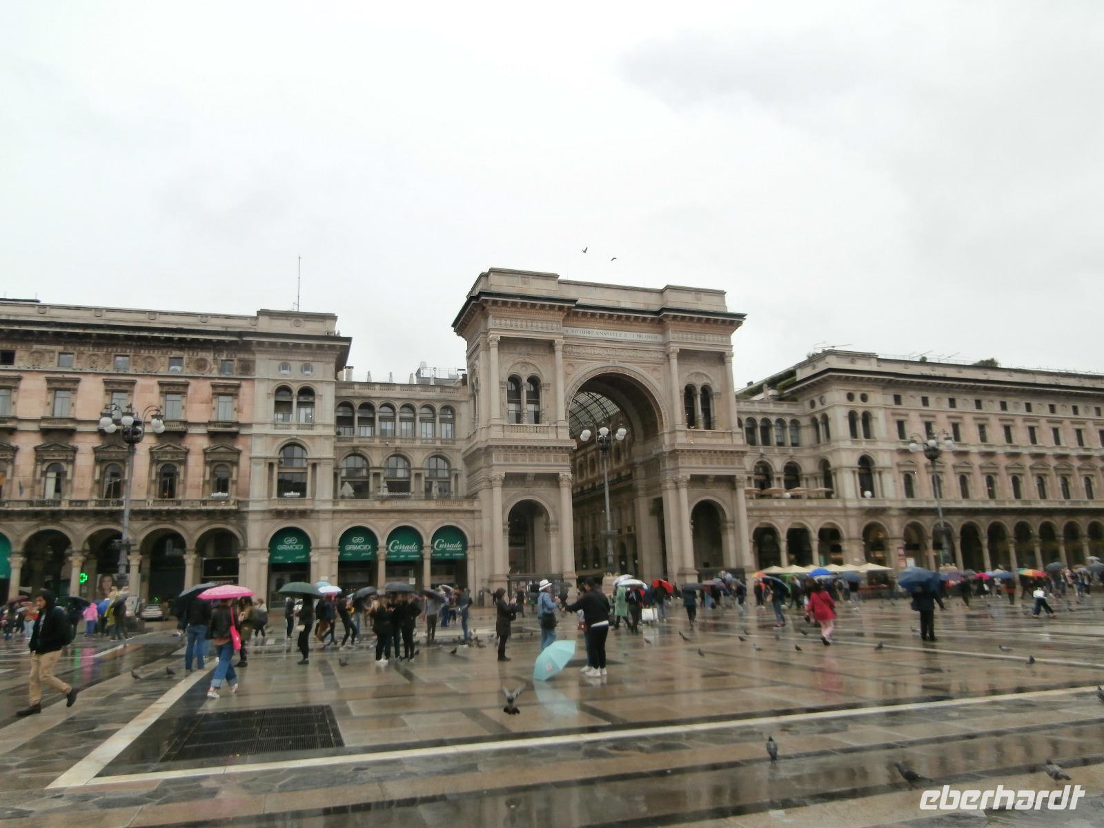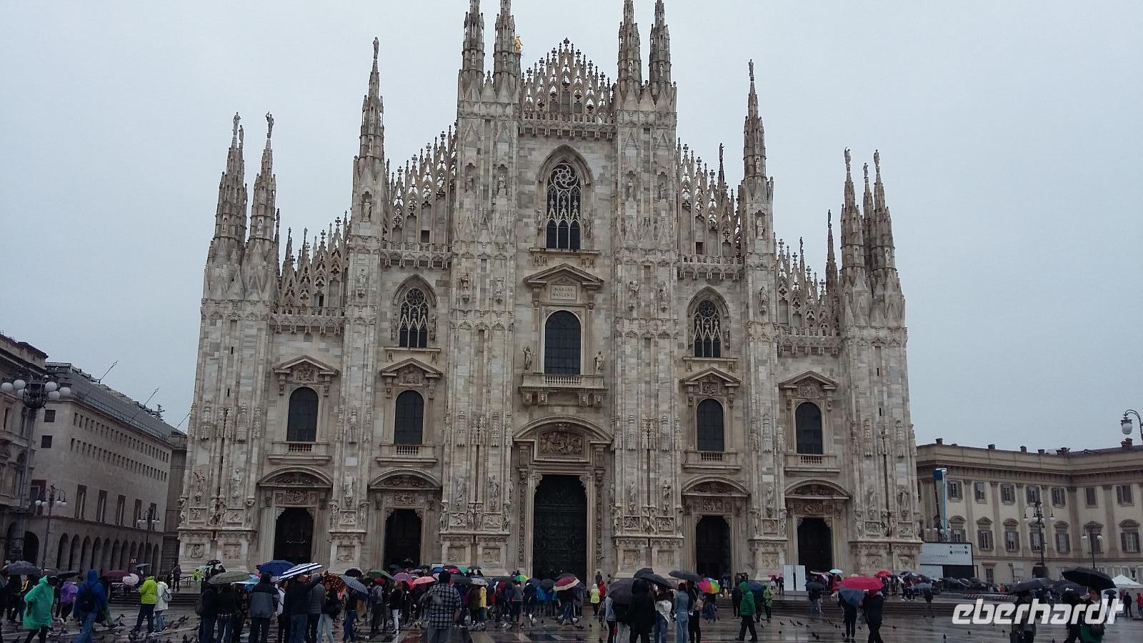Mit dem Bus starten wir bei Regen zur Stadtrundfahrt. Am Piazza Della Scala dürfen wir heute mit Fedra hinein zur Besichtigung der Scala, Fedra ist sehr verbunden mit dem Opernhaus und berichtet mit Begeisterung von den Aufführungen, die Mailänder Scala ist der älteste im Original erhaltene Opern Bau der Welt. Von außen etwas nüchtern das Bauwerk, begeistert die Scala mit einer prachtvollen Innenausstattung. Wir spazieren gemeinsam durch die edle Galleria Vittorio Emanuele II., prächtig mit Mosaiken ausgestattet und teuren Geschäften. Unser Stadtrundgang endet am Dom, wie Zuckerbäckerwerk wirkt der Duomo auf uns. Über seinem Vierungsturm in 108 m Höhe wacht die vergoldete Marienstatue als Symbolfigur Mailands über das Wohl der Stadt. Bis Anfang des 16. JH war der Mailänder Dom die größte Kirche der Welt. Bei viel Regen nutzen wir die Zeit zum Shoppen in der Modestadt Mailand und zum Bummeln in geschützten Laubengängen.