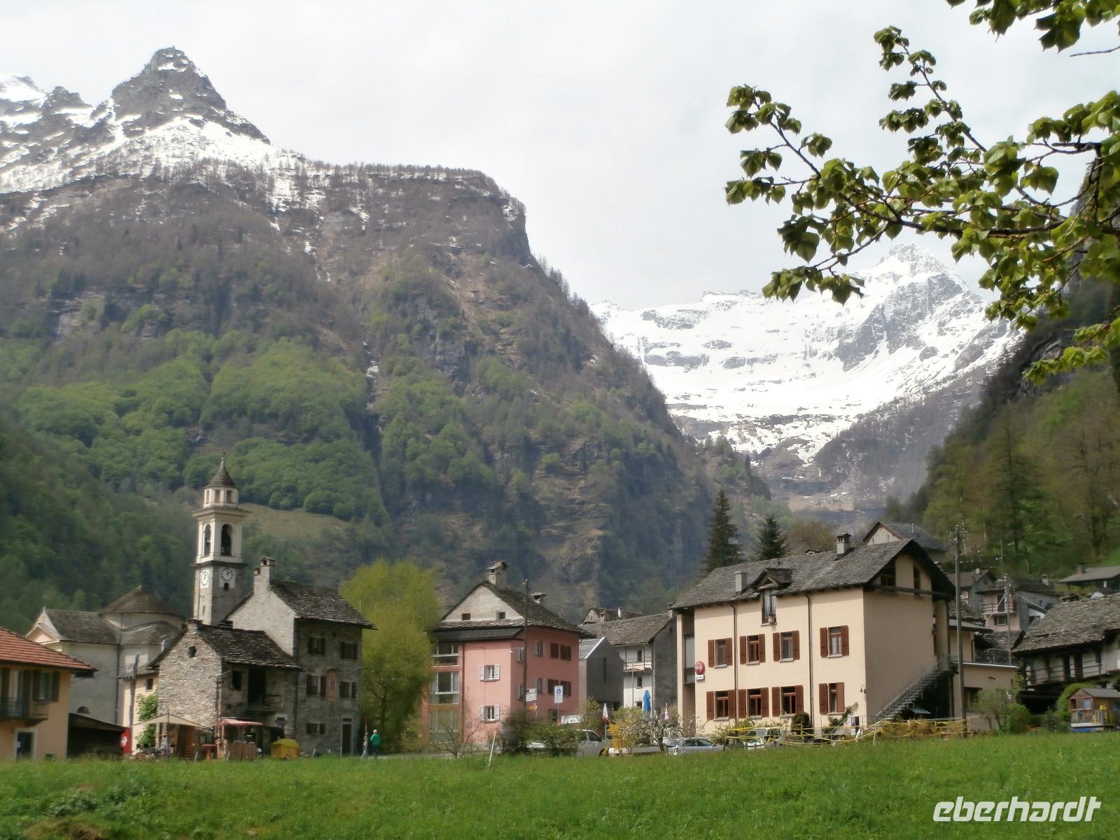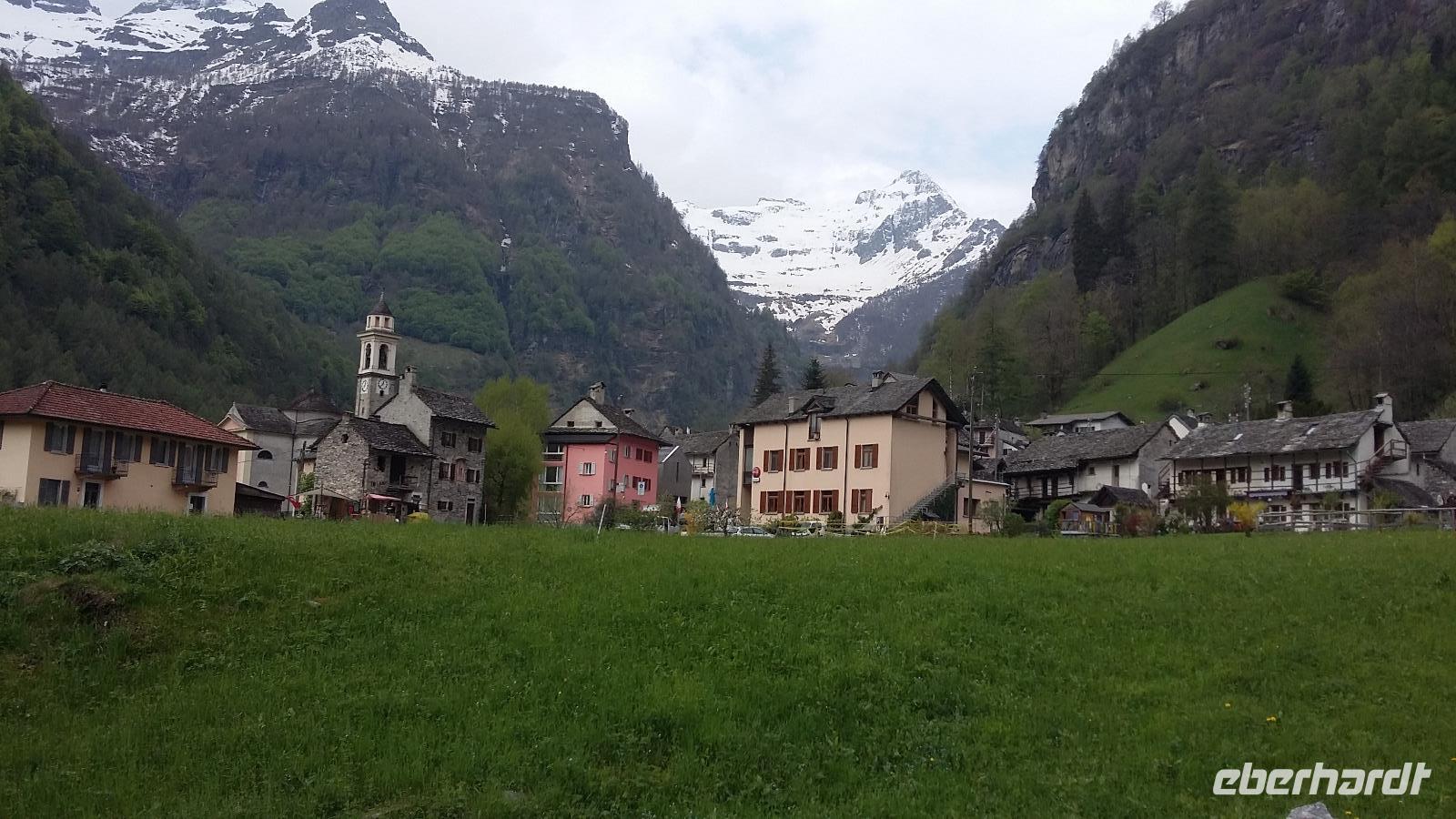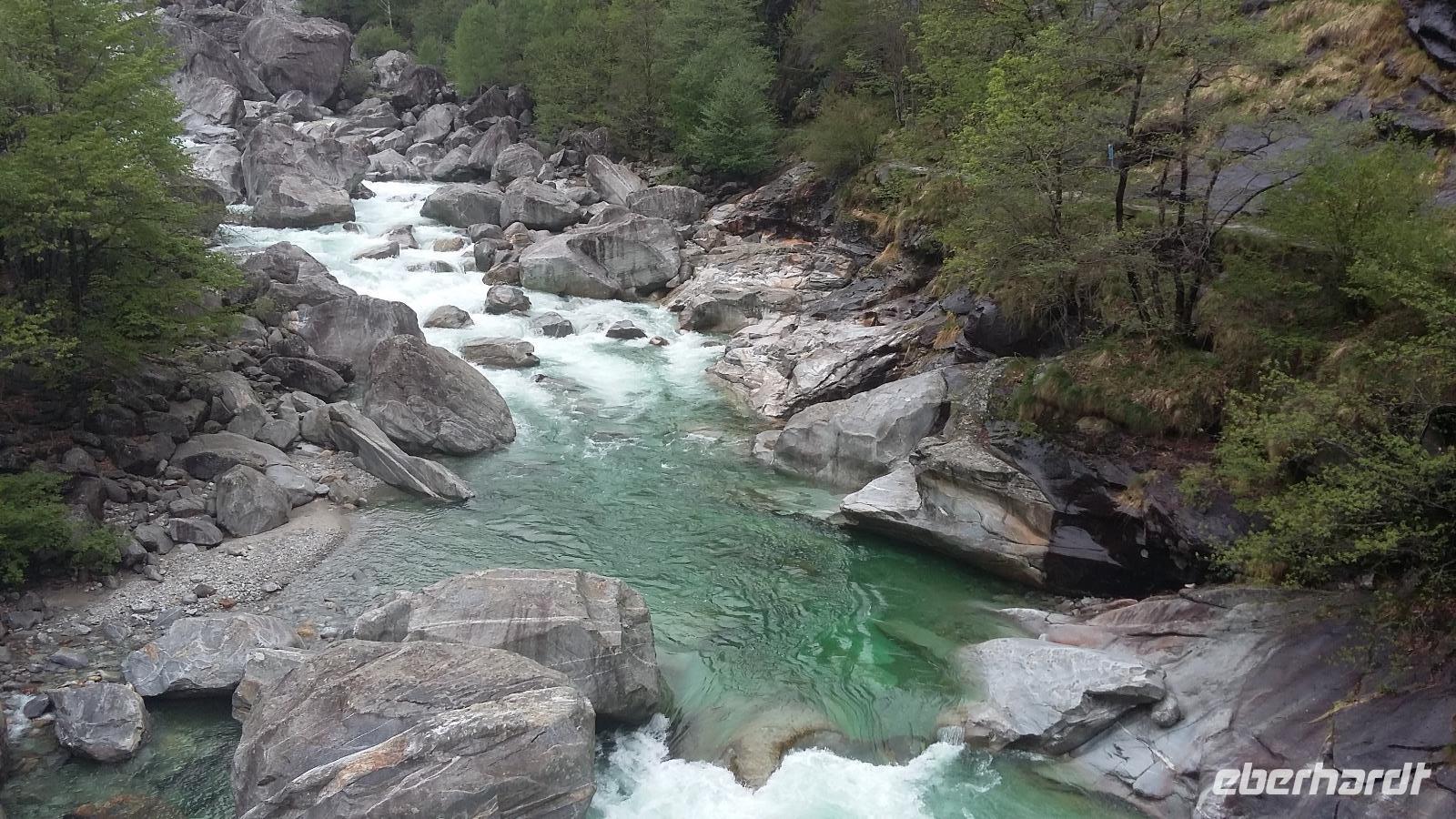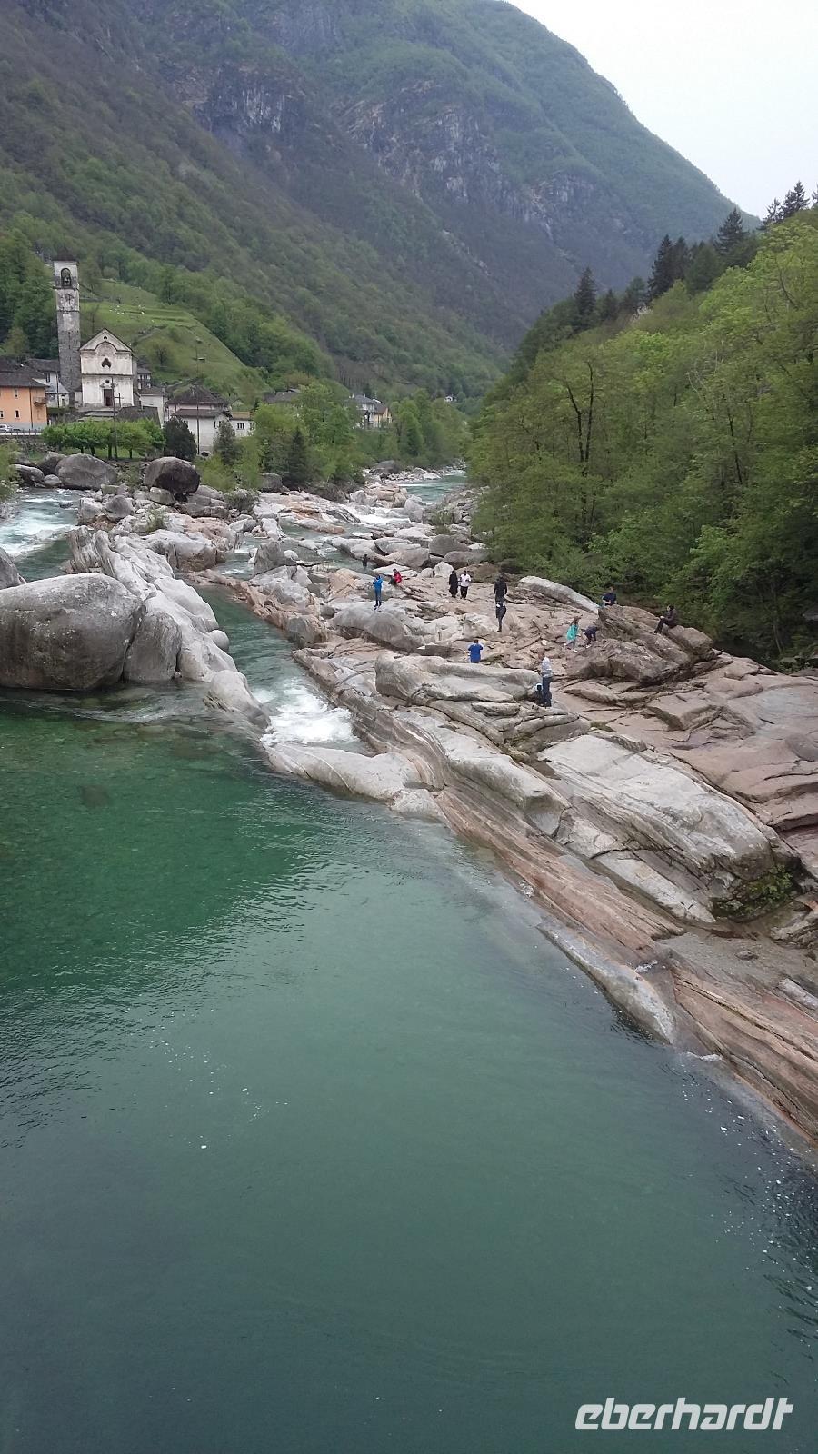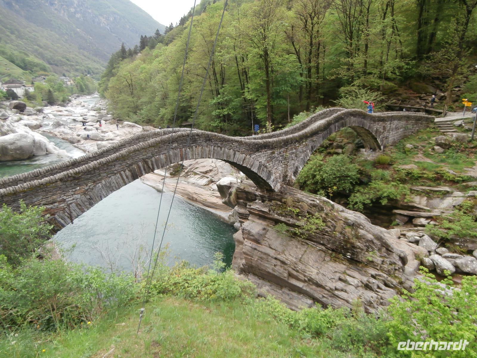 Entlang des Lago Maggiore fahren wir am Morgen, passieren die Schweizer Grenze und fahren an Ascona und Locarno vorbei in das fantastische Verzascatal, übersetzt auch das grüne Wasser und das sehen wir zwischen sehr großen Steinen, die das Wasser glatt und rund gehobelt hat, dahin fließen. Unseren ersten Stopp legen wir an der Staumauer „ La Selvatica" ein. Sie ist 220 Meter hoch und 380 m lang, wir spazieren auf ihr entlang. Von der Staumauer stürzte sich James Bond im Film „Golden Eye" in die Tiefe. Wir setzen unsere Fahrt im kurvenreichen Tal fort und der nächste Aufenthalt gilt dem Ort Sonogno auf 918 m Höhe, auch das letzte Dorf des Tales. Typische Häuser im gut erhaltenen Ortskern und die schöne Bepflanzung mit Frühlingsblumen begeistert uns alle. Zurück auf Fahrt im Verzascatal kommen wir an der römischen 2 Bogen Brücke „Ponte die Salti" an. Diese schöne mittelalterliche Brücke aus Stein ruht auf einem natürlichen Granitpfeiler.
