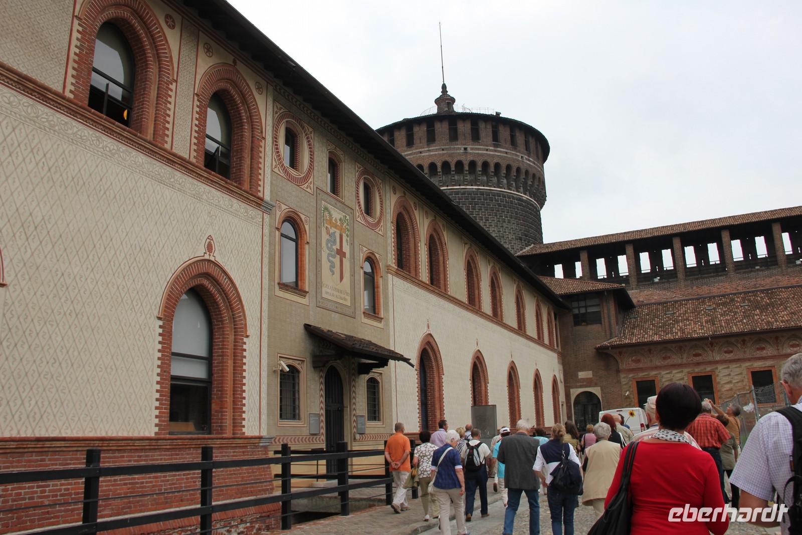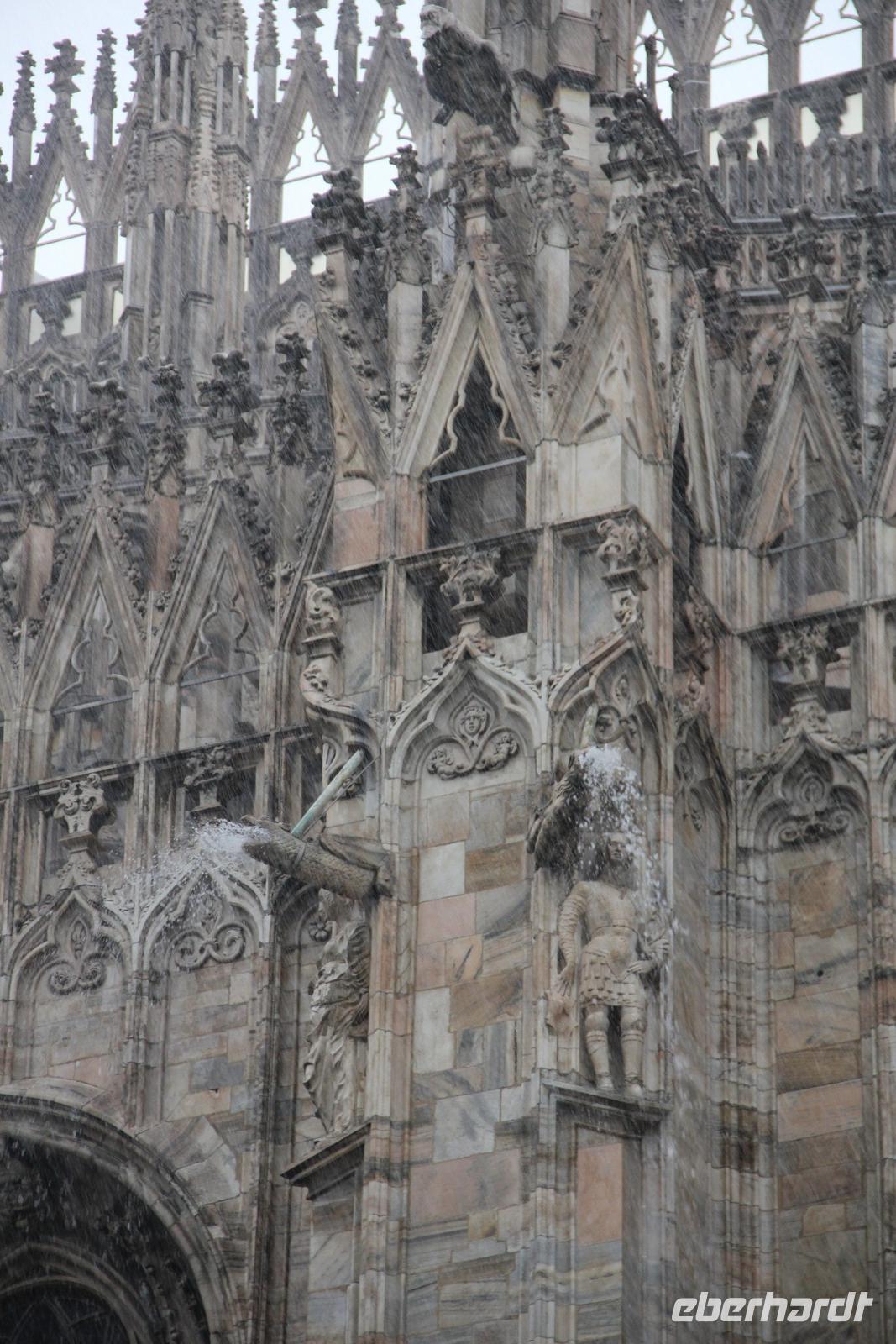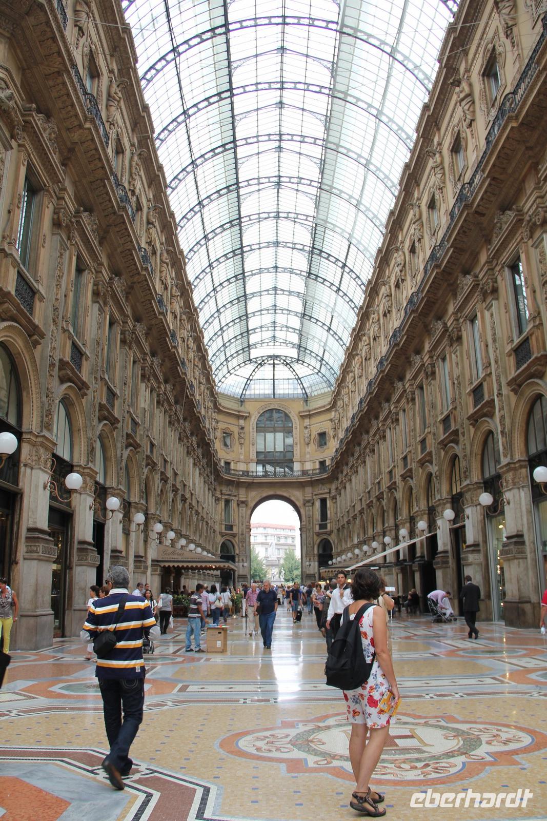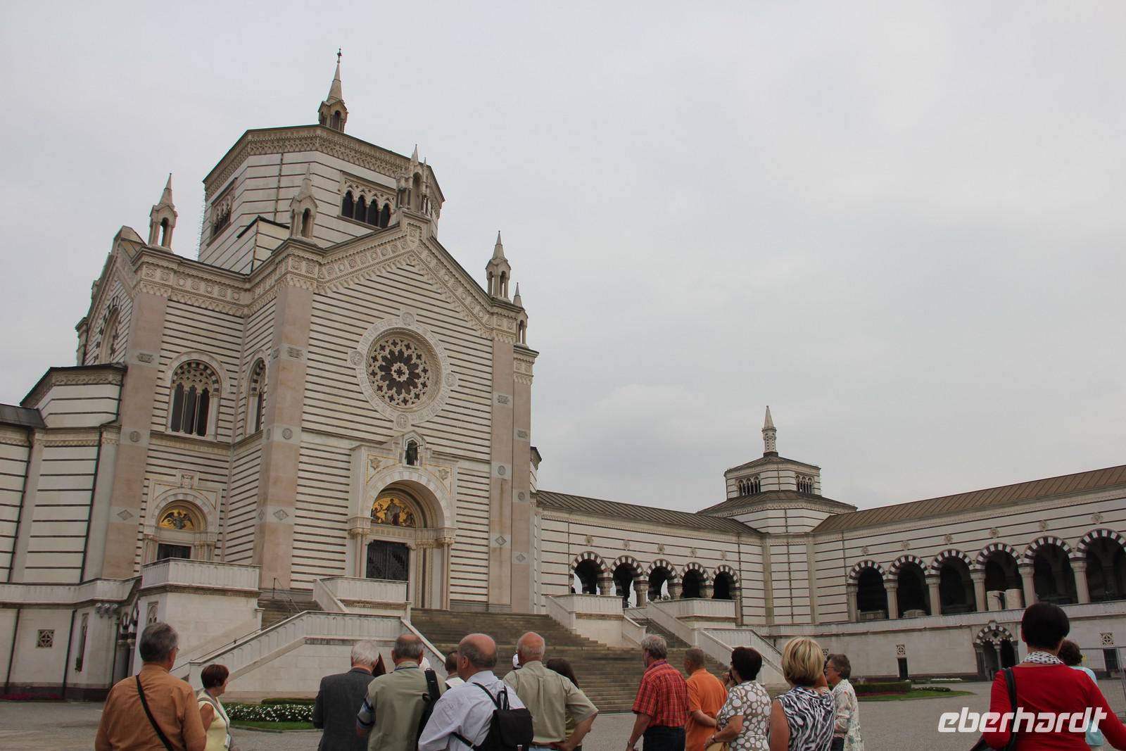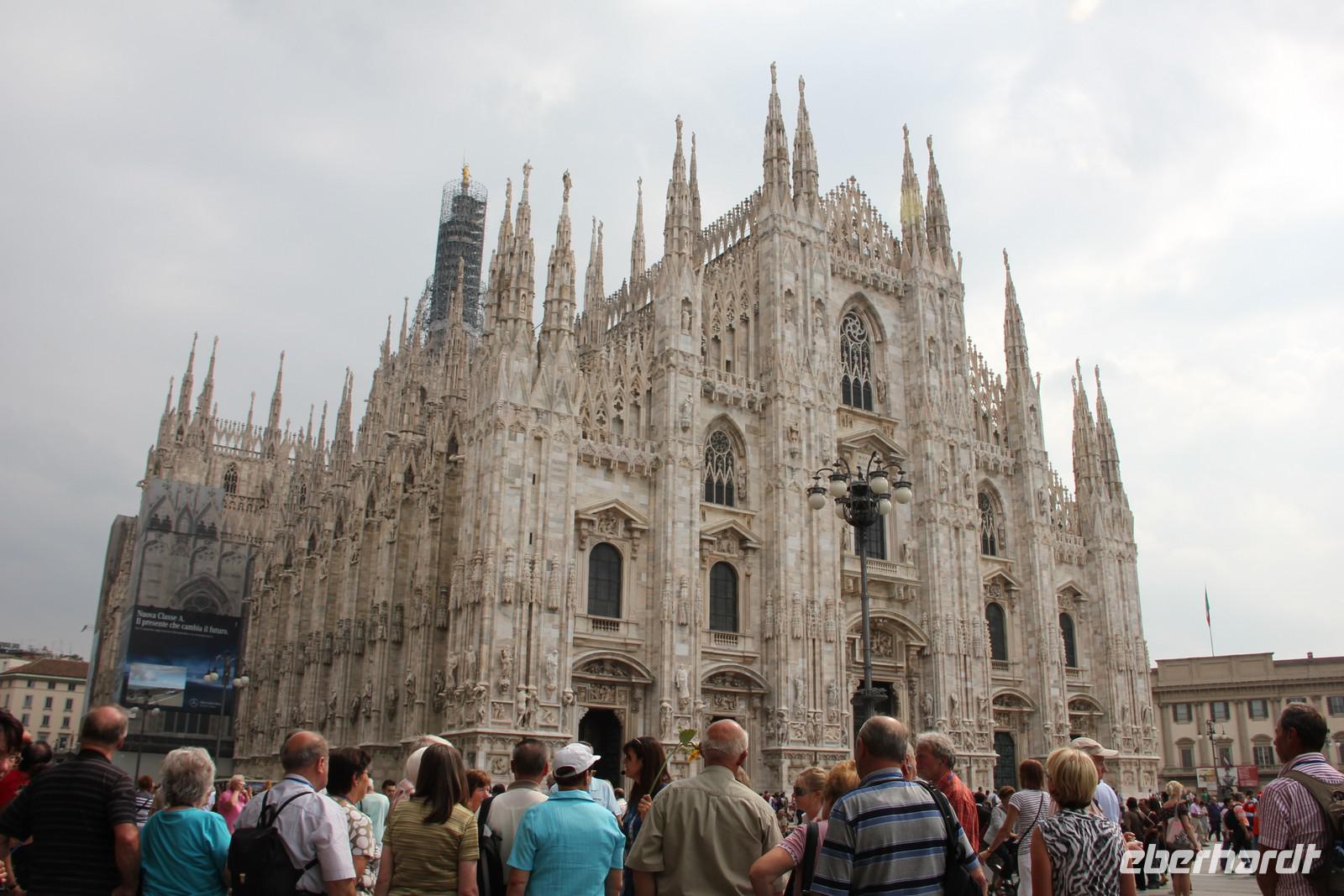 Mailand, das wirtschaftliche Zentrum des Landes, zweitgrößte Stadt nach Rom und ganz klar DIE Modemetropole Italiens. Ausgestattet mit Audio-Guides führte Freda uns durch Mailand. Als erstes sahen wir das Castello Sforzesco, welches eigentlich mal der Familie Visconti gehörte. Wir hörten und lernten einiges über diese beiden einflussreichen italienischen Familien, die auch eng mit der Familie Borromeo verbunden sind. Später fuhren wir auf den Monumentalfriedhof, welcher durch aufwändig vollzierte Grabmälern besticht. Hier auf diesem Friedhof werden nur die großen italienischen Familien mit Rang und Namen beerdigt und jede hat ihre eigene Grabstätte. Die bekannteste auf diesem Friedhof ist wohl die der Familie Campari. Das Grabmal stellt - wie es die Italiener gern sagen - „Den letzten Aperitif" dar, eine Art Abwandlung des letzten Abendmahls. Später ging es weiter in die Innenstadt zur Außenbesichtigung des Teatro alla Scala, dem berühmten Mailänder Theater. Gleich nebenan wartete auch schon die Galleria Vittorio Emanuele II (kurz: Galleria) auf uns, ein Kaufhaus der teureren Art. In diesem Kaufhaus befindet sich eine Fußbodenplatte mit dem Stier von Turin darauf. Man sagt, dass eim Glück wiederfährt, wenn man sich dreimal auf dem Stier dreht. Schließlich führte Freda uns vorbei am Campari-Café zum Dom, welcher den Abschluss unserer heutigen Stadtführung bildete. Danach hatten alle etwas Freizeit zum Besichtigen des Doms oder auch gern der Scala. Im Laufe des Tages fing es ziemlich stark an zu regnen, doch wir ließen uns davon nicht unter bekommen, schließlich gab es genug Schirmverkäufer, die das große Geschäft witterten und so wurden wir auch nicht nass! Zudem hatte der Regen noch einen Vorteil: die Wasserspeier des Mailänder Doms kamen voll zum Einsatz und waren wunderschön anzuschauen. Bei Sonnenschein waren sie uns gar nicht so aufgefallen und somit hatten wir ein Fotomotiv mehr. Am späten Nachmittag ging es dann wieder Richtung Stresa ins Hotel, wo am Abend wieder ein fantastisches Abendessen auf uns wartete.