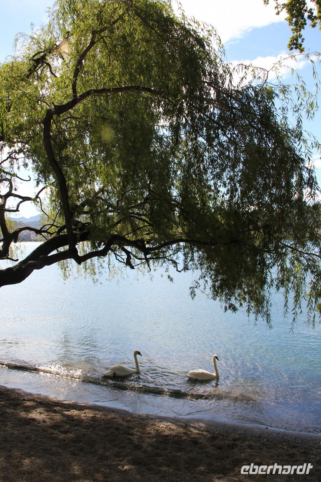 Nicht weit vom Lago Maggiore entfernt befindet sich der Comer See, unser heutiges Ziel. In Como angekommen unternahmen wir eine Bootsfahrt, bei der wir die Villen am Südufer des Comer Sees bestaunen durften. Zur Villa von Georg Clooney kamen wir zwar leider nicht, doch war es schon beeindruckend, was an diesem See alles für Villen gebaut wurden. Nach der Bootsfahrt ging es weiter ins Zentrum der kleinen Stadt. Jeder konnte selbst entscheiden, ob er sich den Dom ansehen wollte, lieber doch einen Cappuccino trinken geht oder sich einen Schal aus echter Comer Seide kaufen möchte. Da sich die Sonne an diesem Tag nur von ihrer besten Seite zeigte waren sich jedoch alle einig, dass ein „Gelato" nicht fehlen durfte und traf man sich in der Eisdiele wieder. Am Mittag ging es dann weiter nach Lugano in die Schweiz. Auch diese Stadt liegt an einem See, dem Luganer See. Hier merkte man bereits, dass man in der Schweiz war, auch wenn die Amtssprache Italienisch ist. Das Flair und die Leute waren ein wenig anders, als in Italien. So machten wir uns auf die kleine Stadt zu erkunden und unternahmen einen Spaziergang in den Stadtpark, der durch seine Lage direkt am See zum Verweilen einlädt. Andere machten eine kleine Fahrt mit der Bimmelbahn durch die Stadt und einige genehmigten sich auch hier noch ein Eis. Nachmittags fuhren wir dann zurück zum Lago Maggiore und machten unsere Drei-Seen-Fahrt perfekt.