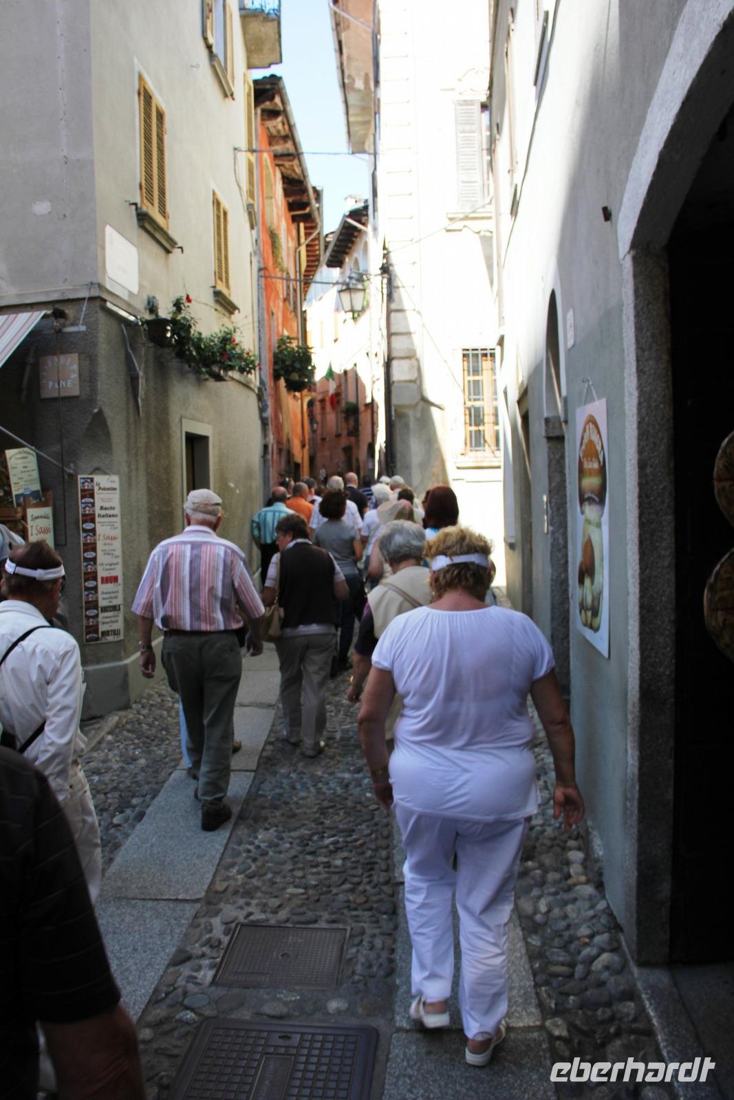 Heute war shoppen auf dem Wochenmarkt auf der anderen Seite des Borromäischen Golf angesagt. Auf dem Wochenmarkt in Intra-Verbania bekam man alles, was das Herz begehrt, von Haustieren über Kleidung bis hin zu bestem Käse und Parmaschinken. Nachdem sich alle auf dem Markt umgesehen hatten und einige noch einen Espresso oder Cappuccino in einem Café genossen ging unsere Fahrt weiter nach Orta San Giulio an den Ortasee. Dort angekommen fuhren wir nach dem Mittagessen mit einer kleinen Bimmelbahn auf die Piazza von Orta und unternahmen gemeinsam einen kleinen Stadtbummel und sahen uns in dem kleinen Örtchen um. Wir trafen auf einige Hochzeitspaare, denn hier in Orta ist es in zu heiraten und bei so schönen Wetter kamen die Bräute und ihre Ehemänner in Spe aus den Kirchen hinaus auf die Straßen, um Hochzeitsfotos zu schießen. Später fuhren wir auf die Isola San Giulio hinüber und besichtigten dort die beeindruckende Basilika di San Giulio. Nachdem wir den „Weg der Stille" beschritten hatten setzten wir mit einem Privatboot wieder über nach Orta. Bei einem Eisbecher genossen die meisten noch die Sonne und danach ging es wieder zurück ins Hotel nach Stresa auf die andere Seite von Monte Mottarone.