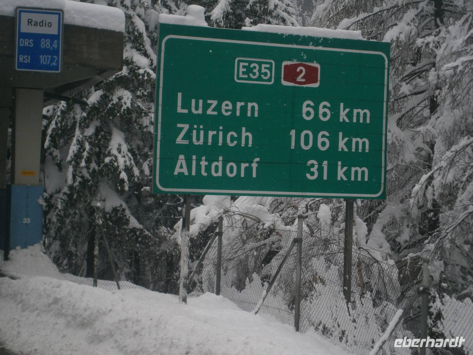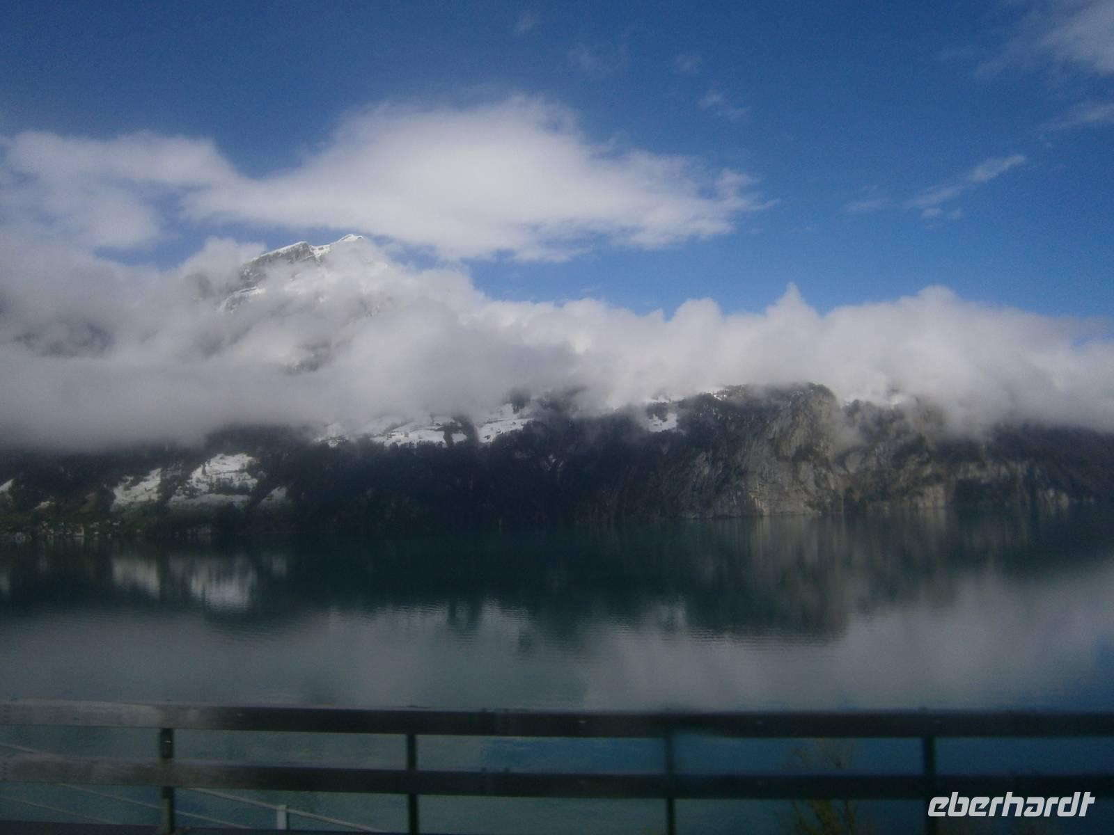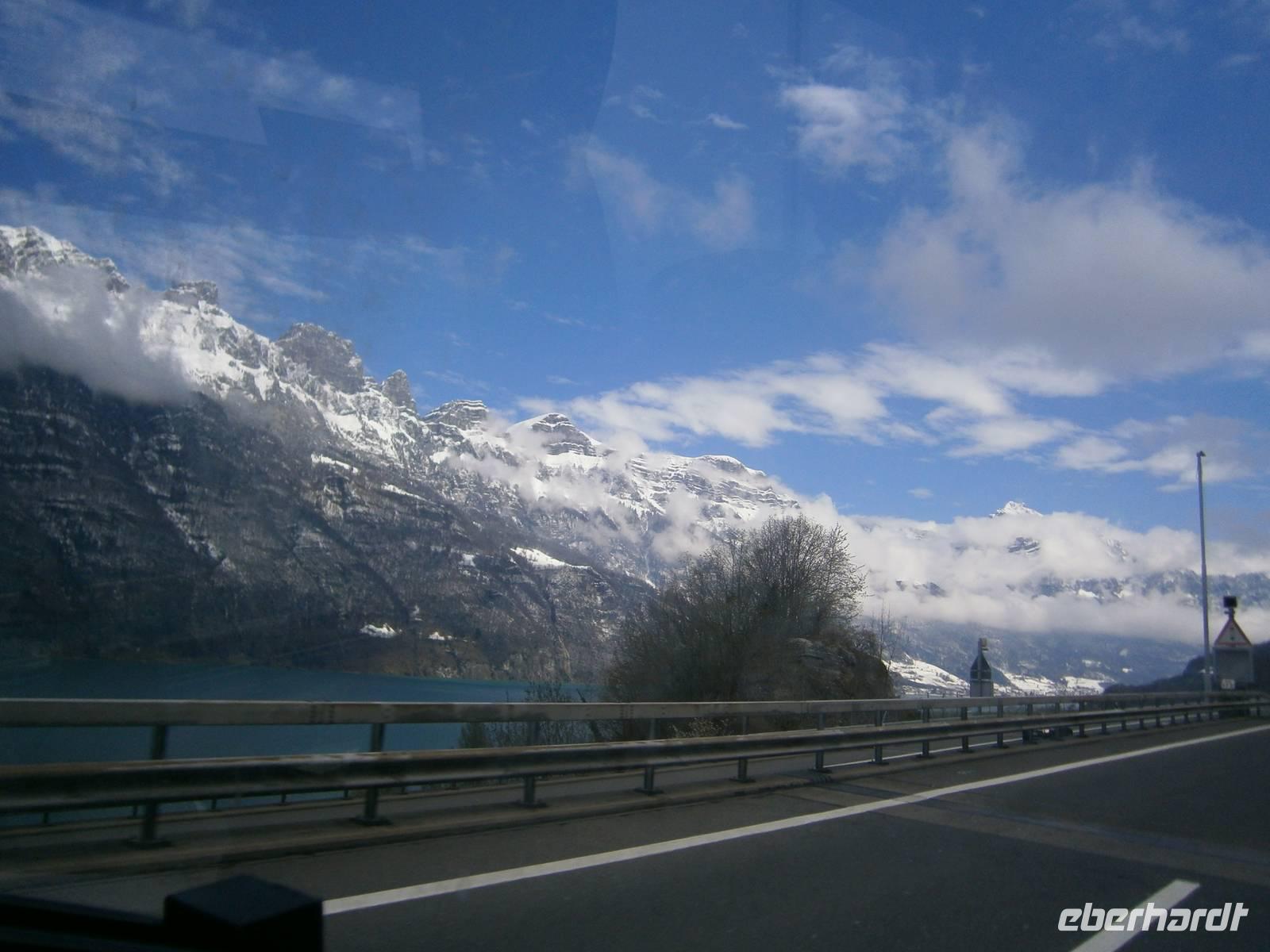 Am morgen unseres Heimreisetages hat es sich merklich abgekühlt. Auf den Berggipfeln hat es frisch geschneit. Auch die Alpenübergänge sind davon betroffen. Der San Bernadino Pass ist gesperrt. Fazit: Wir müssen wir unsere Route ändern und fahren über den Gotthardt Pass. Am Rückstau der LKW's vorbei, es müssen so an die 400 gewesen sein, erreichen wir die Passhöhe - auch hier Neuschnee. Vorbei am Vierwaldstätter See, durch die Stadt Schwyz, entlang am Walensee mit dem Bergpanorama auf die Churfirsten erreichen wir dann bei Sargans unsere „normale" Fahrstrecke wieder. Trotz des Umweges von ca. 60 km sind wir pünktlich an den entsprechenden Ausstiegstellen, wo wir uns, von unseren Reisegästen, verabschieden.