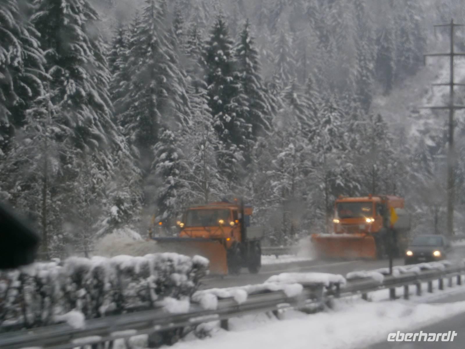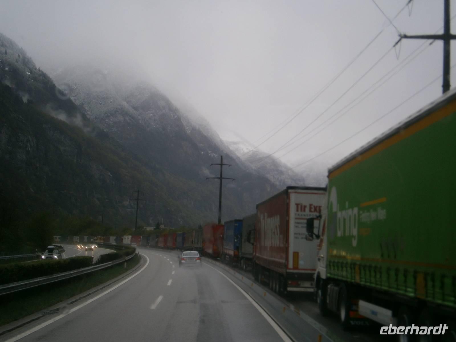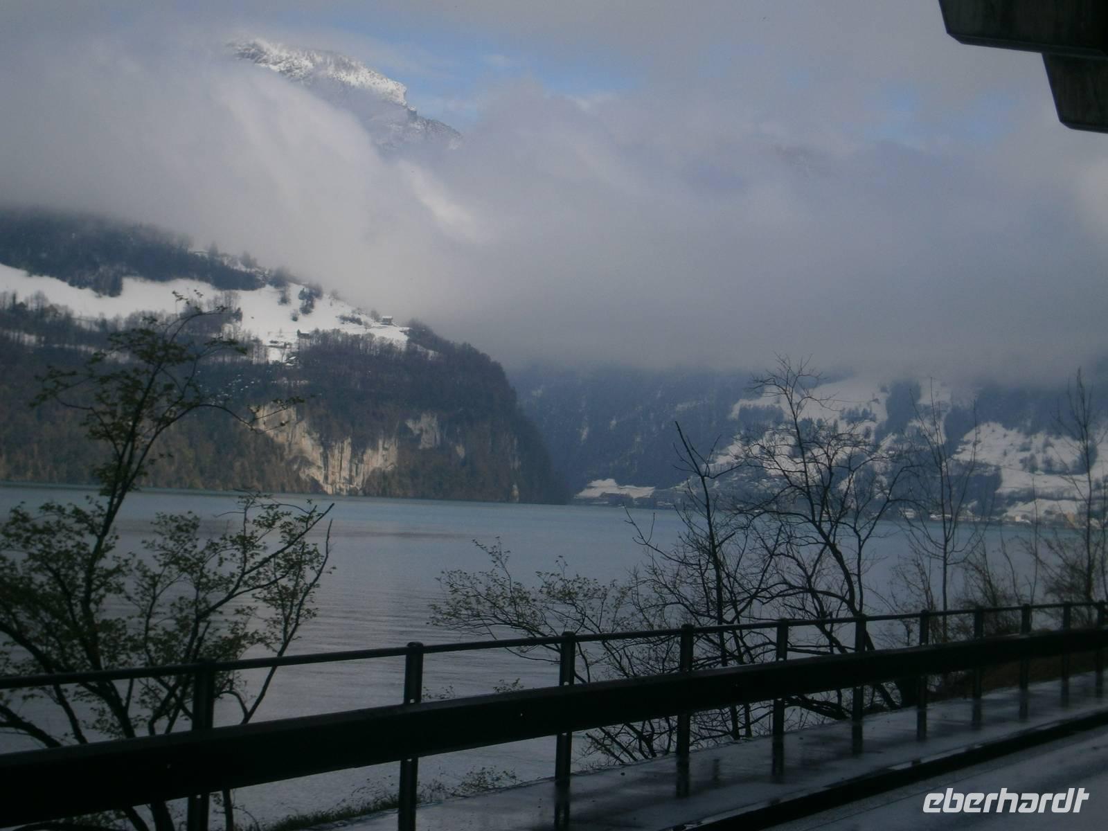 Am morgen unseres Heimreisetages hat es sich merklich abgekühlt. Auf den Berggipfeln hat es frisch geschneit. Auch die Alpenübergänge sind davon betroffen. Der San Bernadino Pass ist gesperrt. Fazit: Wir müssen wir unsere Route ändern und fahren über den Gotthardt Pass. Am Rückstau der LKW's vorbei, es müssen so an die 400 gewesen sein, erreichen wir die Passhöhe - auch hier Neuschnee. Vorbei am Vierwaldstätter See, durch die Stadt Schwyz, entlang am Walensee mit dem Bergpanorama auf die Churfirsten erreichen wir dann bei Sargans unsere „normale" Fahrstrecke wieder. Trotz des Umweges von ca. 60 km sind wir pünktlich an den entsprechenden Ausstiegstellen, wo wir uns, von unseren Reisegästen, verabschieden.