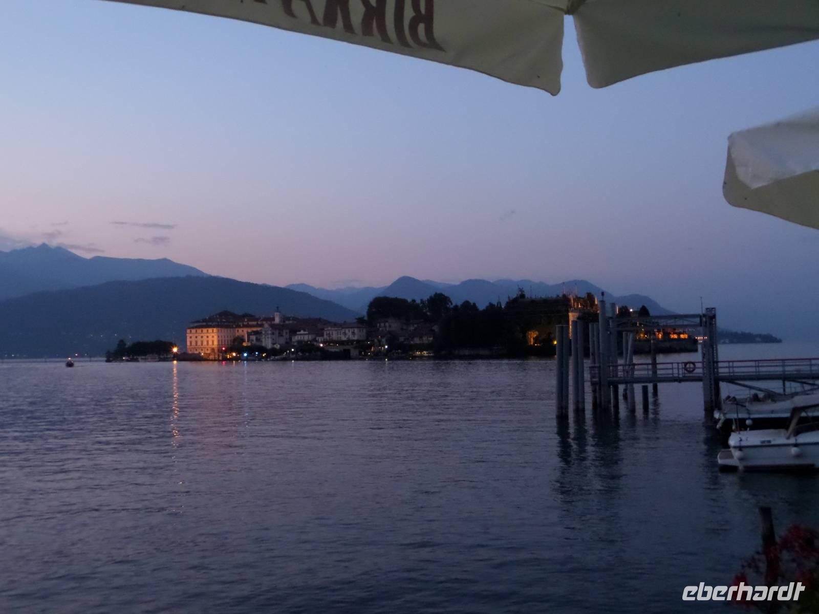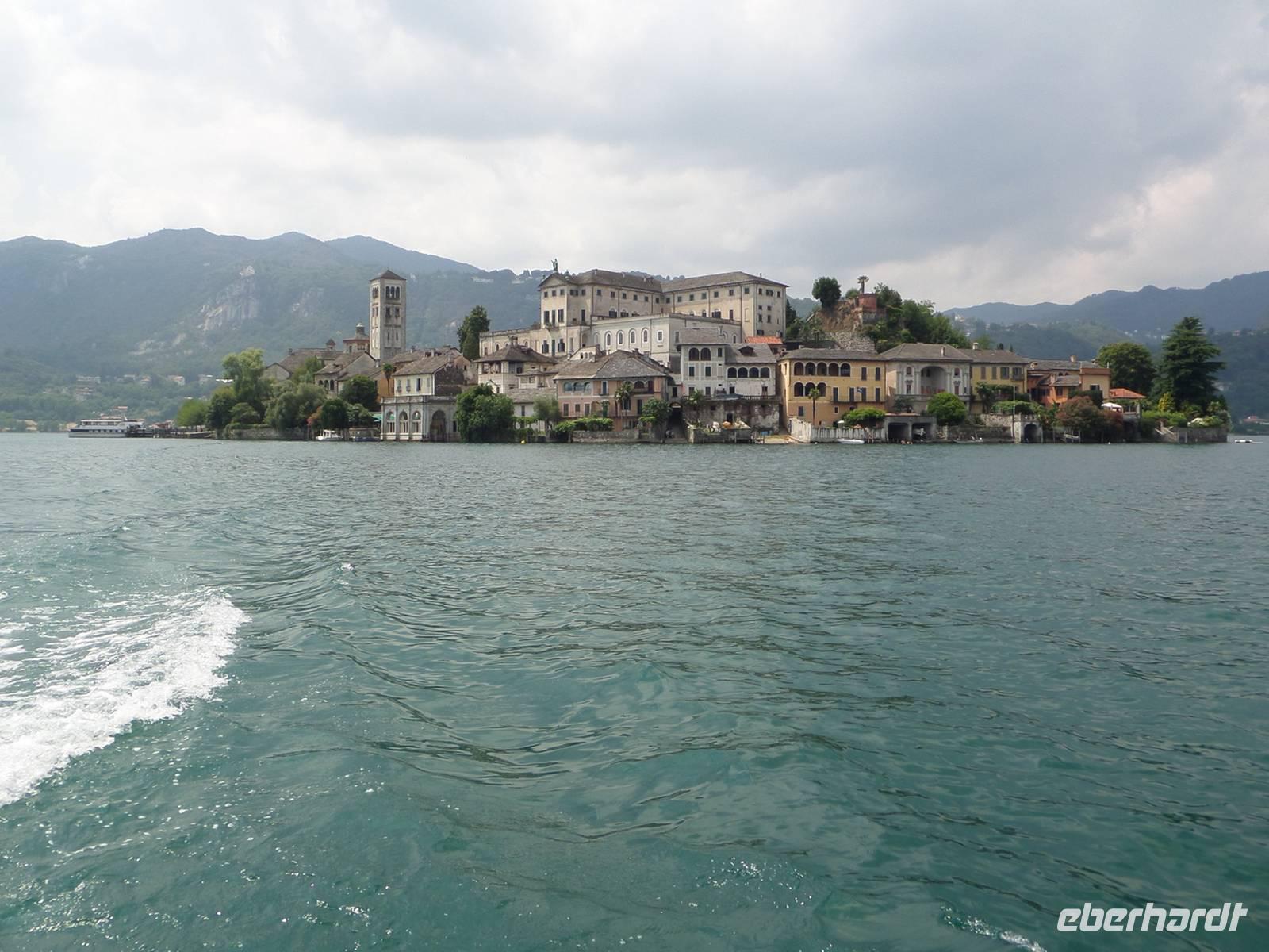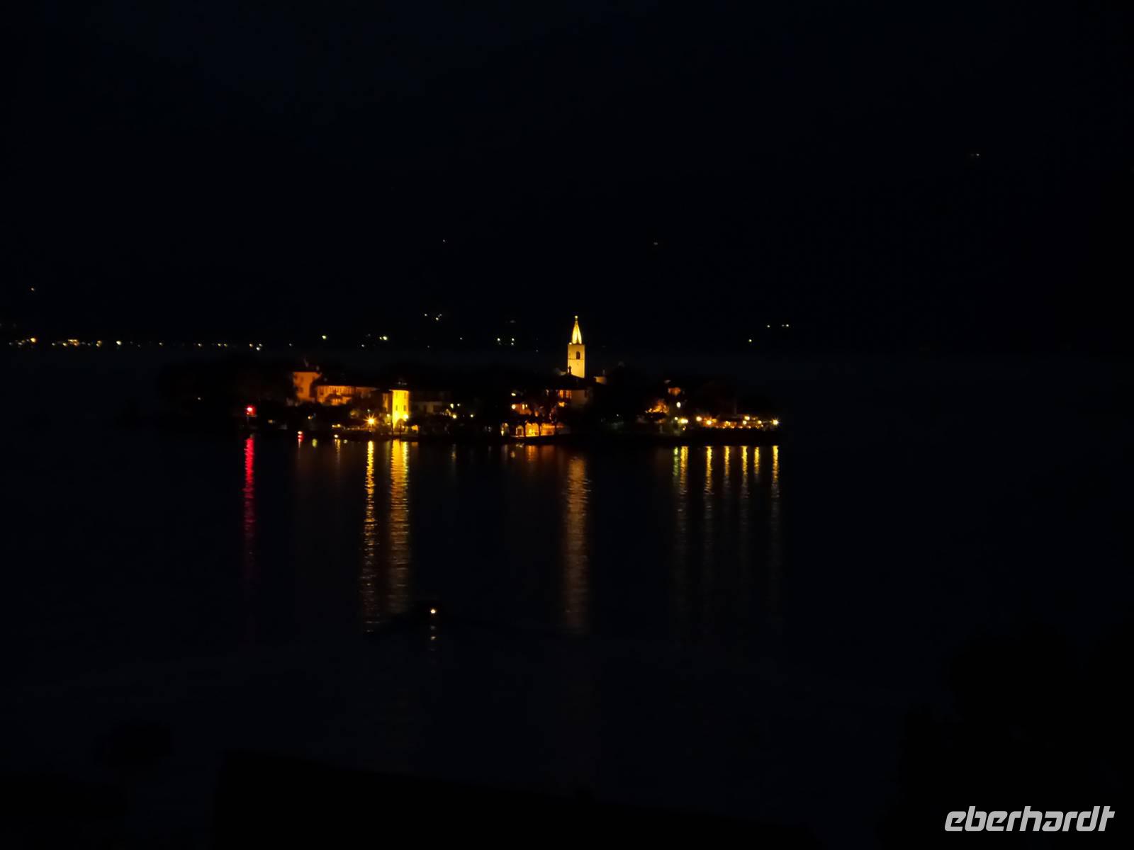 Mittags fahren wir zum Ortasee und mit einer kleinen für uns bestellten Bahn ins Städtchen, ein romantischer Ort! Vorher gibt es wieder Würstchen, wer noch nichts gefunden hat... Ein Boot bringt uns sofort zur kleinen Insel San Giulio, benannt nach dem griechischen Diakon Julius, der hier am Ende des 4. Jahrhunderts lebte und eine kleine Kirche errichtete. Die Silhouette der Insel wird heute beherrscht vom mächtigen ehemaligen Bischofspalast und von der Basilika. Man kann nur auf einen vorgegebenen Rundweg in ca 15 Minuten über die Insel spazieren. Dann ist Zeit, Orta zu erkunden, ein letzter Eisbecher oder Cappuccino ... Mit der Bahn geht es 16 Uhr zurück zum Bus und ins Hotel. Am Abend fahren wir zum Abschluss dieser schönen Eberhardt-Reise mit dem Schiff zum Abendessen hinüber zur Isola Pescatori. Vorher umrunden wir noch die Insel. Es wird ein schöner Abend mit leckerem Essen und Getränken. Nun noch schnell die Koffer packen - und die schönen Erinnerungen an unsere Reise an den Lago Maggiore kommen mit hinein!