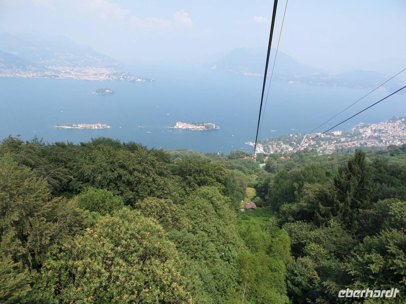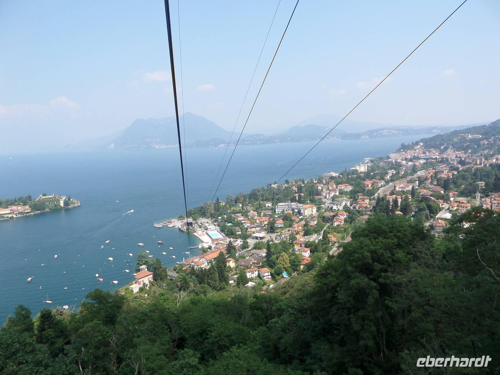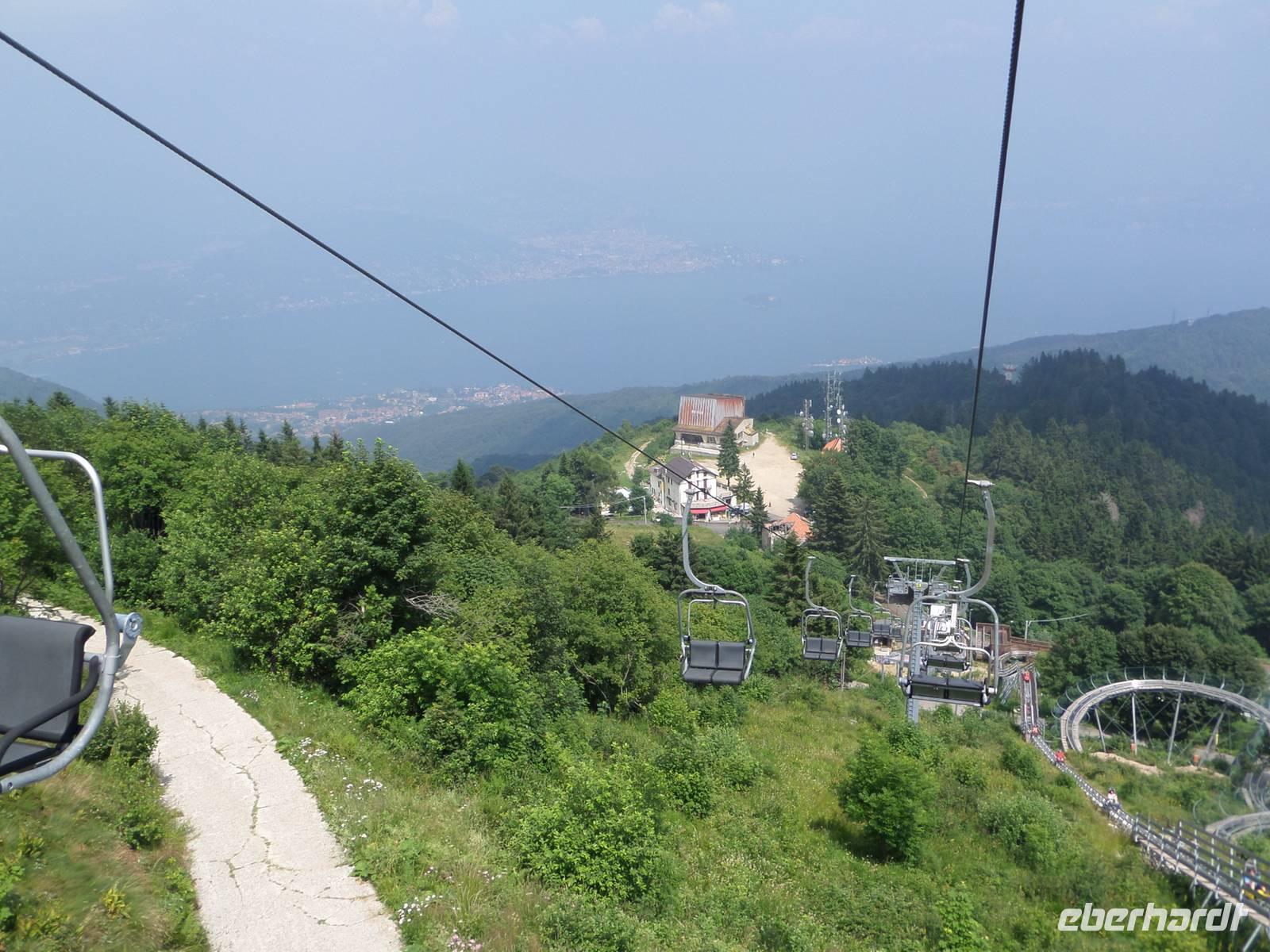 Der 1.491 Meter hohe Monte Mottarone ist der Hausberg von Stresa. Nur wenige Minuten sind es bis zur Seilbahn. Heute fahren wir mit Petra auf den Berg. Mit der Kabinenbahn geht es bis auf 1385 m und weiter mit dem Sessellift zum Gipfel. Da noch andere Gäste anstehen, fahren wir in zwei Gruppen ab 9.30 Uhr nach oben. Wir genießen die Seeblicke schon aus der Kabinenbahn. An der Mittelstation in 803 m Höhe müssen wir umsteigen und statten zuerst dem Alpino Garten mit mehr als 1000 Pflanzen einen Besuch ab. Allerdings hält sich die Blütenvielfalt in Grenzen, so dass wir uns nicht zu lange aufhalten und zur zweiten Etappe starten. Weiter geht es dann noch bis zum Gipfel mit dem Sessellift. Leider ist von der gepriesenen Aussicht auf sieben Seen und die Monte Rosa Gruppe nicht viel zu sehen. Wir können nur Lago Maggiore und Ortasee erkennen. Die Sonne scheint und einige Gäste unternehmen eine der vielen Wanderungen, die hier oben möglich sind. Es herrschen angenehme Temperaturen, denn unten am See sind über 30 Grad. Auch Rodeln macht Spaß. Andere genießen den Nachmittag am See.