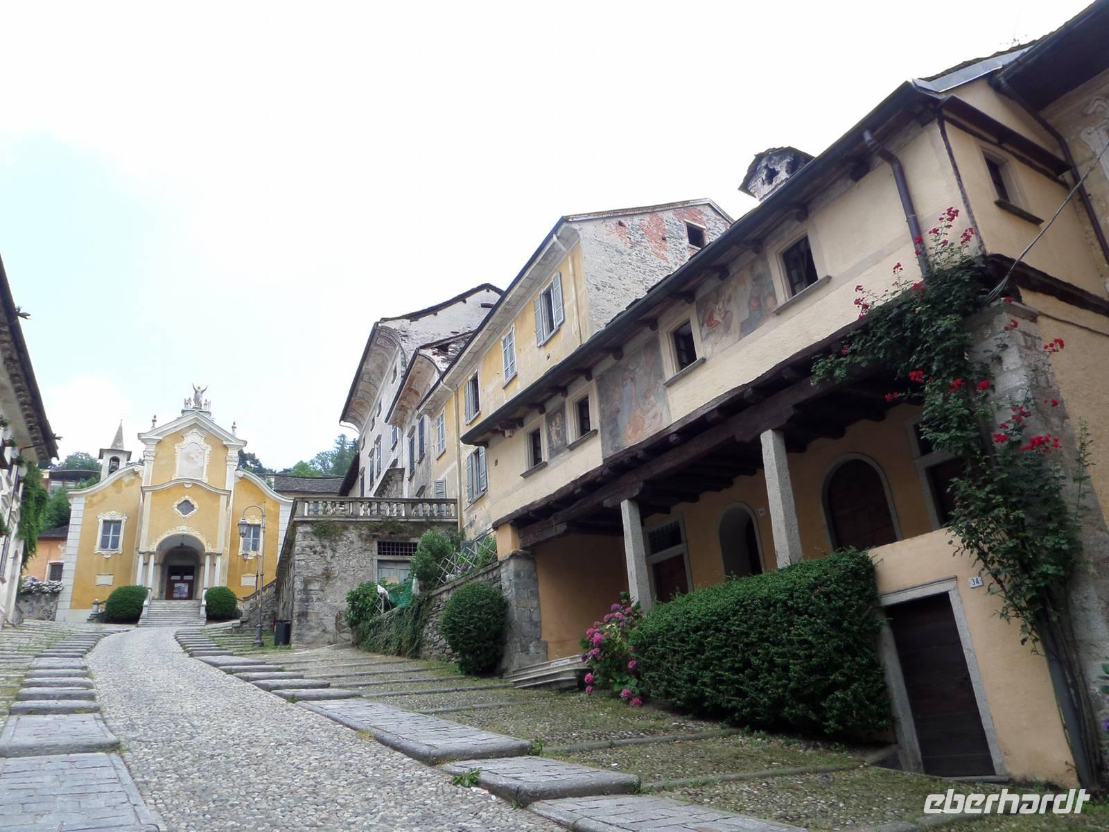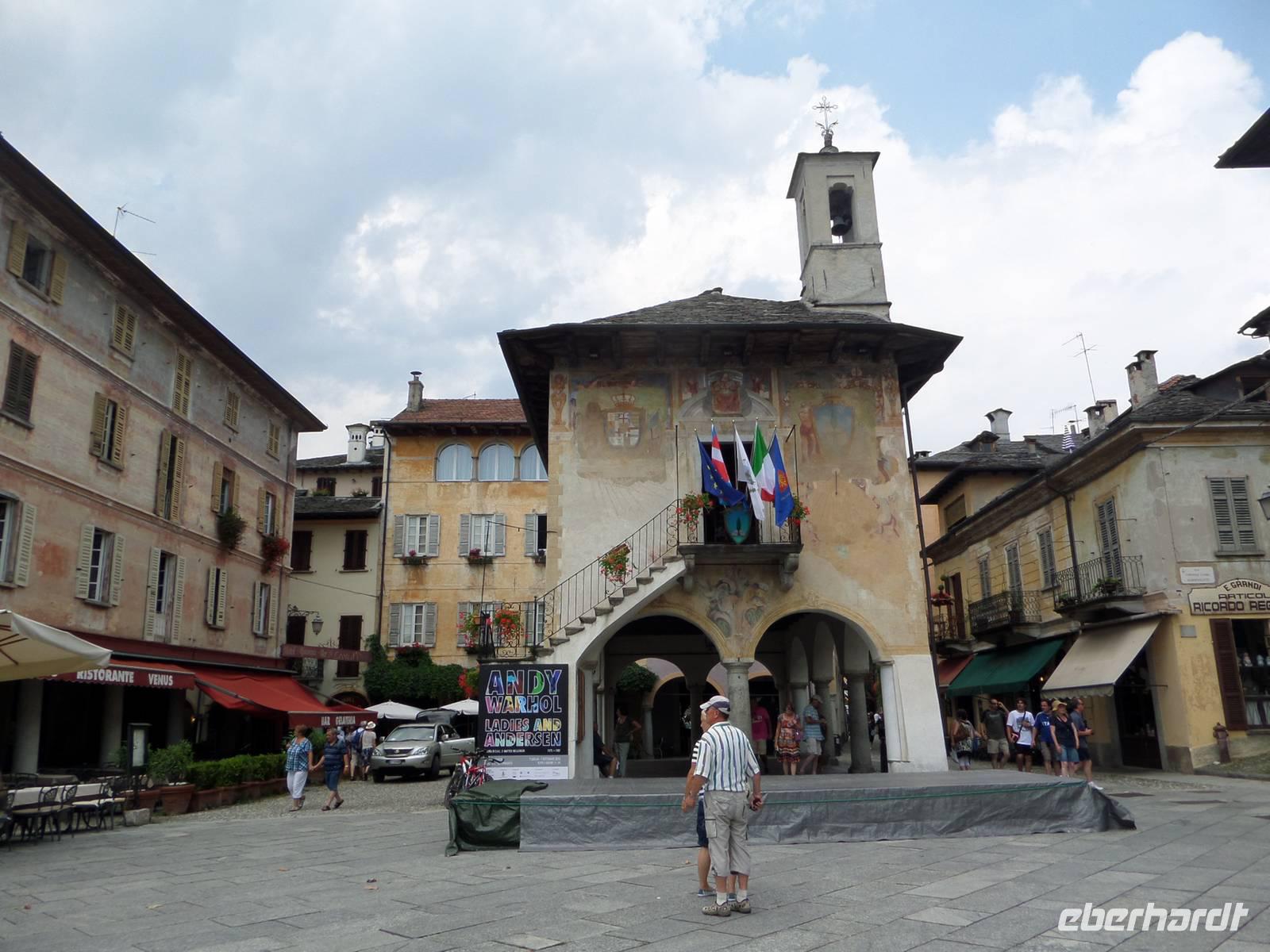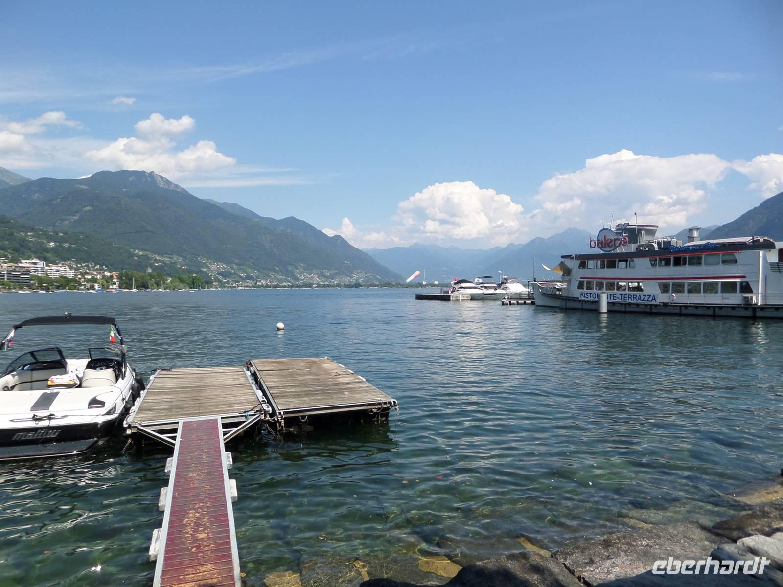 Sie verbindet die Strecke der Gotthardbahn mit der Bahnlinie durch den Simplon. Auf halbem Wege besuchen wir im bekannten Wallfahrtsort Re den gigantischen Bau der Wallfahrtskirche Madonna del Sangue, der Blutmadonna, aus dem 16. Jahrhundert. Sie erinnert an ein Wunder von 1494. Das Madonnenbild soll nach einem Steinwurf 20 Tage lang blutige Tränen geweint haben. Herbeigeeilten geschahen Wunder. Nach einer kurzen Besichtigung und einem kleinen Mittagsimbiss fahren wir mit der nächsten Bahn weiter in die Schweiz nach Locarno! Dort lädt uns Petra zu einer Zahnradbahn-Fahrt zur bekannten Wallfahrtskirche Madonna del Sasso ein. Aber nur die Hälfte der Gäste möchte die herrliche Aussicht über den See genießen. Es ist aber auch sehr heiß. Viele spazieren lieber auf die Promenade am See, um im Schatten zu ruhen. Oder zur Pizza Grande, der Mittelpunkt der Altstadt, wo schon die Vorbereitungen für das Filmfestival im Gange sind. Kleine Gassen laden auch noch zum Entdecken ein, und natürlich die tollen Geschäfte zum Einkaufen.